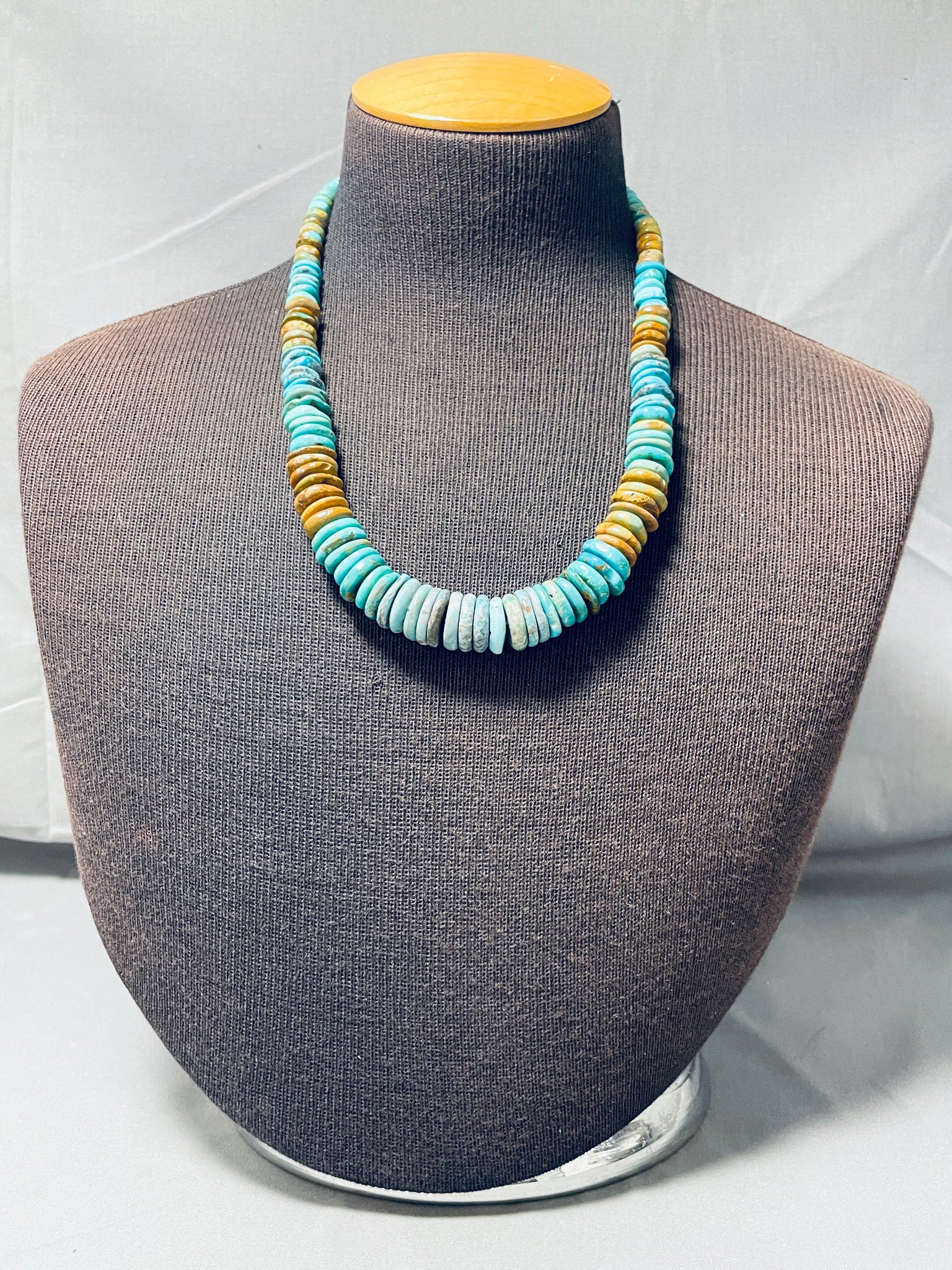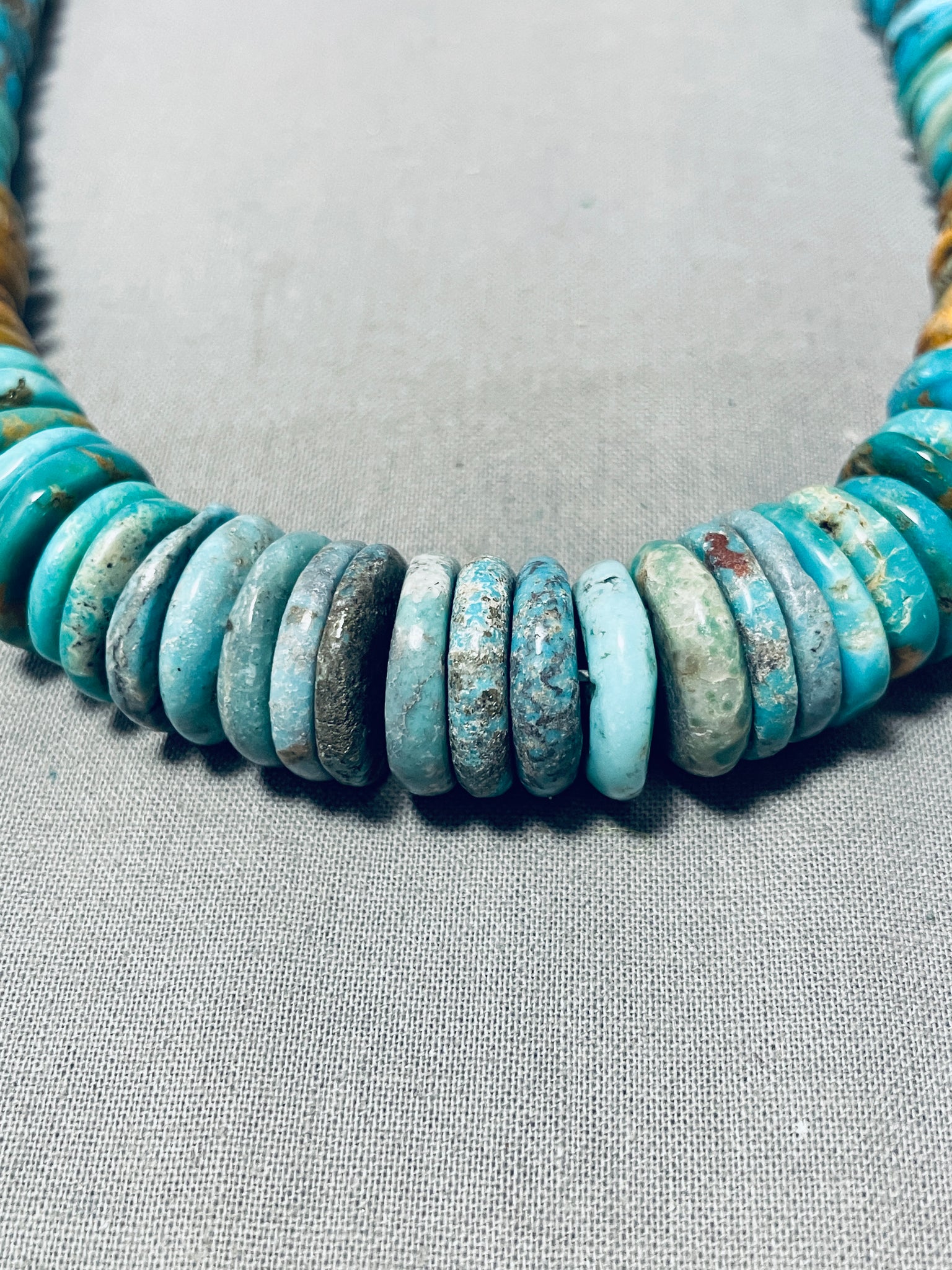 This is a fabulous Navajo large graduating turquoise stone silver necklace. This amazing necklace contains a mind blowing plethora of hand cut disc shaped turquoise stones that wonderfully graduate in size towards the bottom. The smallest stones measure around 1/4" in diameter while the largest stone measures around 5/8" in diameter. The stones appear to be from the incredible Royston, Blue Gem and Sleeping Beauty turquoise mines. This necklace contains an outstanding large traditional silver clasp. The necklace can be adjusted in length slightly with the shortest measuring around 15" and the longest measuring around 17". Sterling silver. Cir. 1970's+. Sturdy 88 grams.