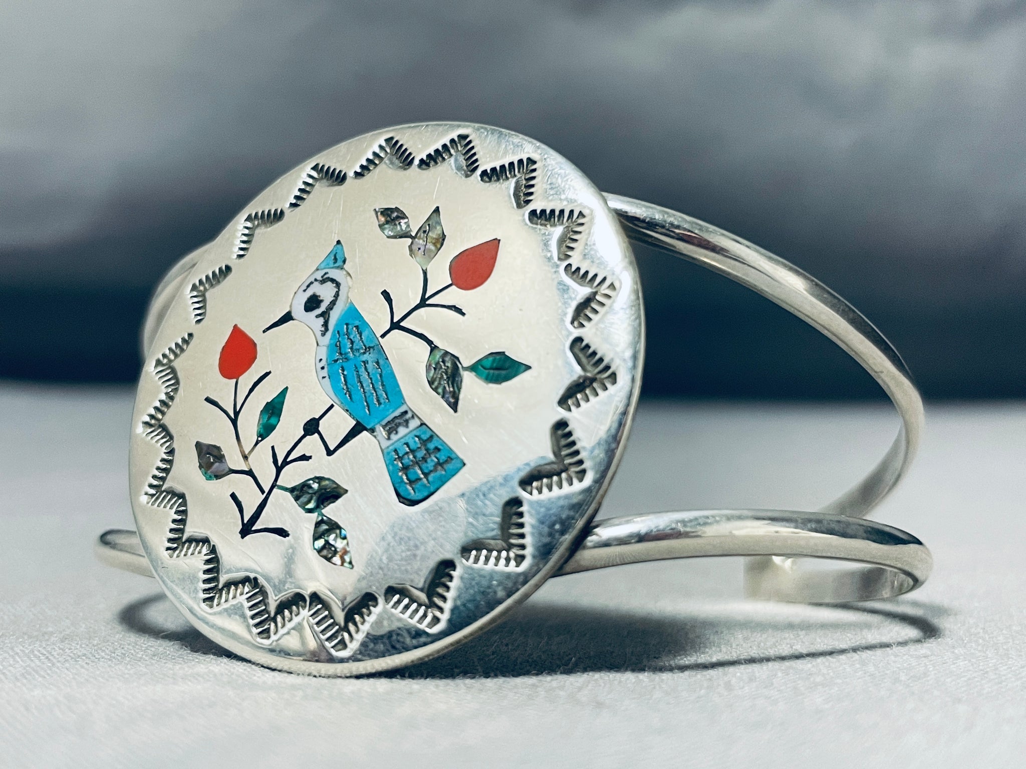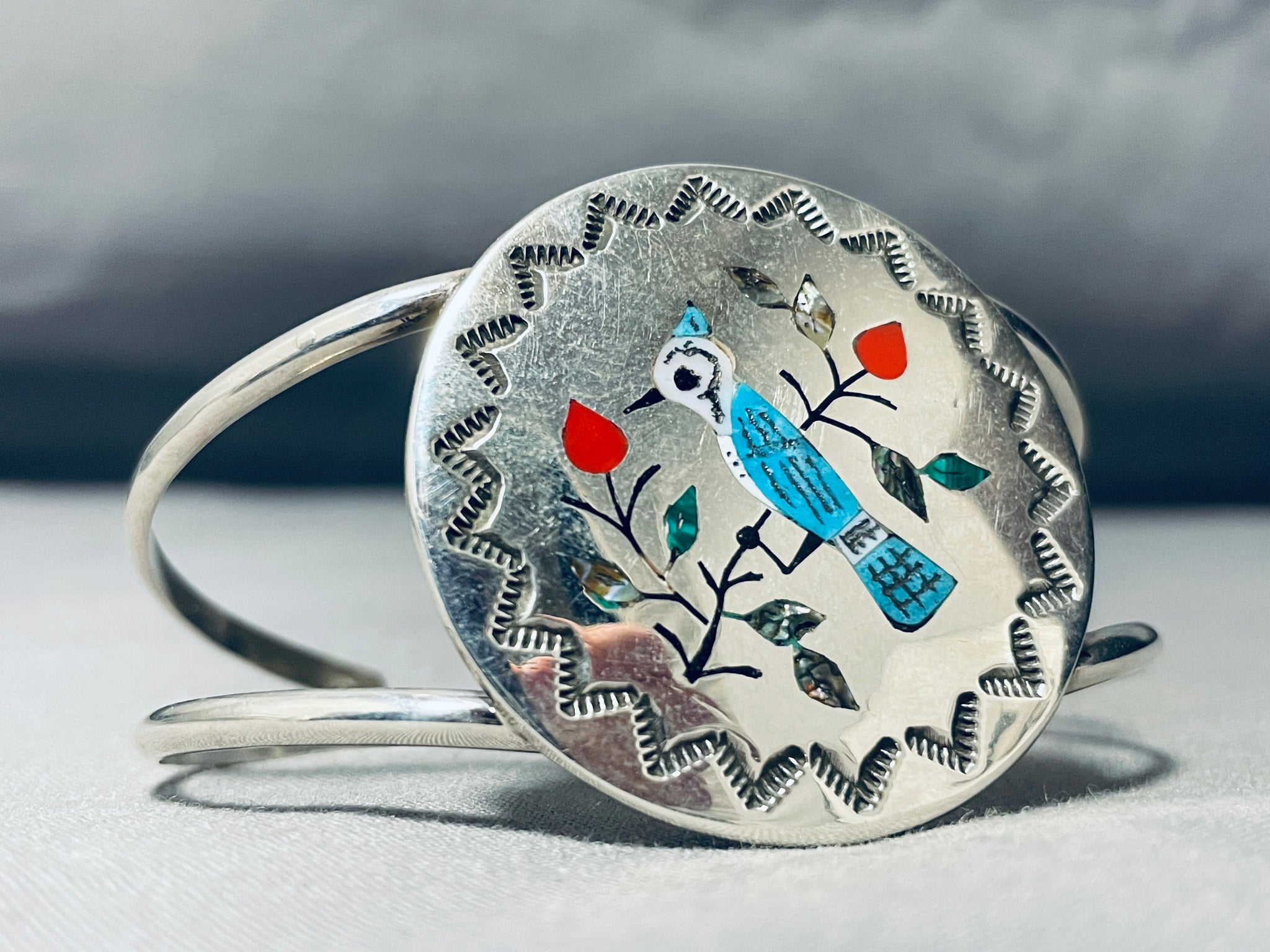 Hand Carved Bluejay Vintage Native American Zuni Turquoise Sterling Silver Bracelet