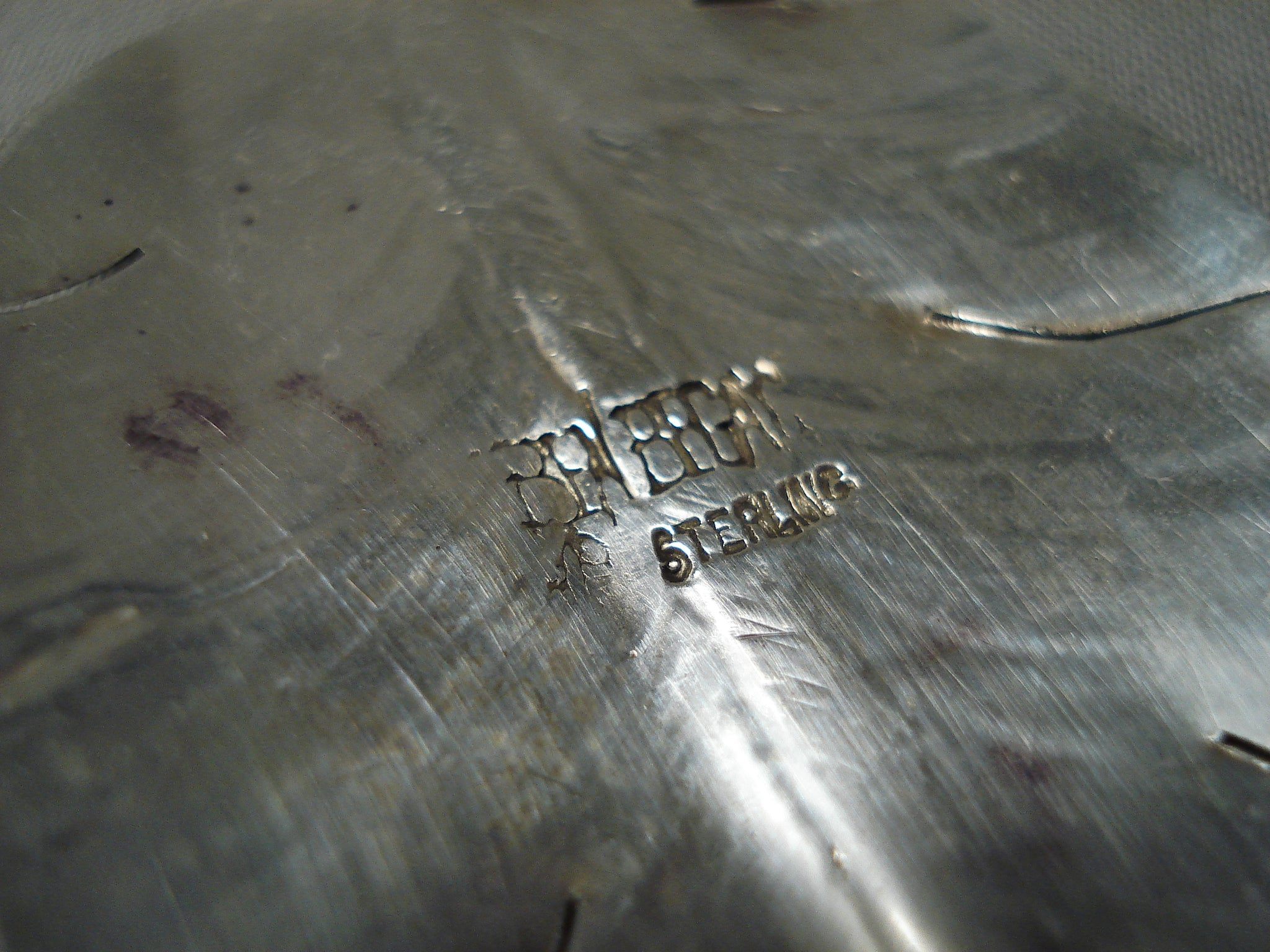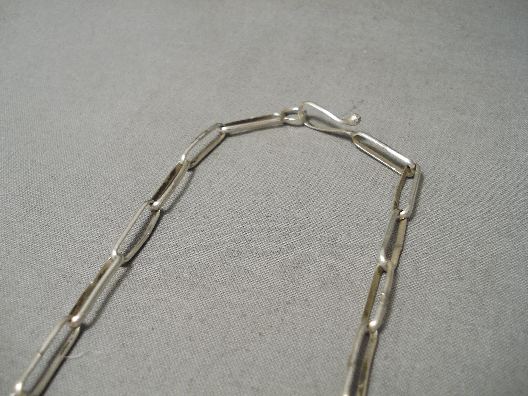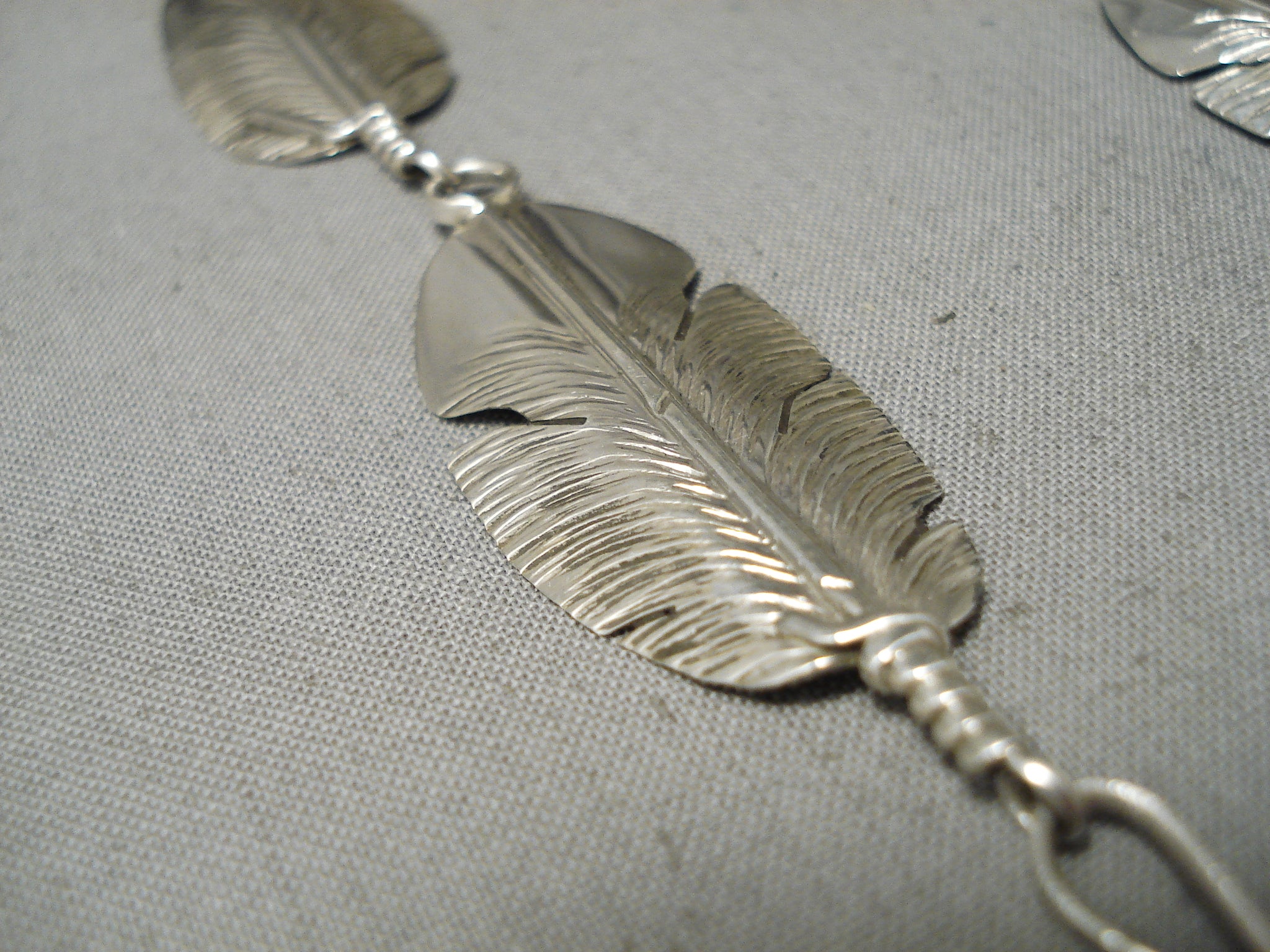 A tremendous vintage Navajo silver necklace. What a wonderful detailed feather necklace we have here! The attached largest feather at the center swings freely upon the silver sling – as each side is then decorated with 2 smaller matching feathers. The beautiful chain has nice, elongated links that allow for some length adjustability. The largest center feather measure about 3-3/8” x 1-1/2”. Sterling silver, marked. Signed by Navajo artist, Ben Begaye. The length of the necklace measures around 29". Sturdy 42 grams.