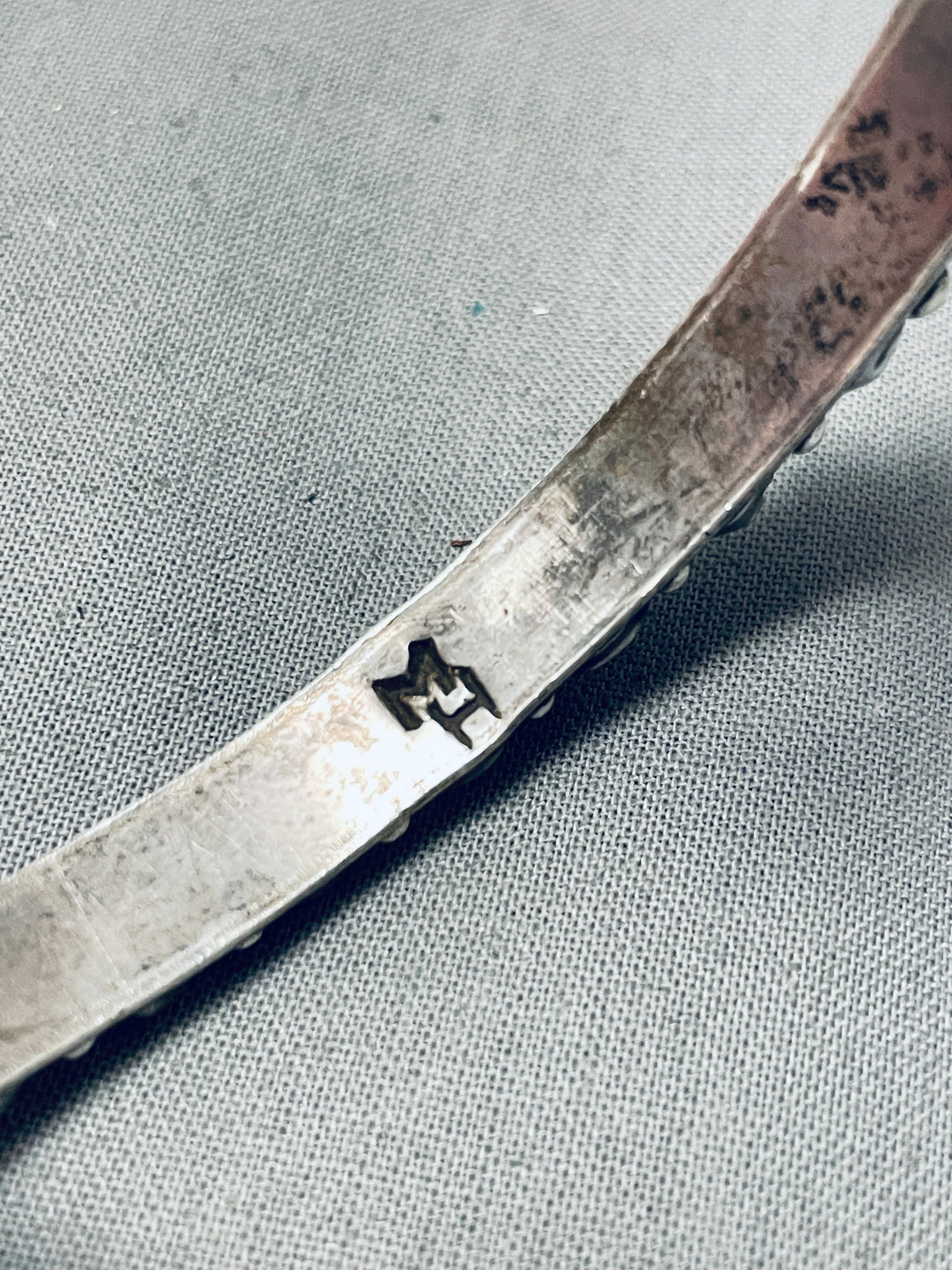 This is a fascinating vintage Navajo turquoise row silver cuff bracelet. This outstanding bracelet contains 10 impeccable hand carved Royston turquoise stones with an accenting single large snake eye shaped Royston turquoise stone. Each stone measures around 1/4" in diameter. Situated throughout the stones are beautiful silver raindrops. Running down both ends of the thick silver shank cuff are amazing silver sun stampings. The width of the bracelet measures around 1/4". Signed by Navajo artist, Marguerita Hildreth . Sterling silver. Cir. 1970's+. The inside end to end measures around 5-1/4" with an additional 1-1/4" gap. Sturdy 18 grams.