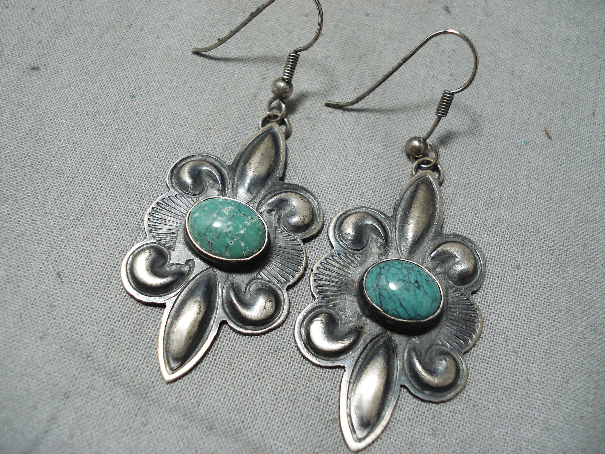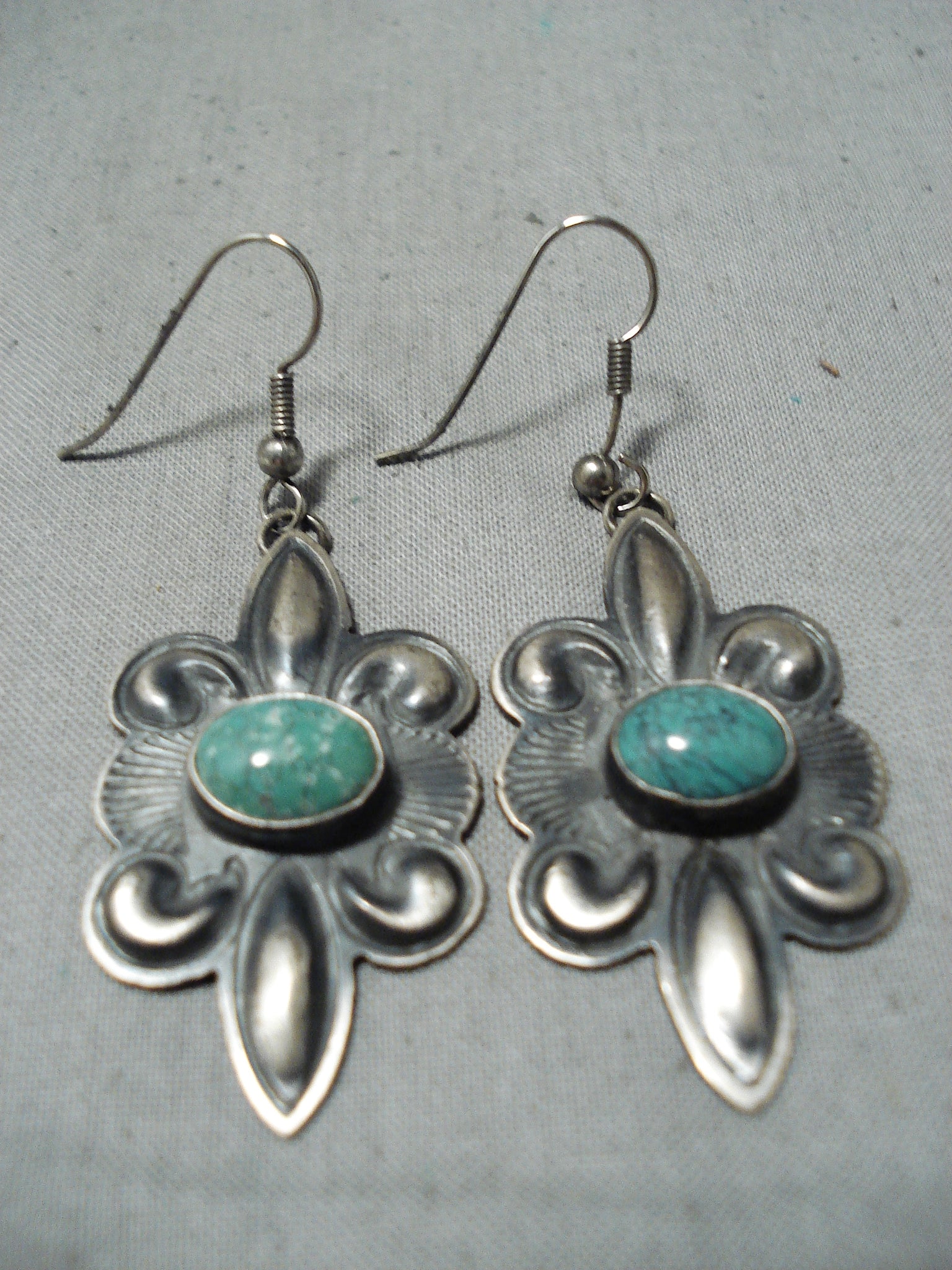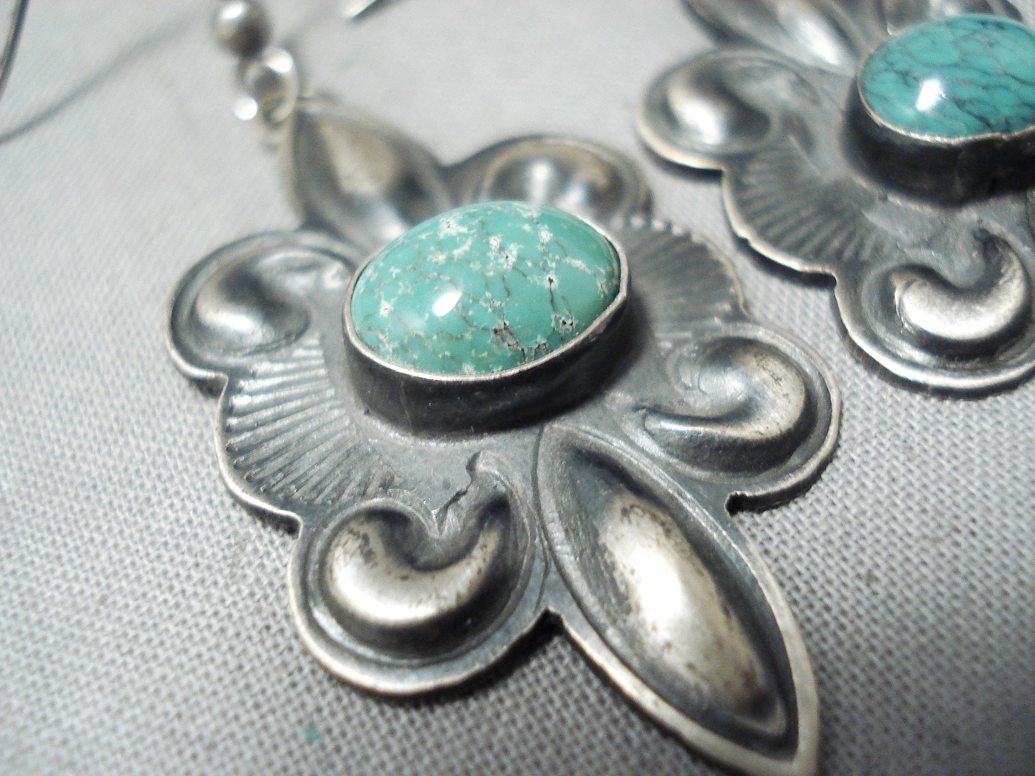 Hand Repoussed Vintage Native American Navajo Sterling Silver Green Turquoise Earrings