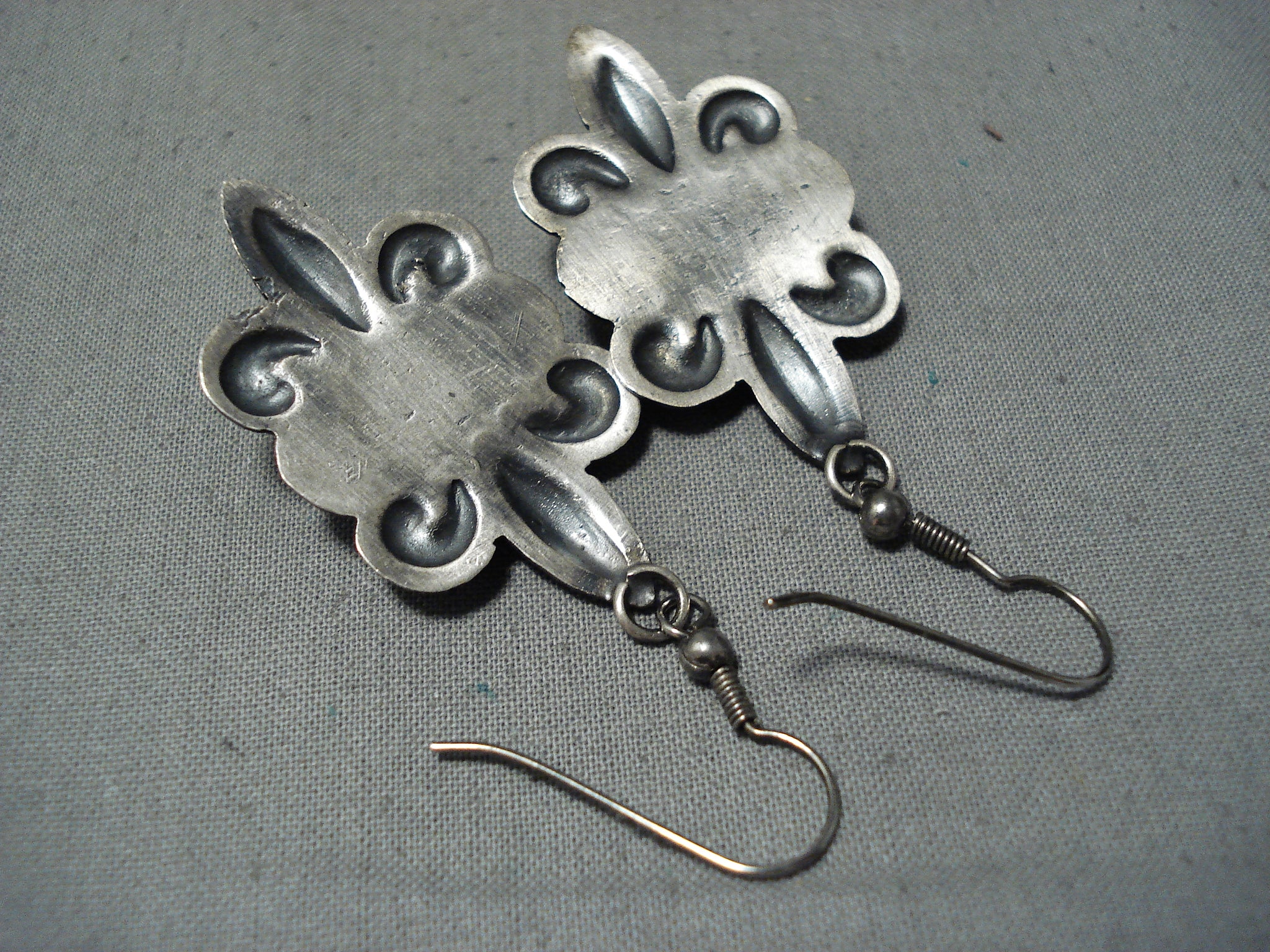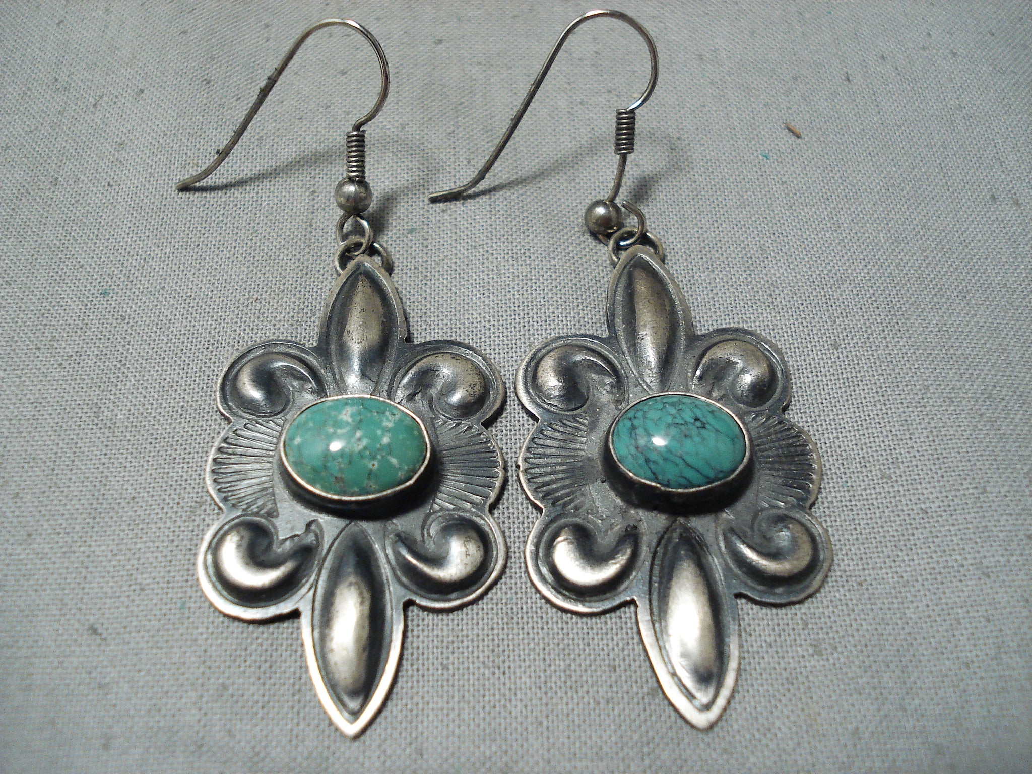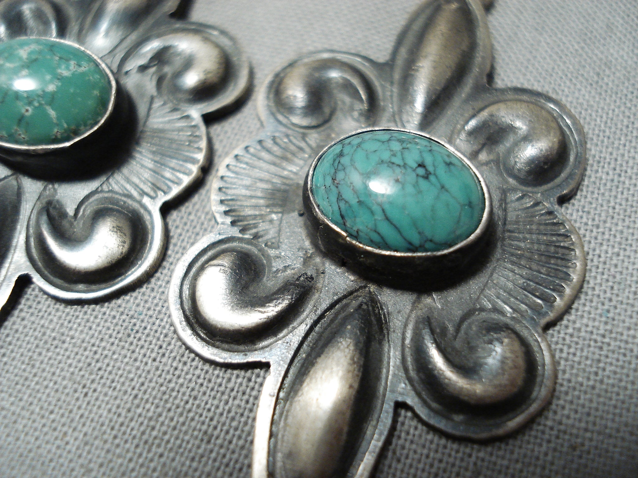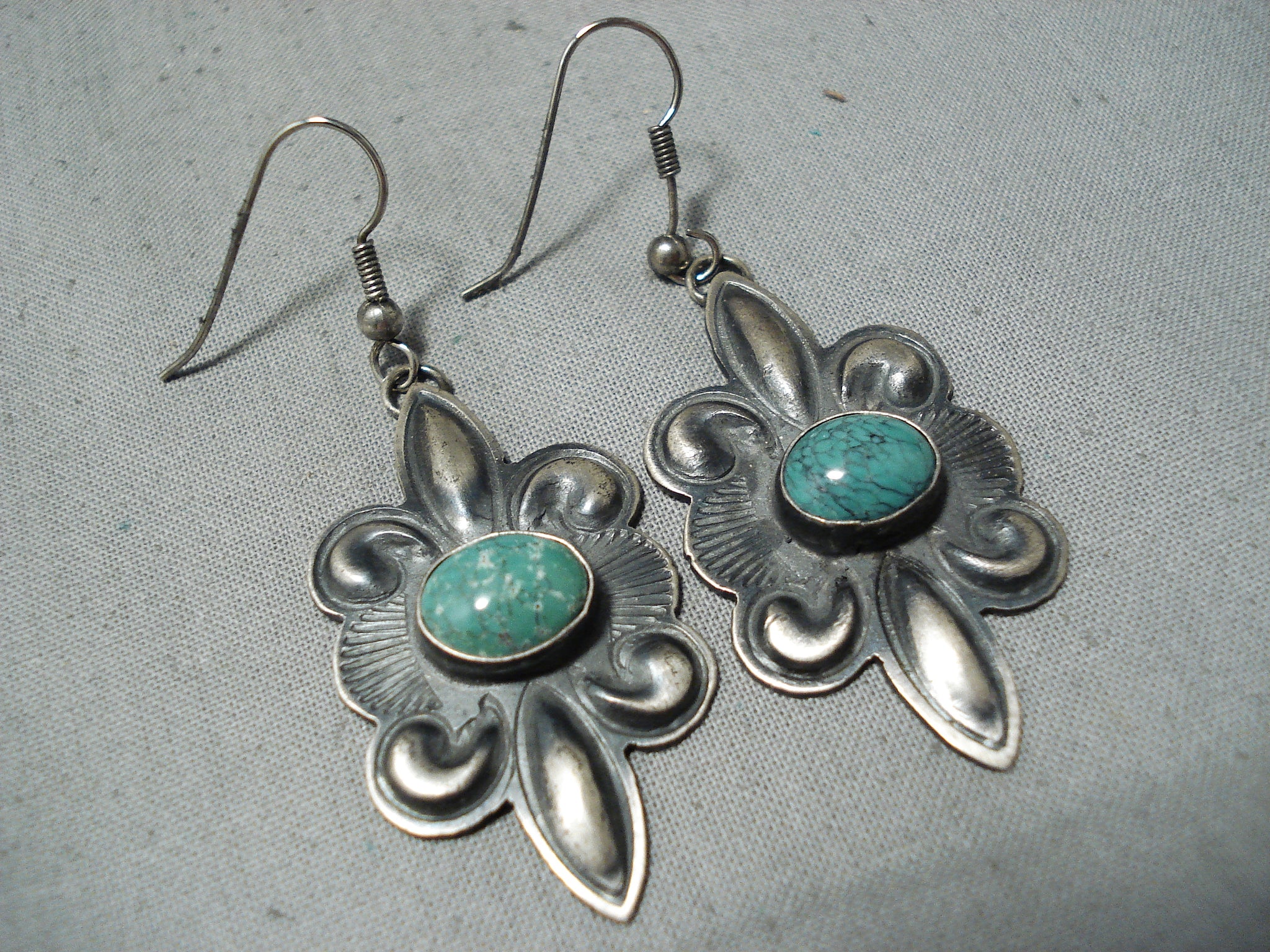 Hand Repoussed Vintage Native American Navajo Sterling Silver Green Turquoise Earrings