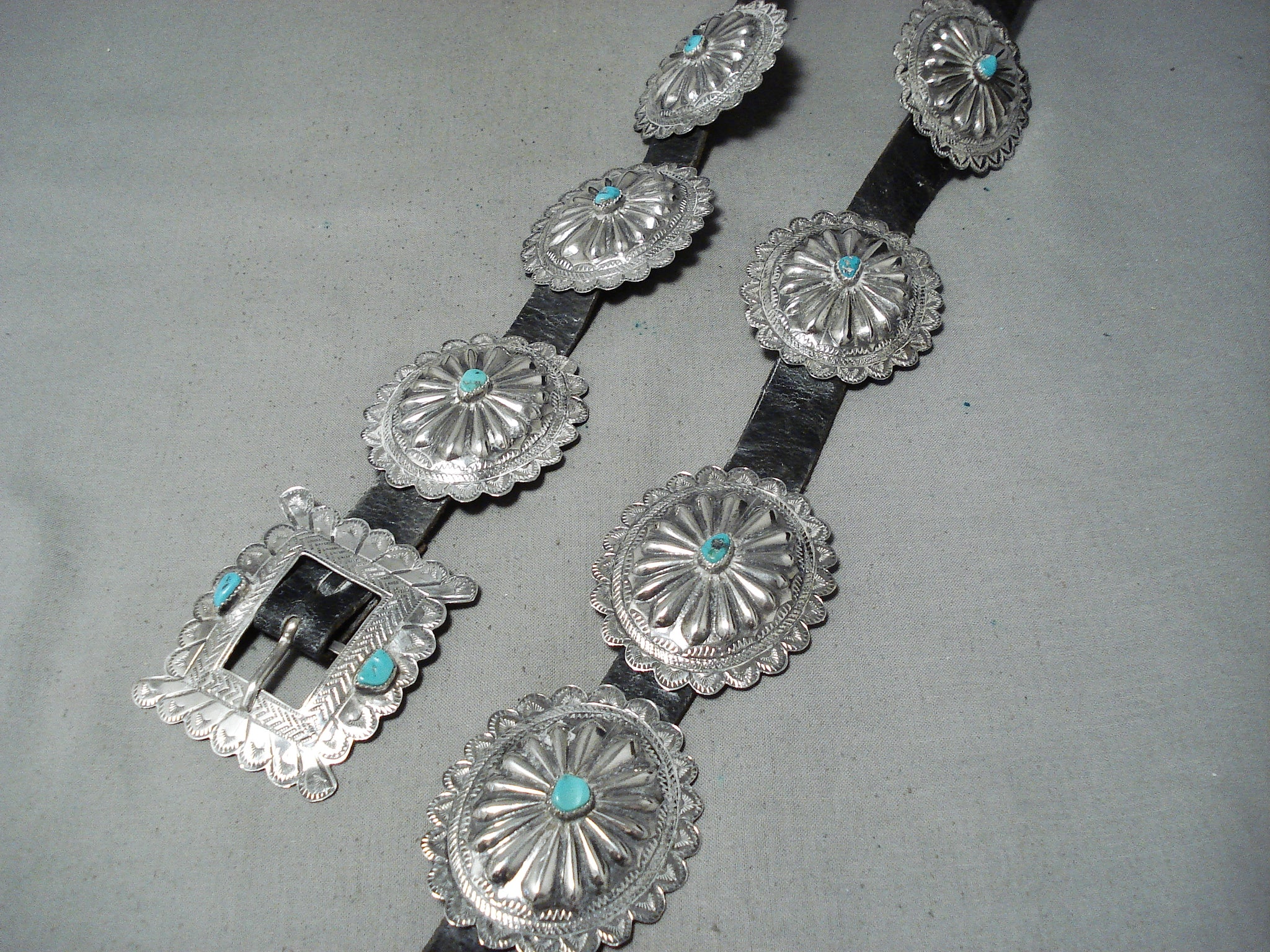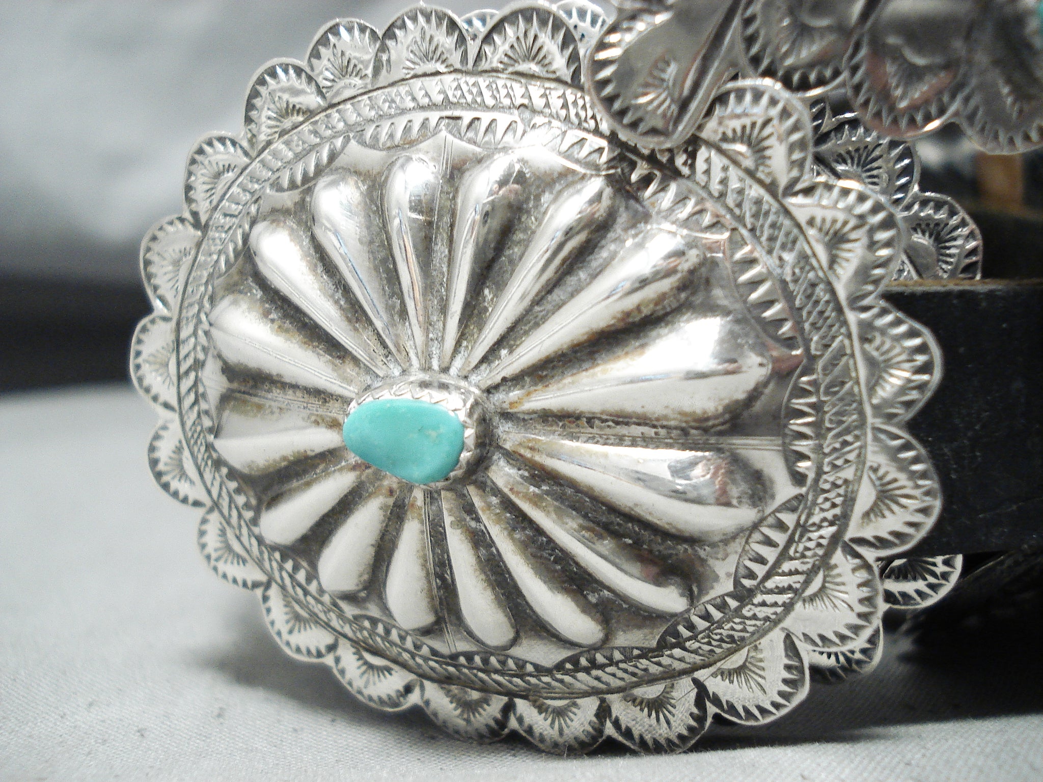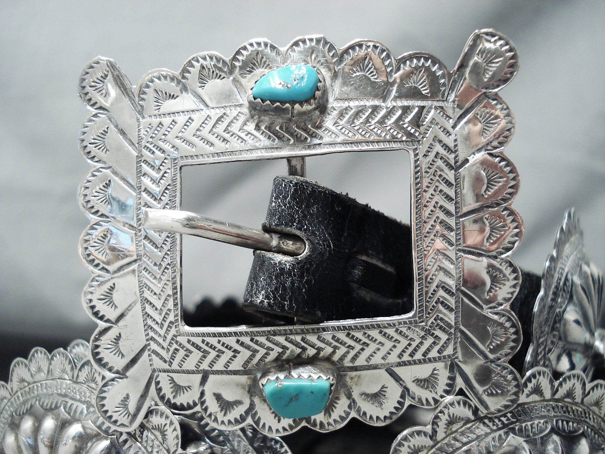 Hand Tooled Authentic Vintage Native American Navajo Turquoise Sterling Silver Concho Belt