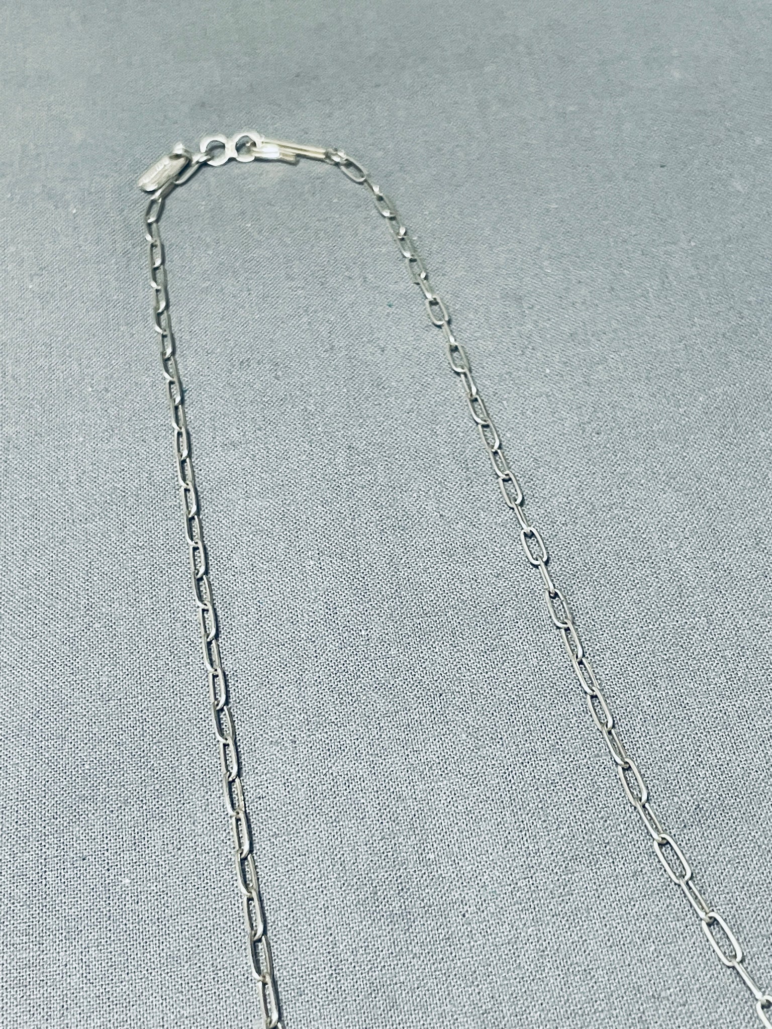 This is a fabulous vintage Navajo all silver necklace. This is a unique necklace as the majority of the necklace consists of a handmade silver link chain with an end traditional silver clasp. Located at the bottom of the necklace are marvelous handmade graduating round silver beads with the largest measuring around 1/2" in diameter. The center largest silver bead consists of stunning sun stampings. Resting at the ends of the beads are silver cones. I absolutely love the look of this necklace. What I also love is the sterling silver, marked tab near the clasp, very rare. Sterling silver, marked. Cir. 1970's+. The length of the necklace measures around 18-1/2". Sturdy 14 grams.