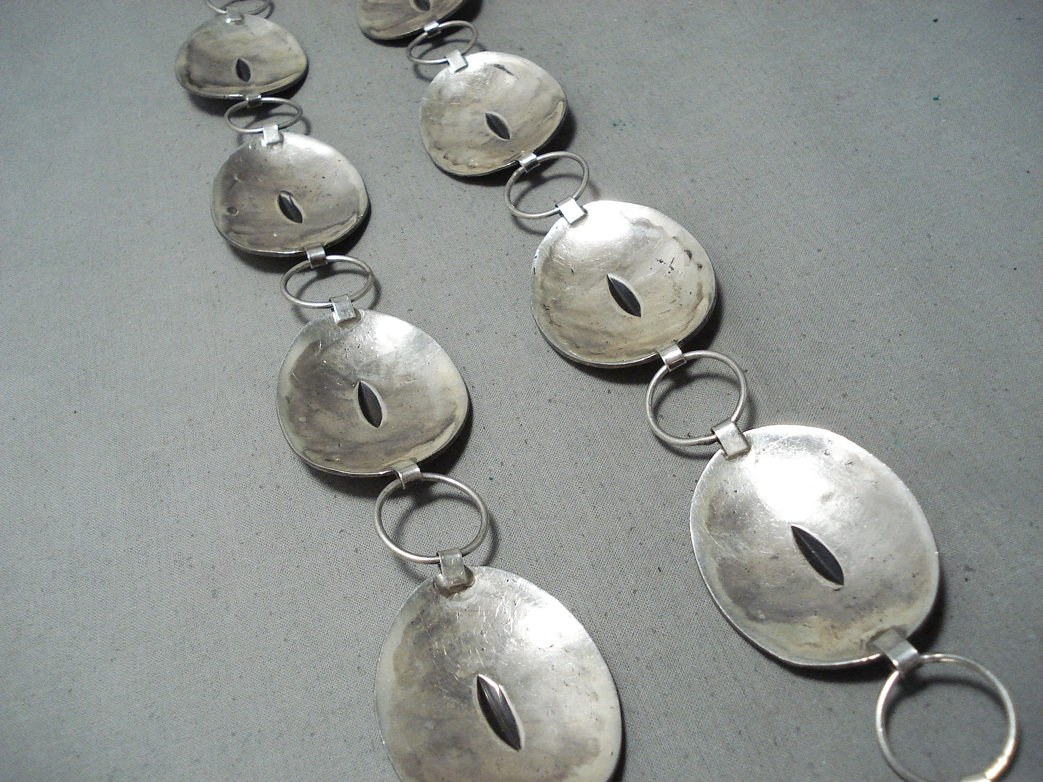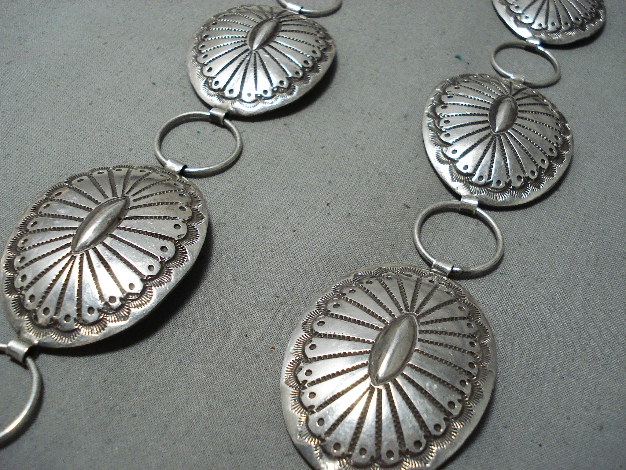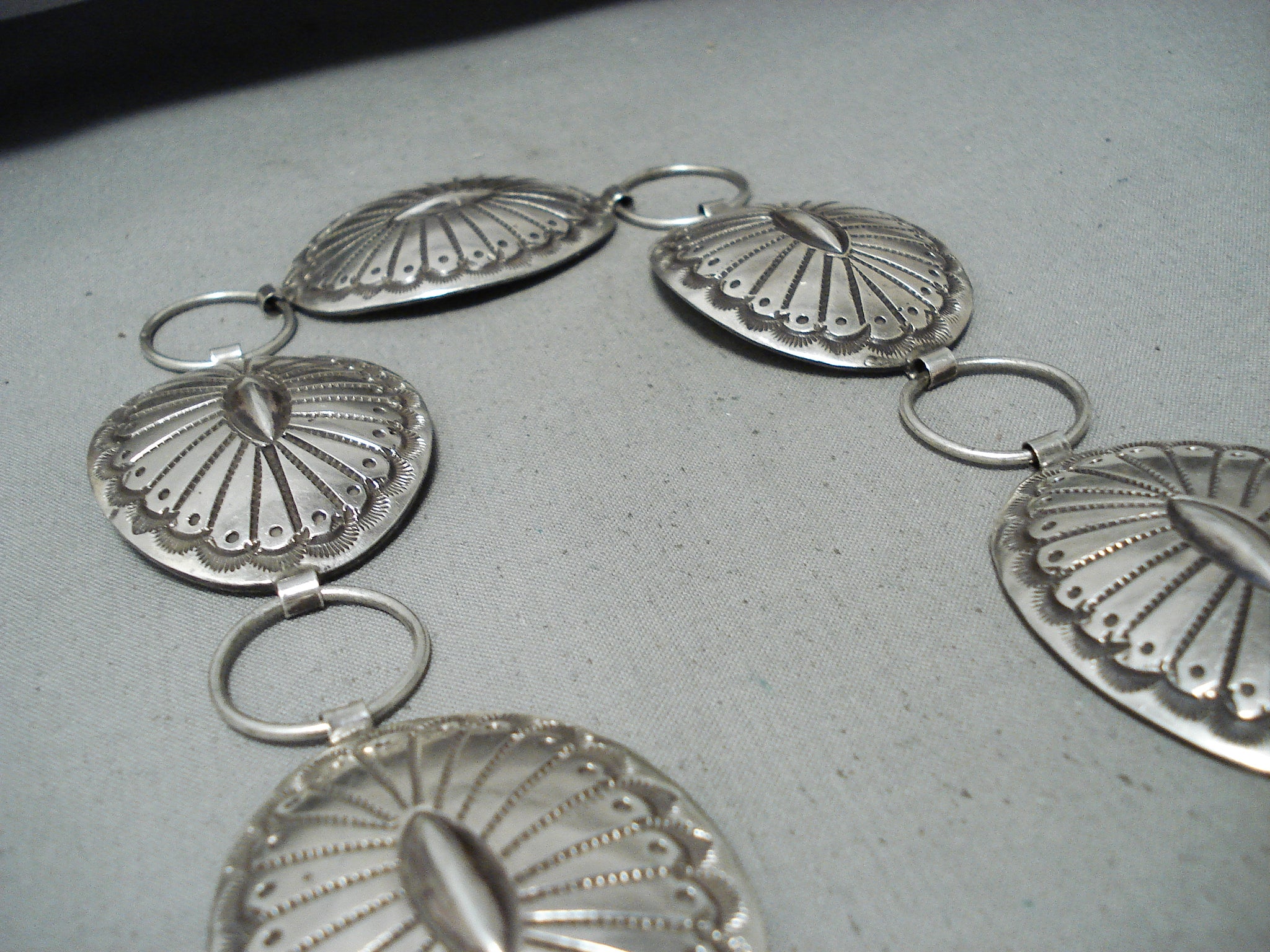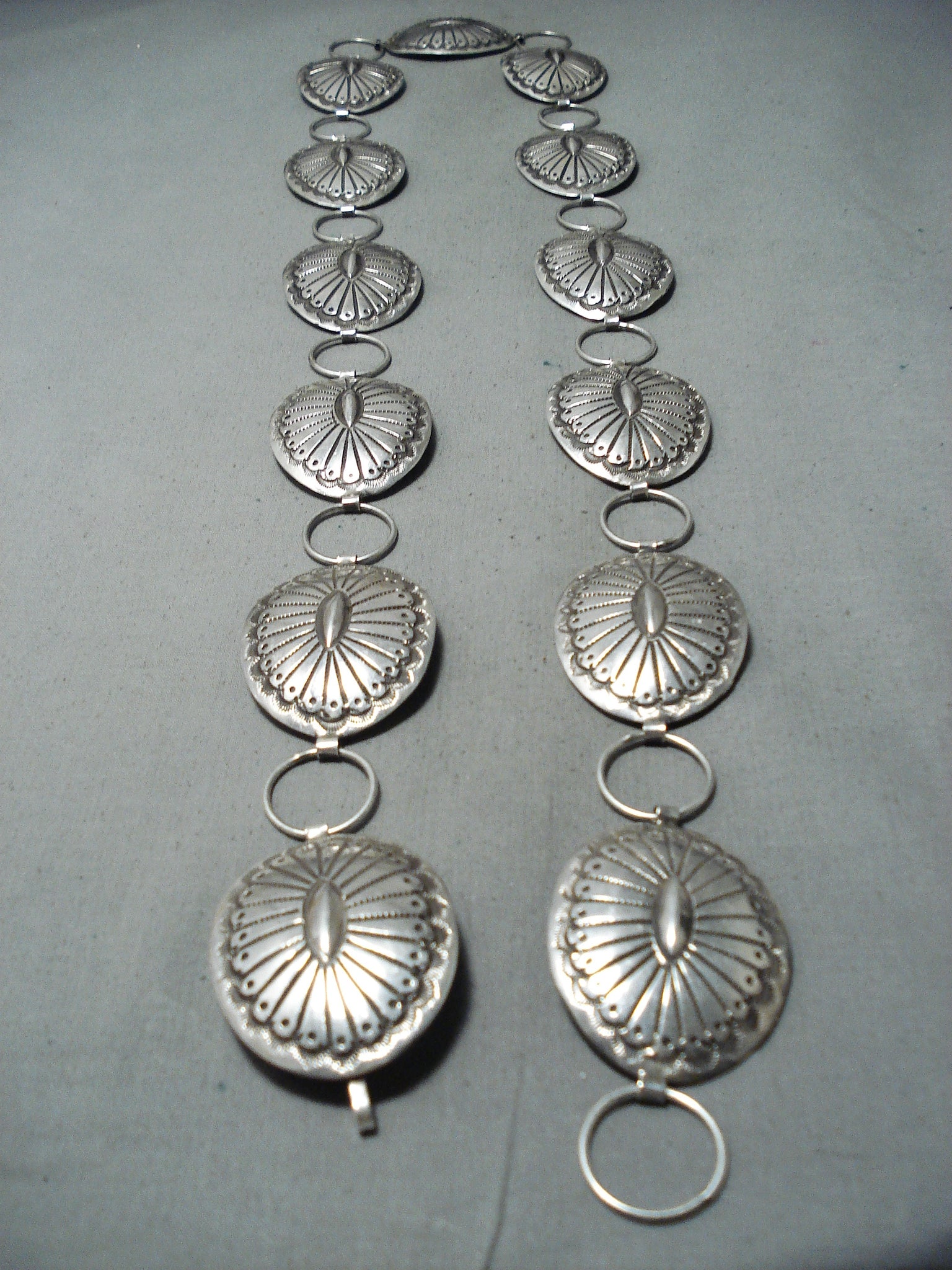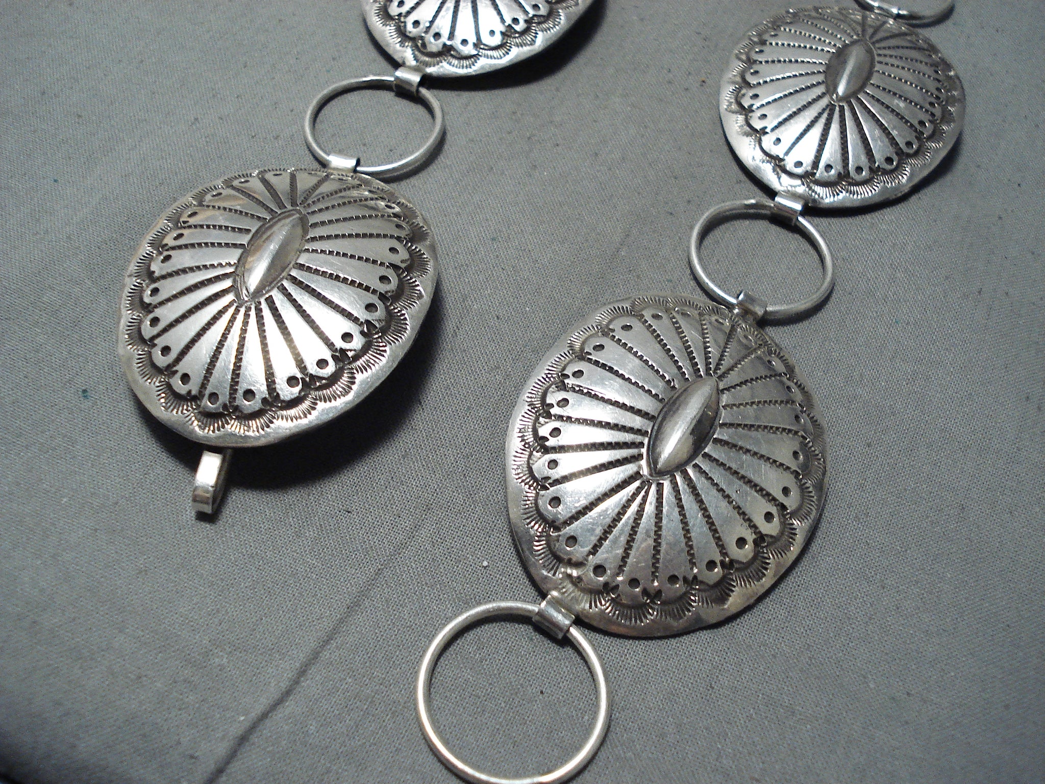 We are proud to offer this museum quality vintage Navajo silver concho belt having large handcarved, convex silver conchos with silver repousse designs and silver handstampings! The belt has round silver links and a silver hook clasp! Absolutely Incredible! Each concho measures around 2" x 1-5/8". Sterling silver. This belt will fit a waist size between 26" and 39". Sturdy 294 grams.