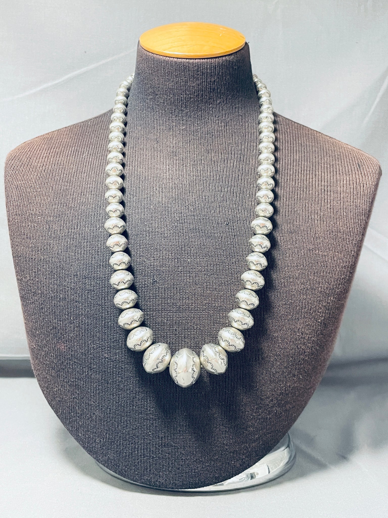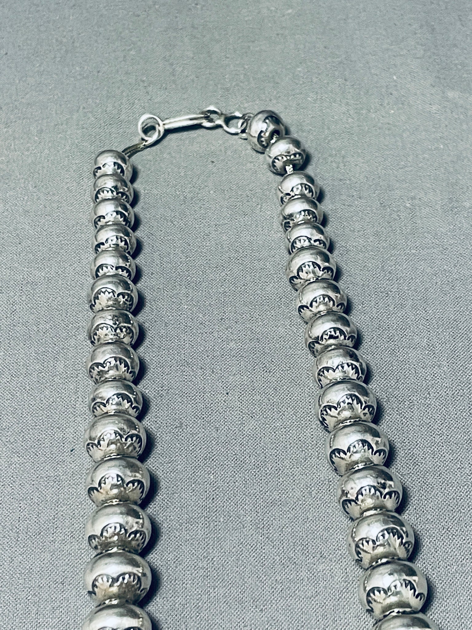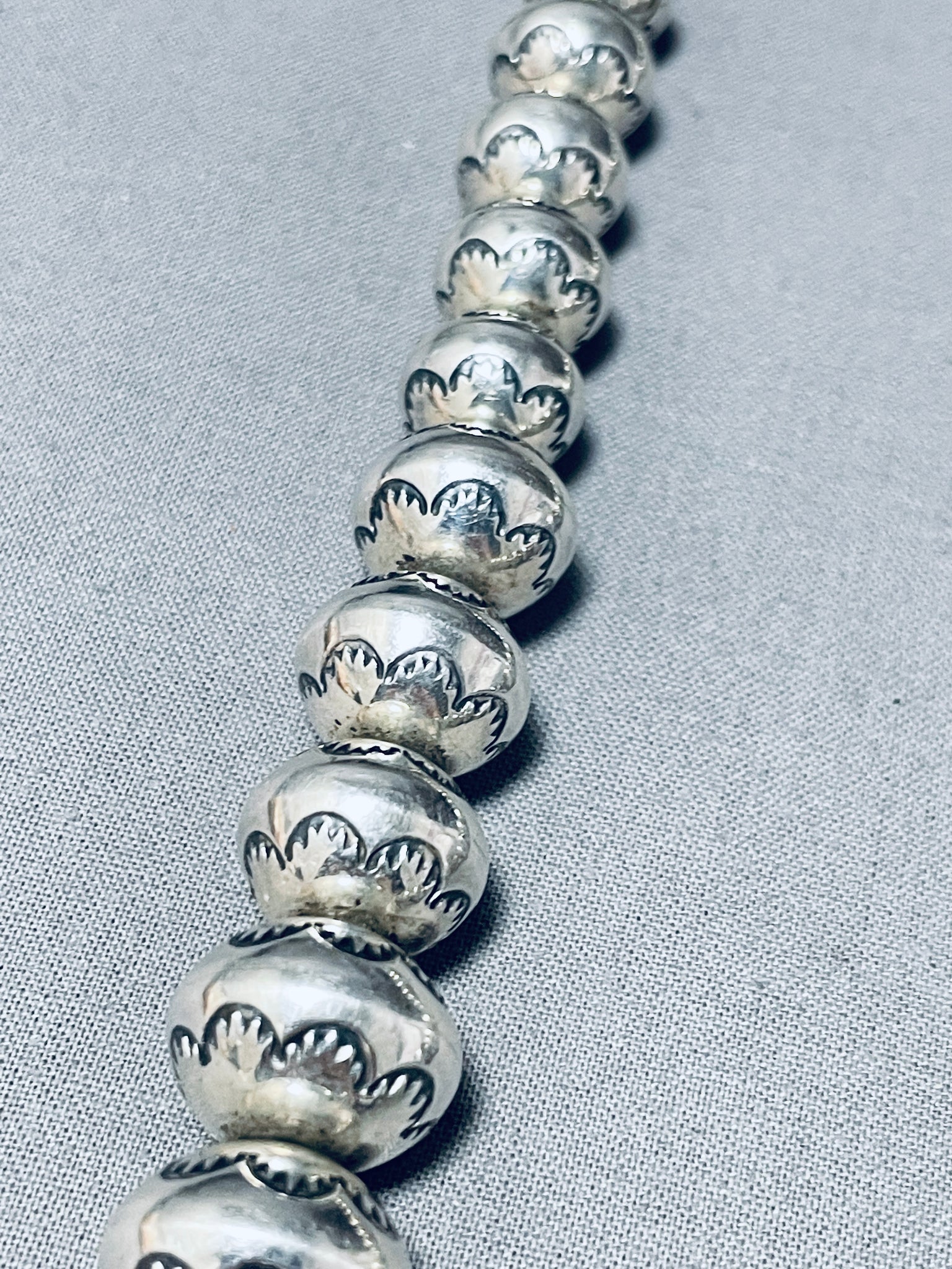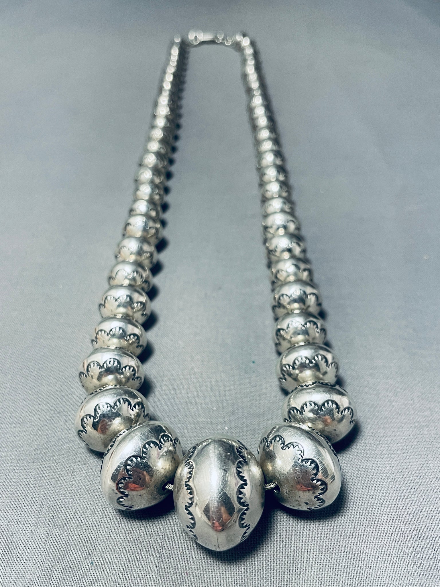 This is a breathtaking Navajo all silver bead necklace. This impressive necklace contains a beautiful plethora of handmade round silver beads that wonderfully graduate in size towards the bottom with the largest bead measuring around 1" in diameter and the smallest bead measuring around 3/8" in diameter. I absolutely love how each and every single bead consists of outstanding cloud shaped stampings, such a beautiful feature. Sterling silver. Cir. 1970's+. The length of the necklace measures around 24". Sturdy 115 grams.