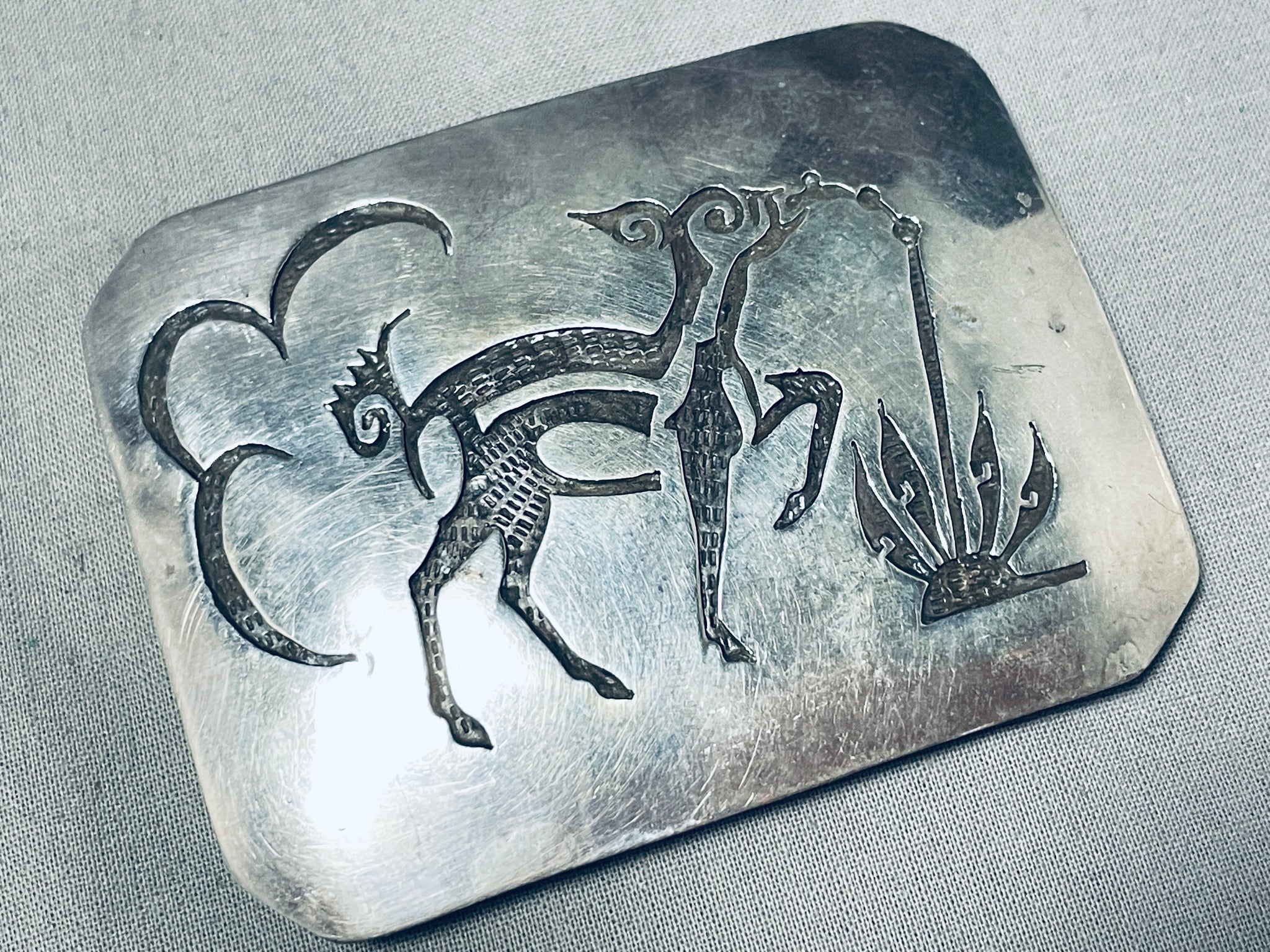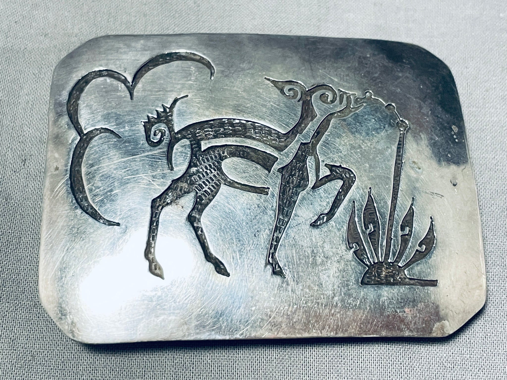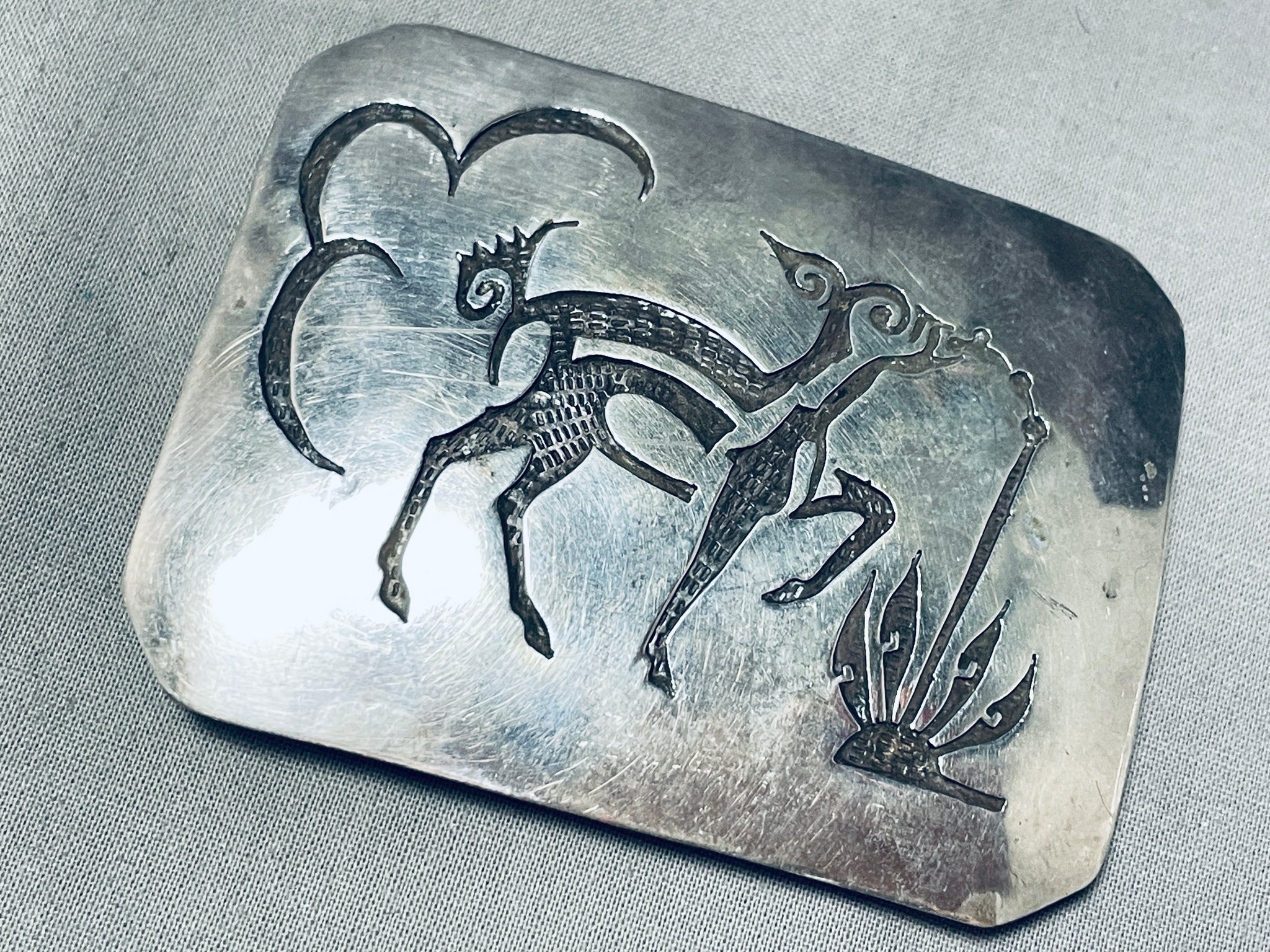 Happy Drancing Deer Vintage Native American Navajo Sterling Silver Buckle