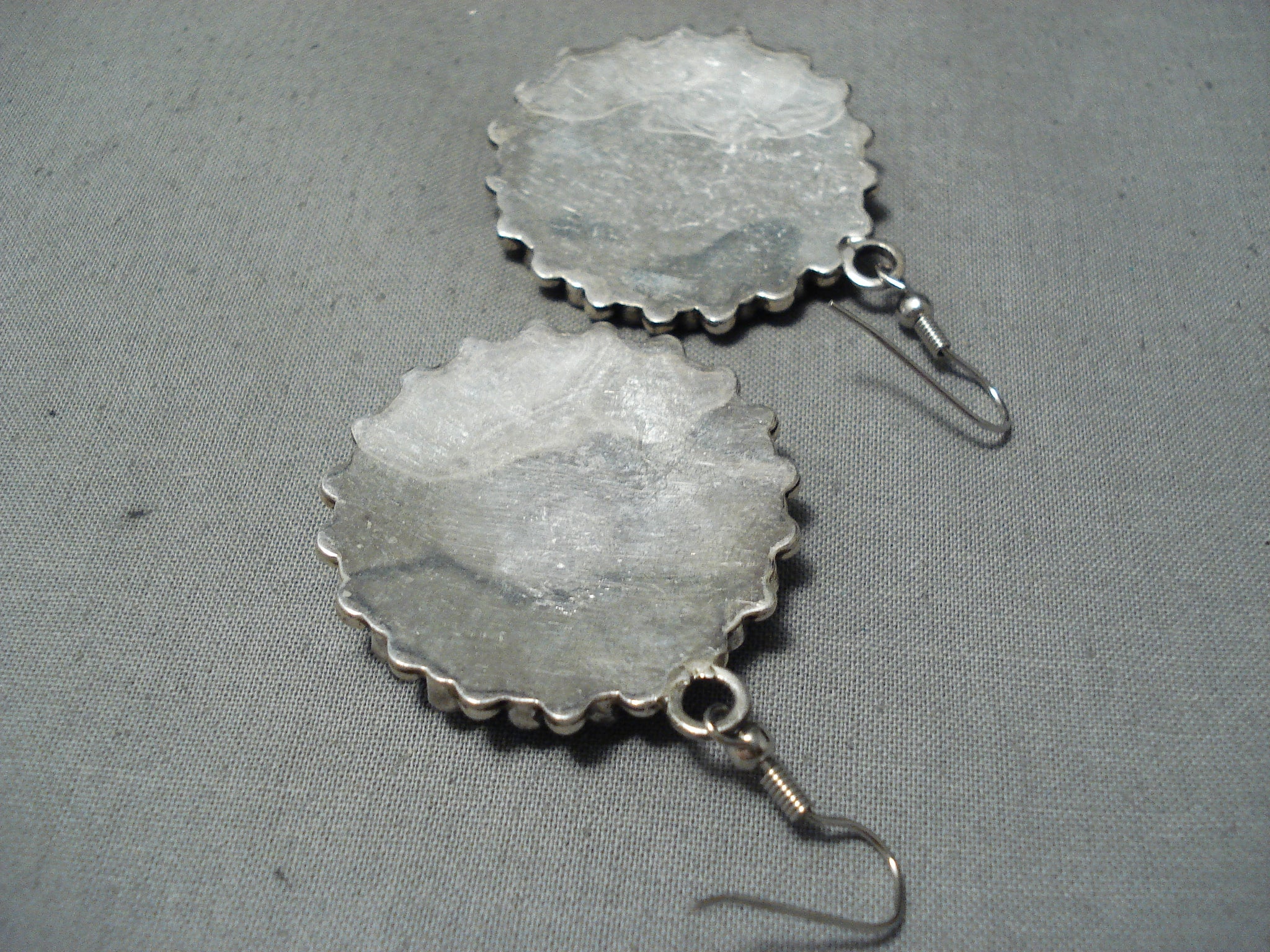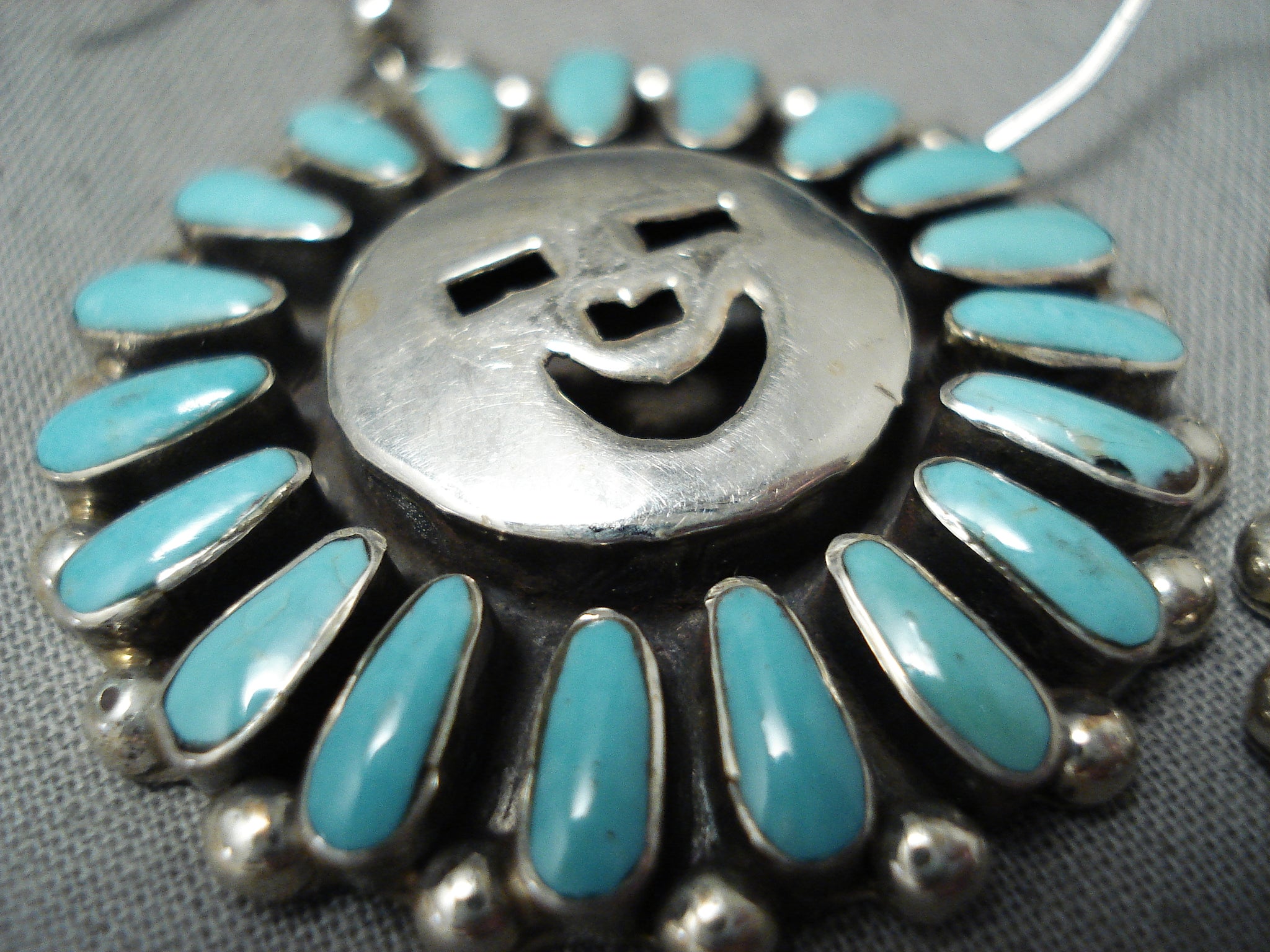 This is a striking vintage Navajo pair of silver sun face turquoise earrings. These earrings are very rare as they are heavy and consist of a remarkable intricate silver sun face in the center. Surrounding the face are large natural Sleeping Beauty turquoise stones with accenting silver raindrops. Each earring measures around 1-1/2" in diameter not including the hooks. Sterling silver. Cir. Mid century . The earrings weigh around 27 grams.