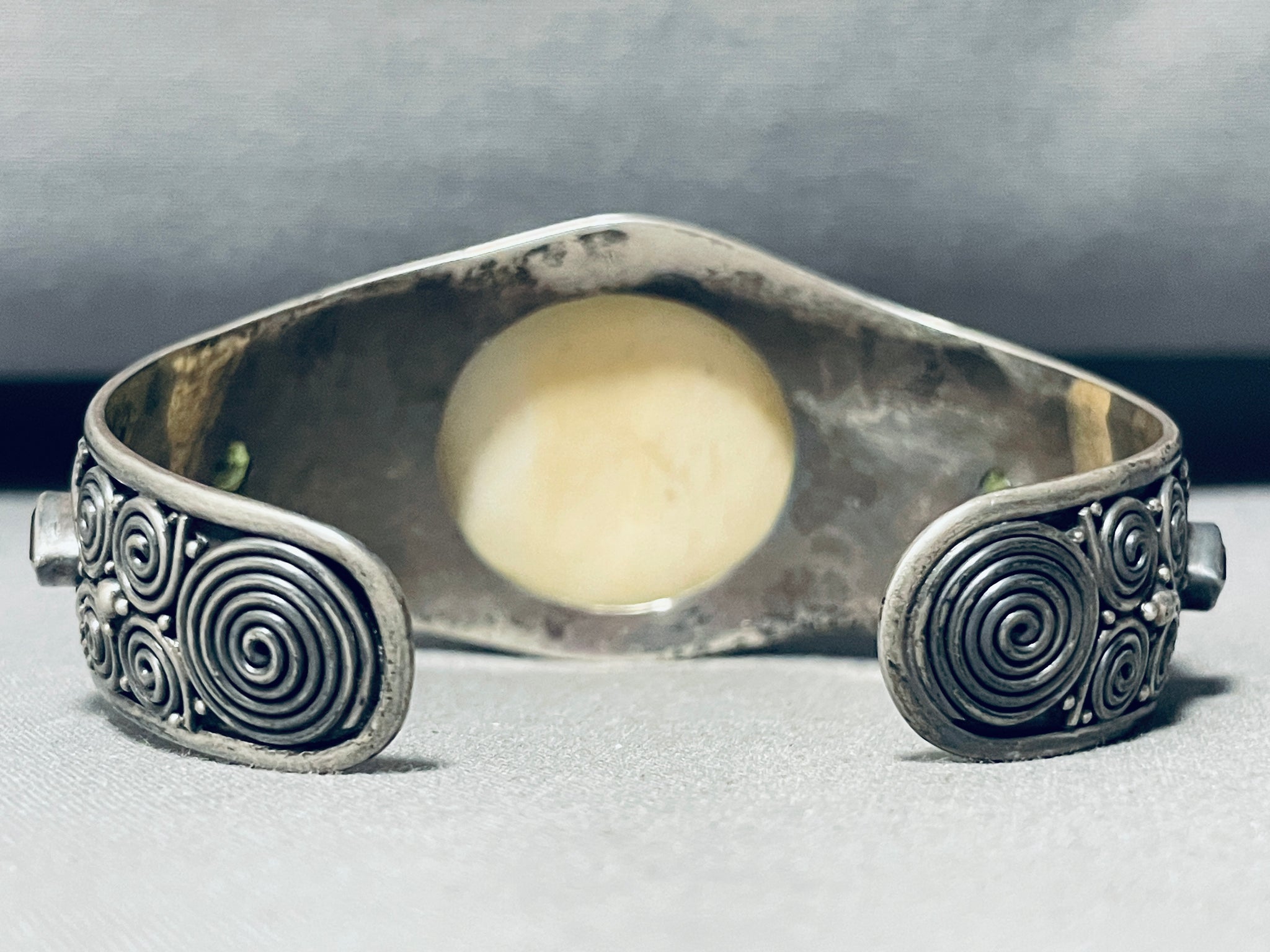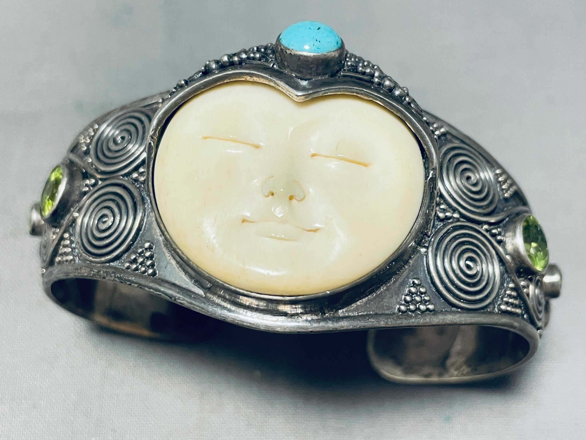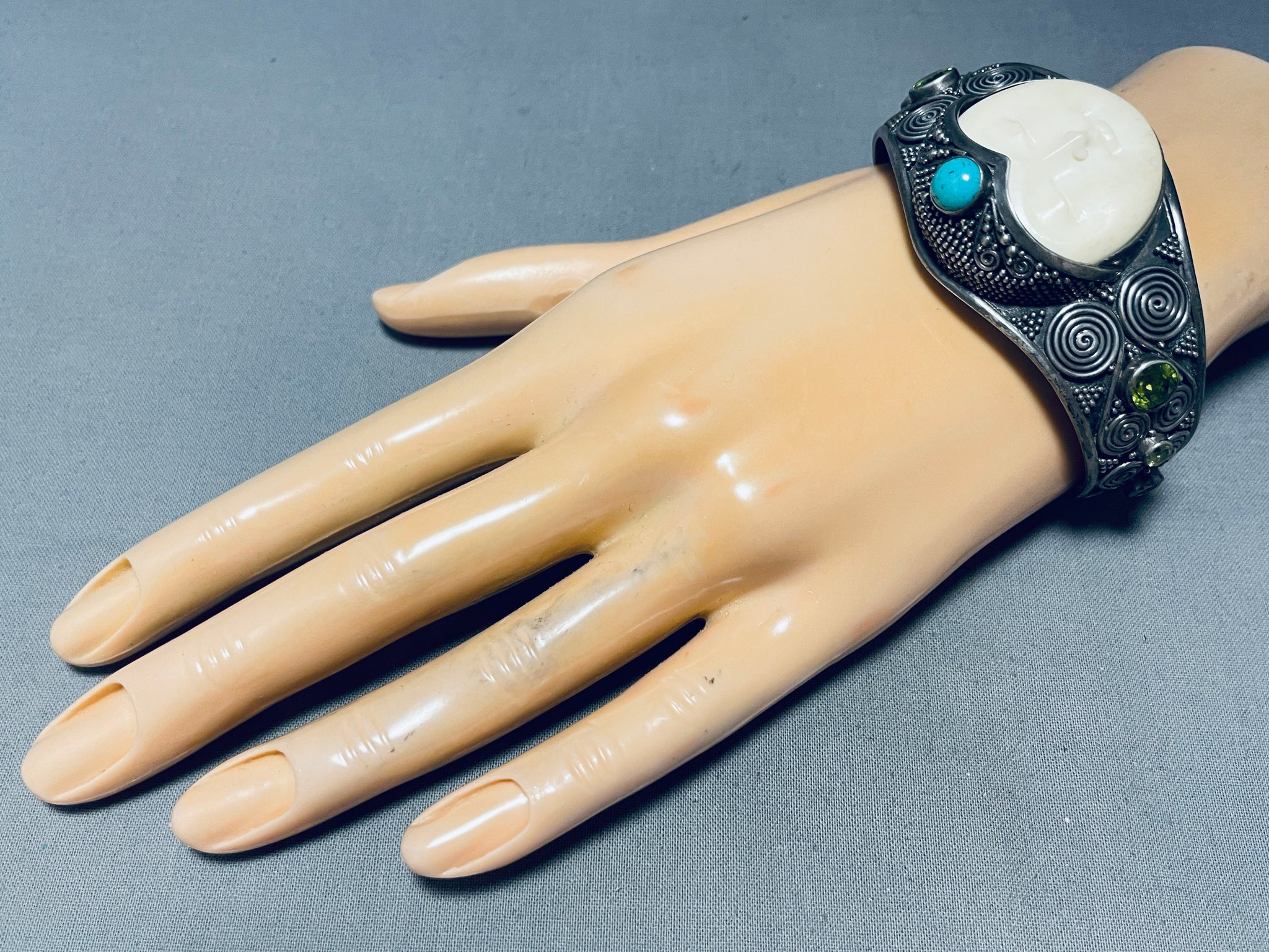 This is a marvelous vintage southwestern hand carved moon silver cuff bracelet. This amazing bracelet contains a center hand carved white stone with accenting green stones, purple stones and a center rounded turquoise stone. Situated throughout the entire bracelet are fascinating silver works that consist of a mind blowing plethora of silver raindrops, stems and swirling stems. The center stone measures around 1" in diameter. The width of the bracelet measures around 1-3/8". Signed by artist, NF. Sterling silver, marked. Cir. 1970's+. The inside end to end measures around 6-1/4" with an additional 1" gap. Sturdy 42 grams.