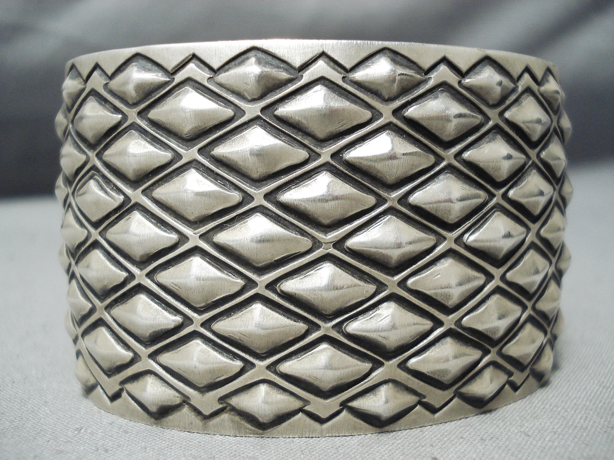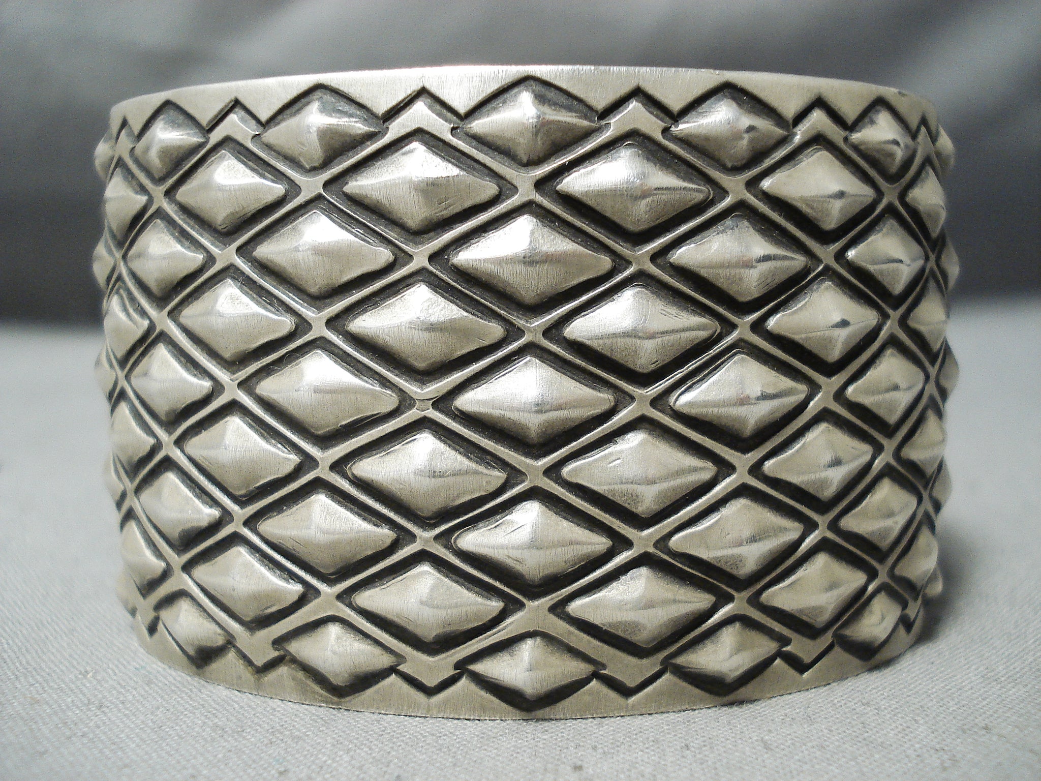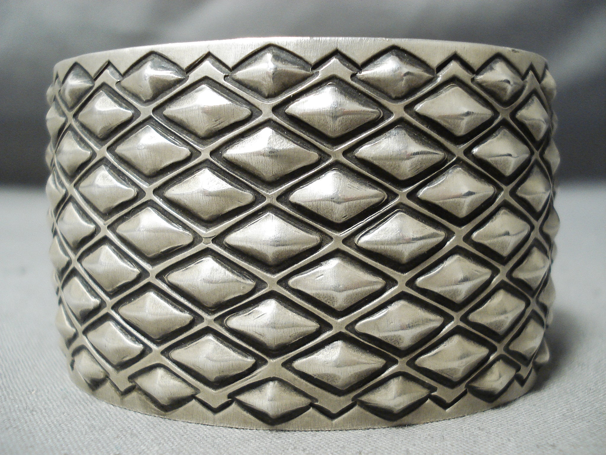 We are proud to offer this magnificent Navajo silver bracelet having handcarved silver repousse diamond designs all across this huge handcarved solid silver cuff! Absolutely Incredible! The width of the bracelet measures around 1-3/8". Signed by Navajo artist, Harry Joe. Sterling silver, marked. The inside end to end measures around 5-7/8" with an additional 1-1/4" gap. Sturdy 77 grams.