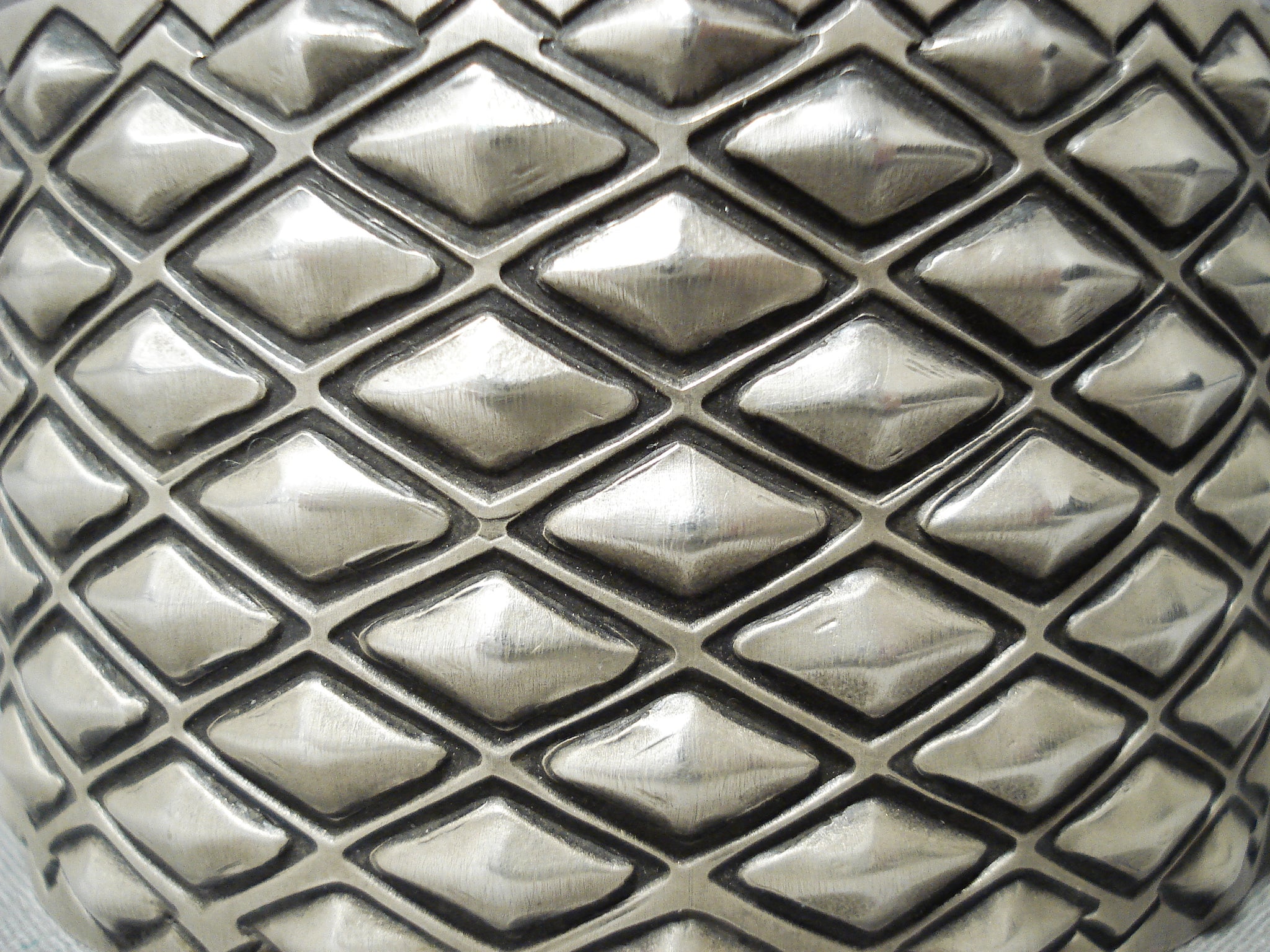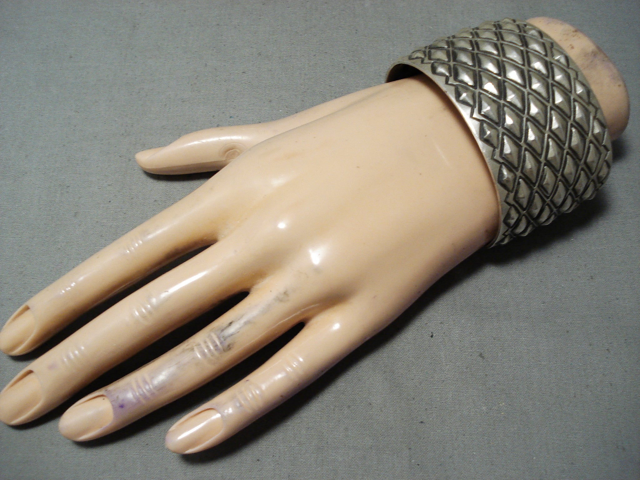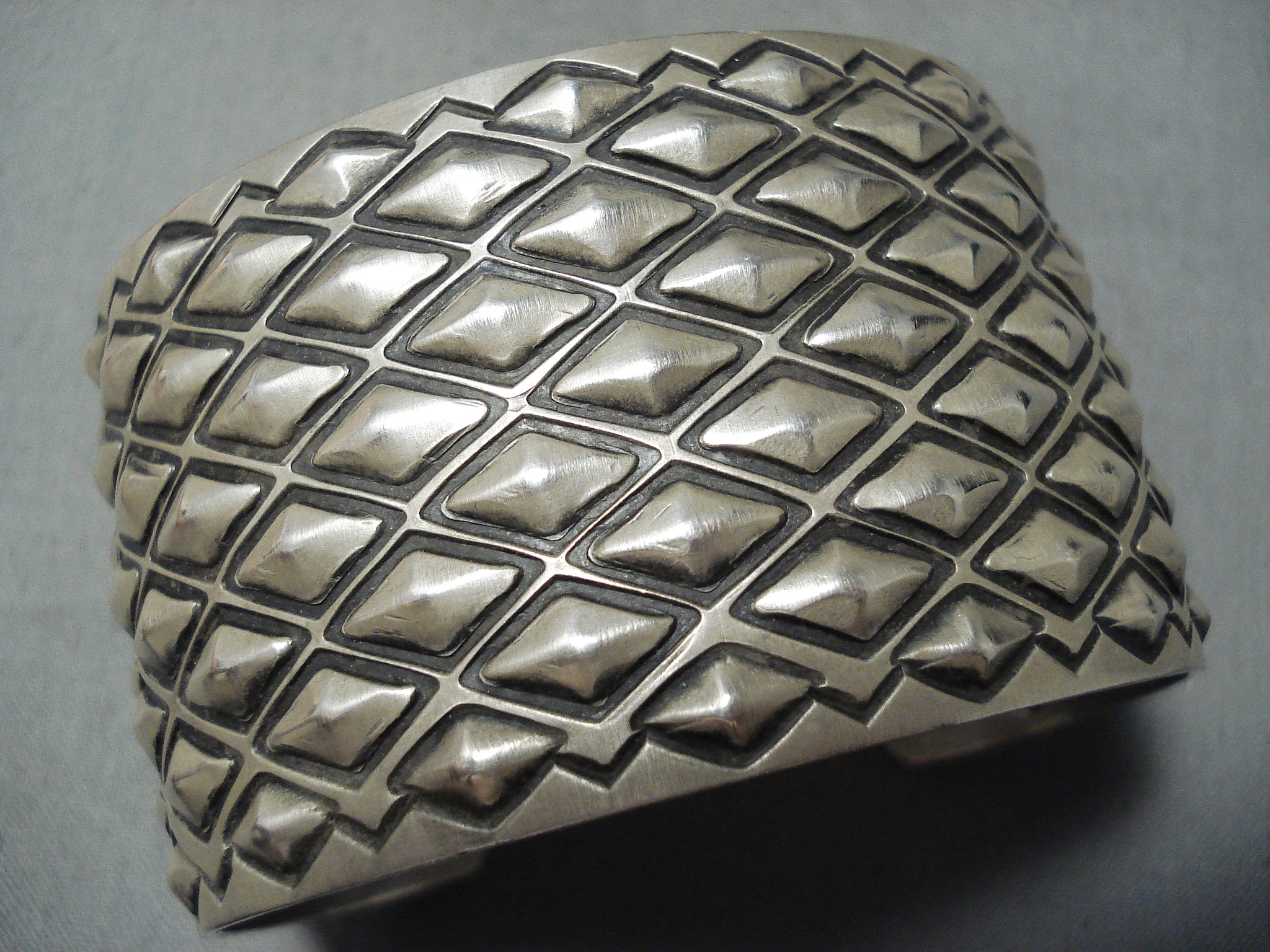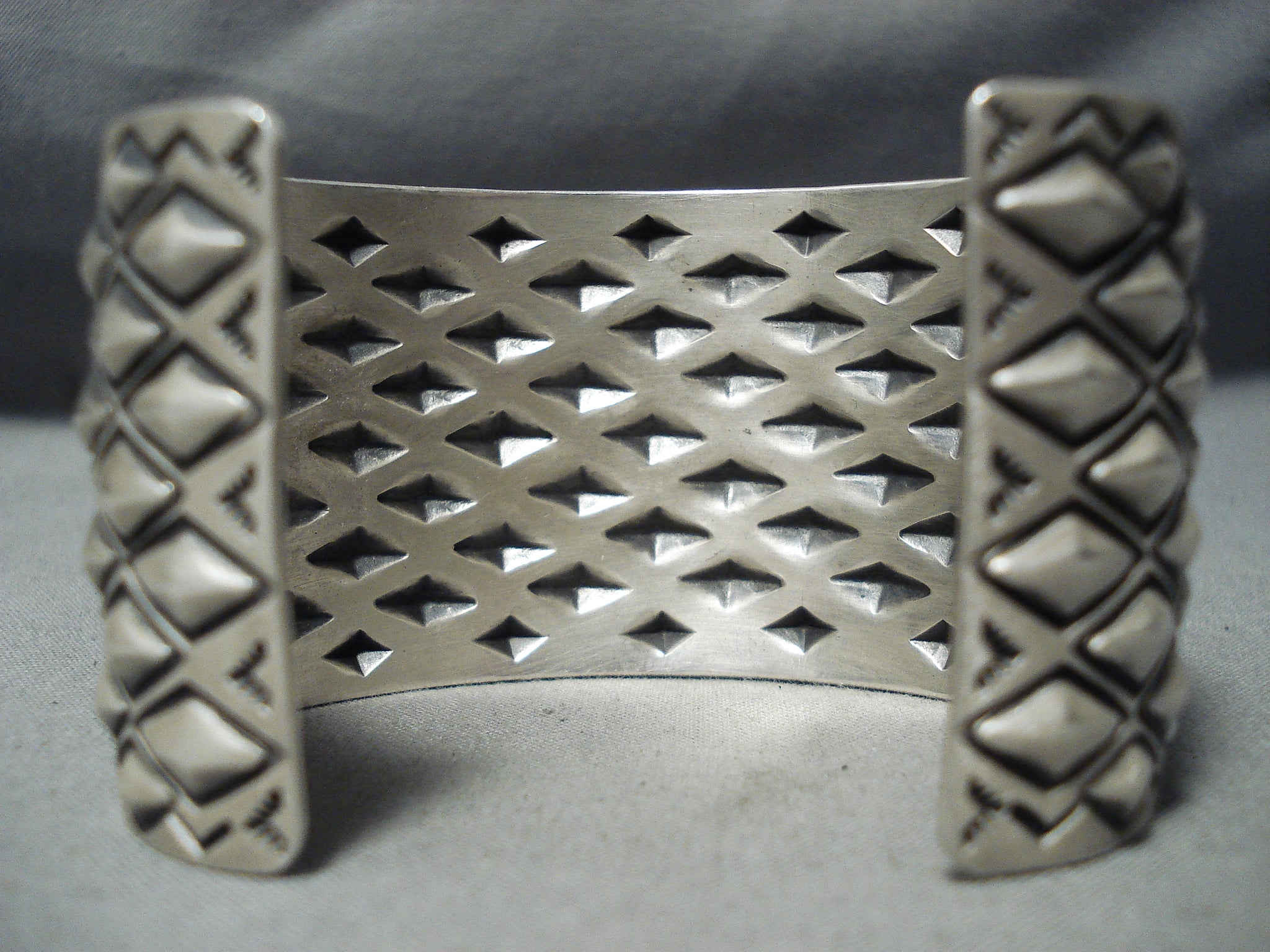 We are proud to offer this magnificent Navajo silver bracelet having handcarved silver repousse diamond designs all across this huge handcarved solid silver cuff! Absolutely Incredible! The width of the bracelet measures around 1-3/8". Signed by Navajo artist, Harry Joe. Sterling silver, marked. The inside end to end measures around 5-7/8" with an additional 1-1/4" gap. Sturdy 77 grams.