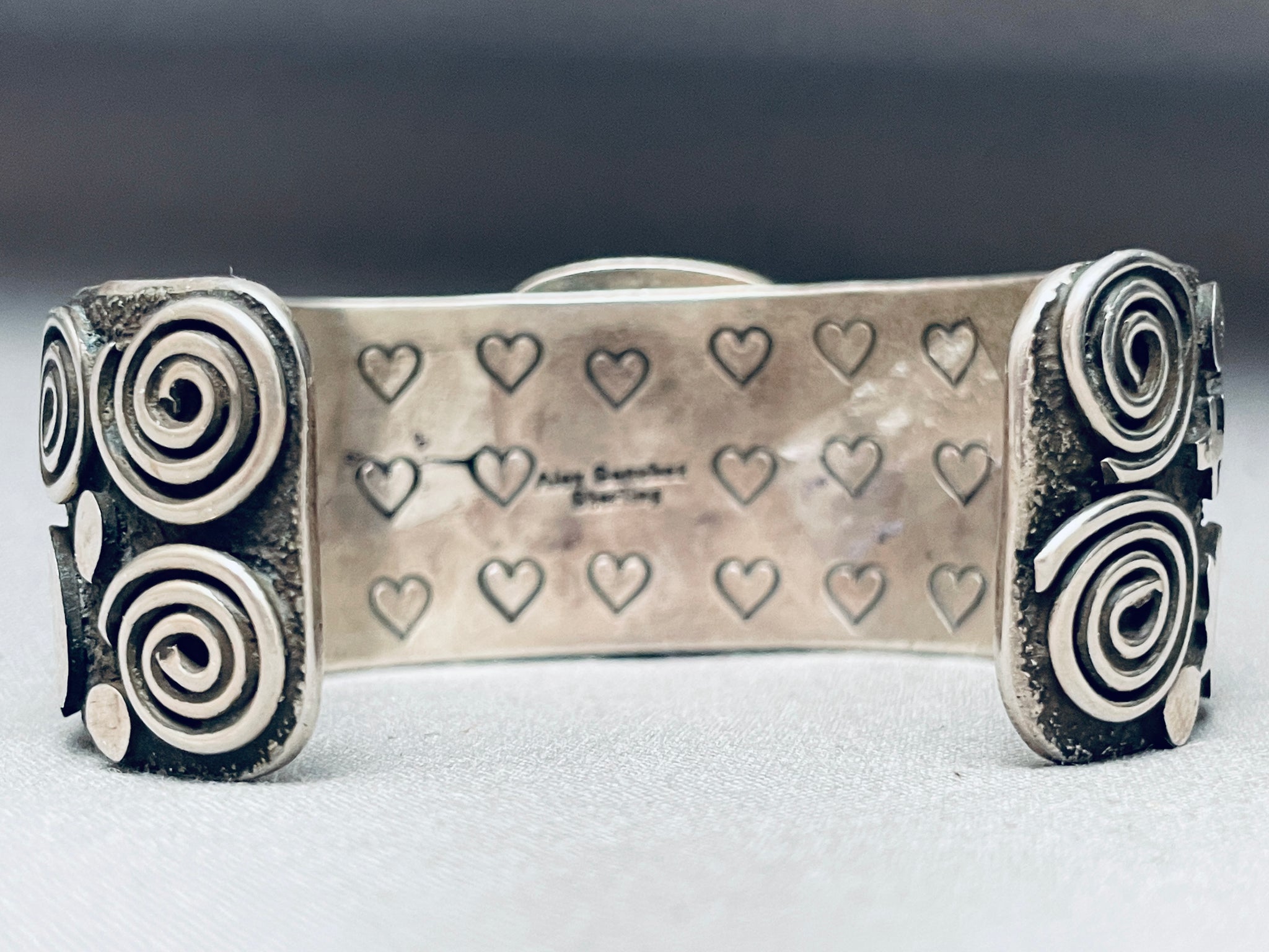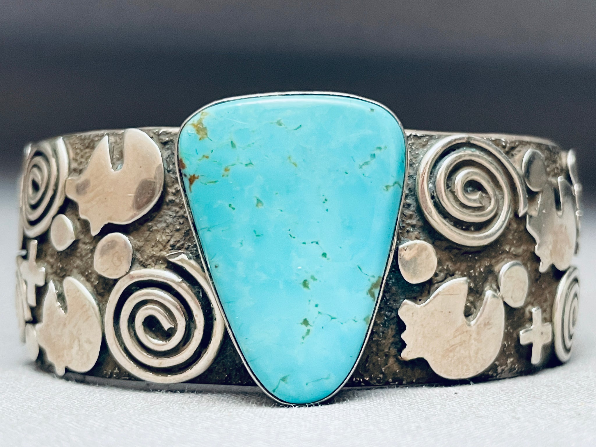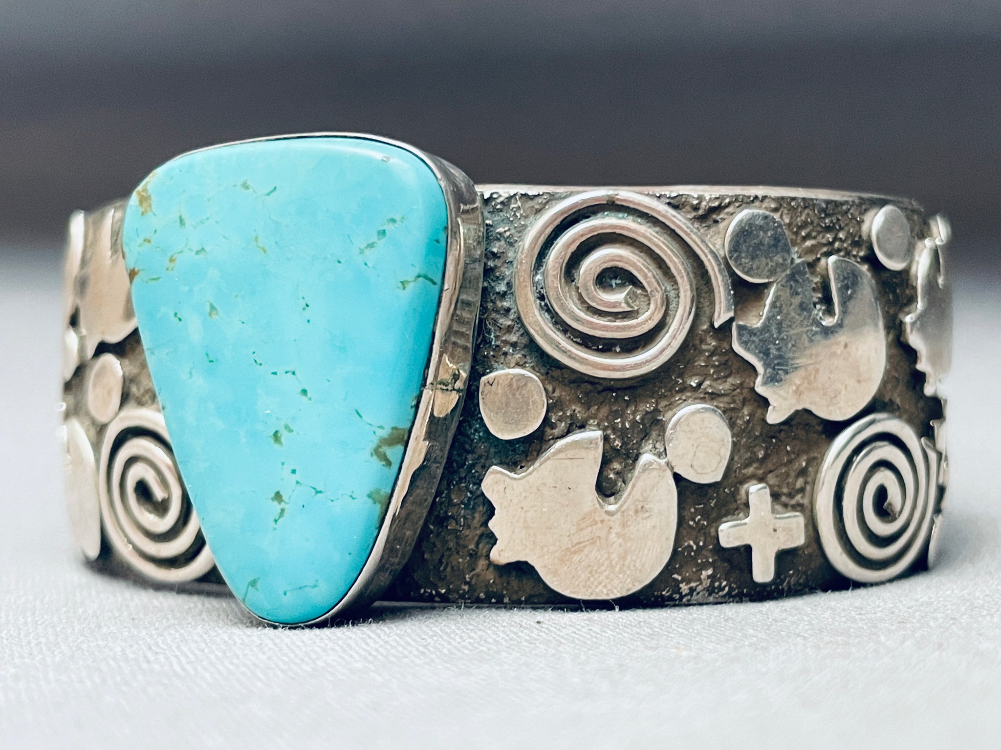 Heart & Petroglyph Vintage Native American Navajo Turquoise Sterling Silver Bracelet