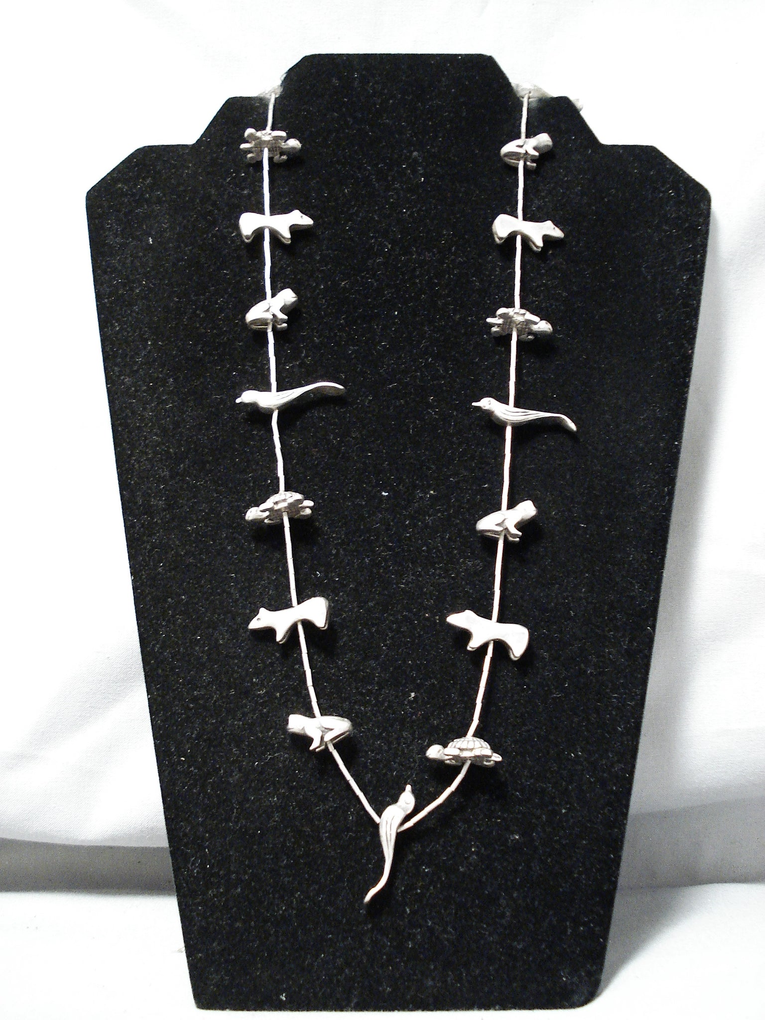 This is an incredible vintage Navajo all silver fetish necklace. This amazing necklace is absolutely unique as it is a solid sterling silver fetish necklace. The necklace consists of 17 superior hand carved and very intricate silver fetishes that include birds, turtles, foxes, and frogs. Situated throughout the entire necklace are wonderful silver heishi with a traditional silver clasp. Sterling silver. Cir. Mid century . The length of the necklace measures around 30". Sturdy 98 grams.