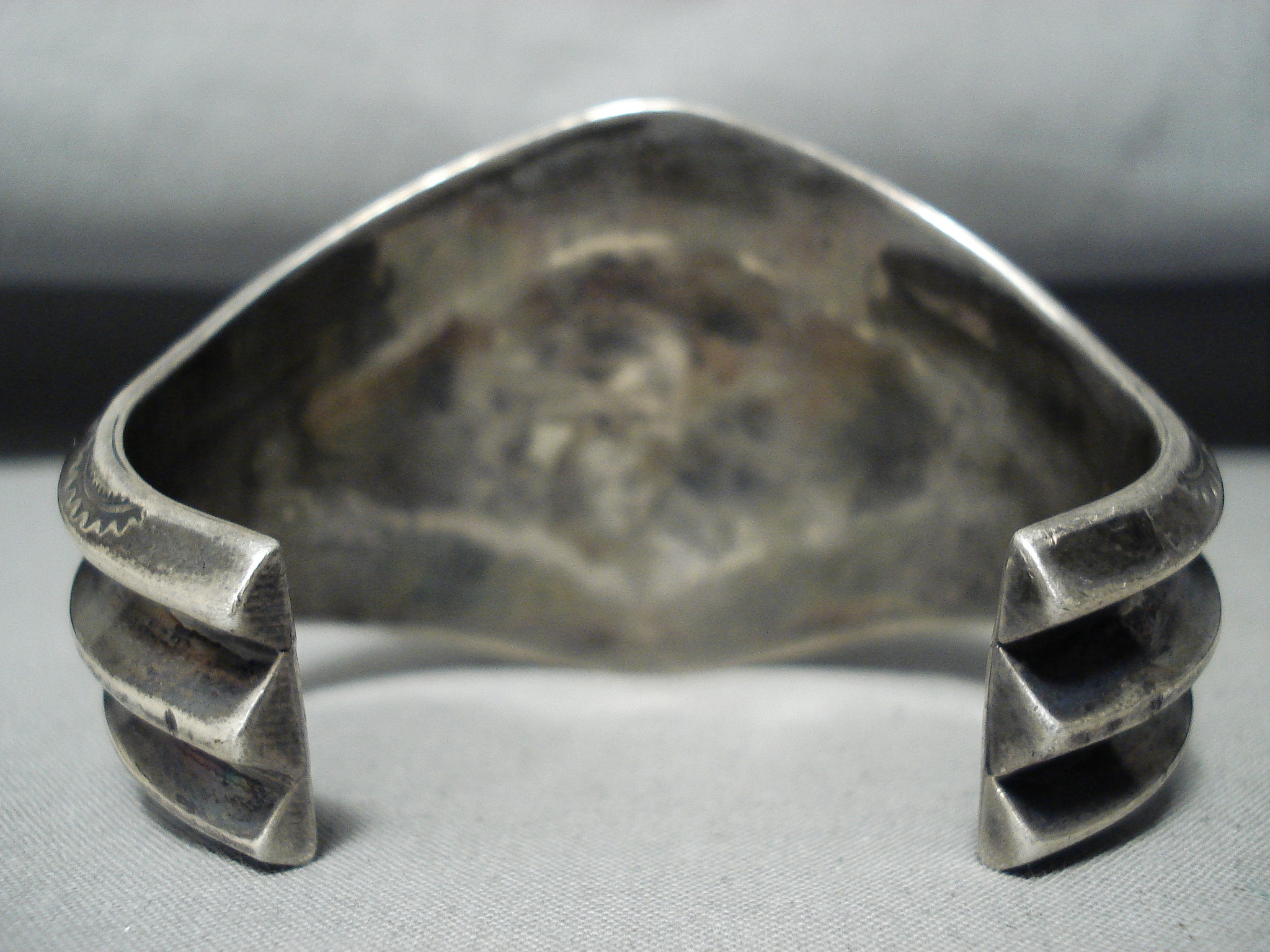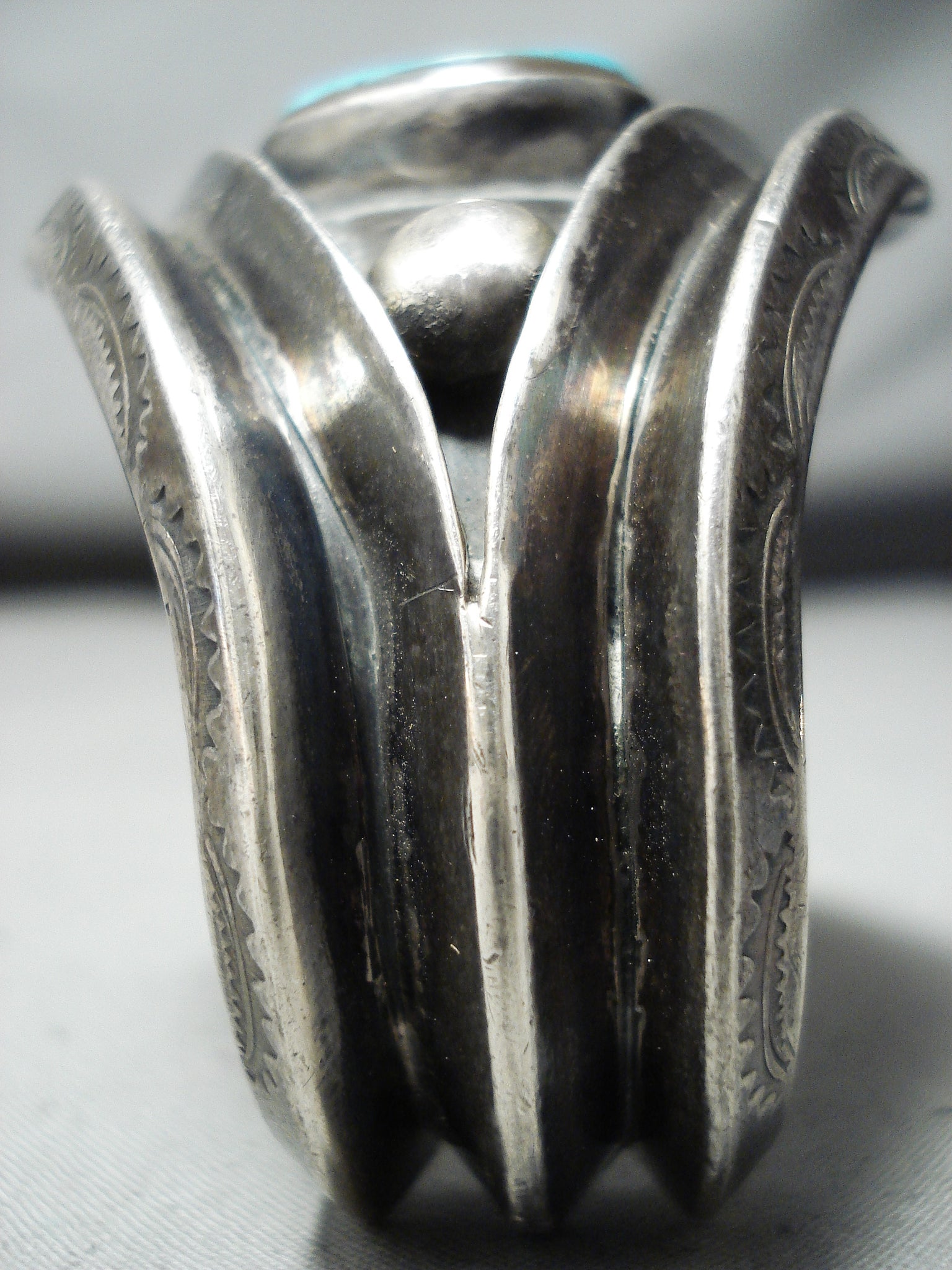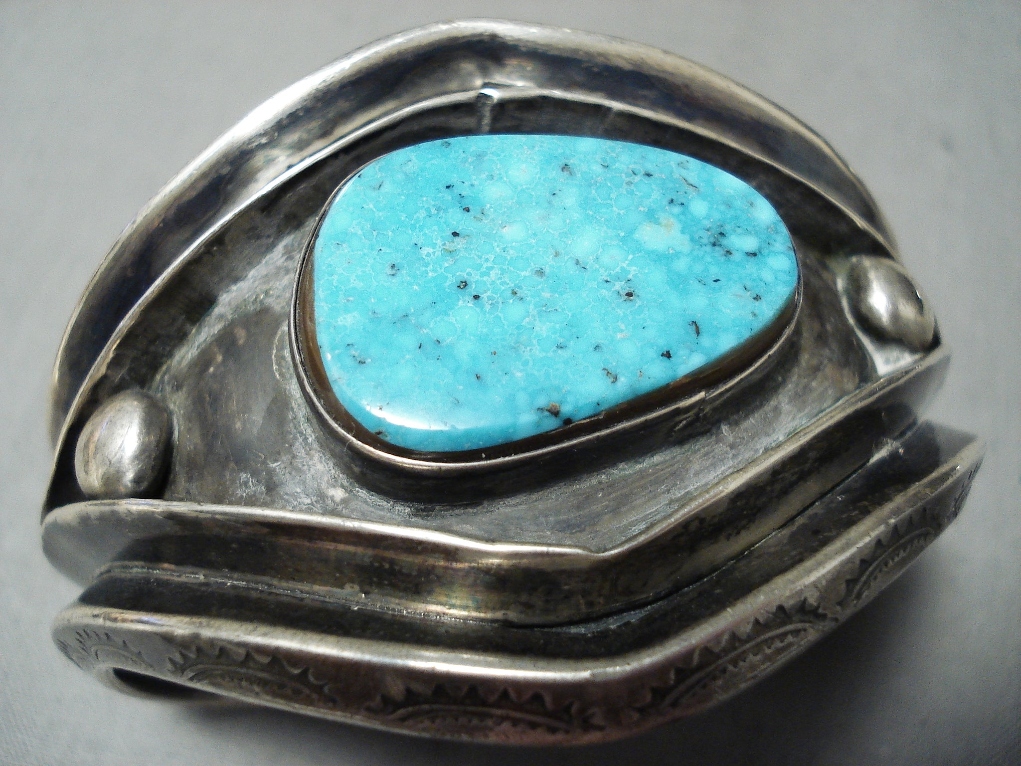 This is an astonishing vintage Navajo large single stone very heavy and thick silver bracelet. This beautiful waving silver cuff bracelet contains a marvelous center turquoise stone that appears to be from the impeccable Morenci turquoise mine. Bordering the cuff are phenomenal deep and thick silver segments along with accenting silver sun stampings that run from one end to the other. Resting at both sides of the stone are outstanding large silver raindrops. This bracelet is just amazing! The center stone measures around 1-1/8" x 3/4". The width of the bracelet measures around 2". Sterling silver. Cir. Mid century . The inside end to end measures around 5-1/2" with an additional 1-1/2" gap. Sturdy 120 grams.