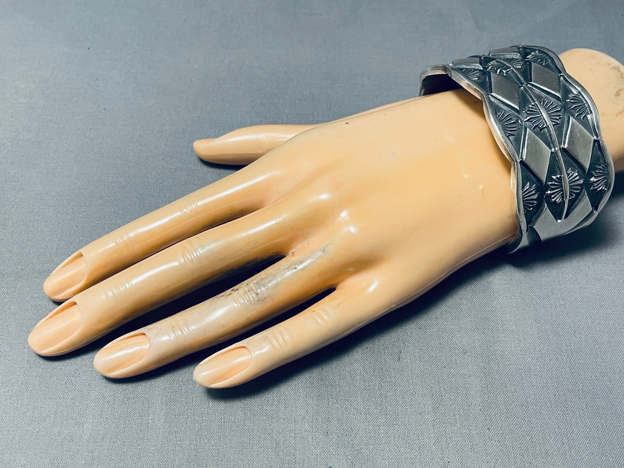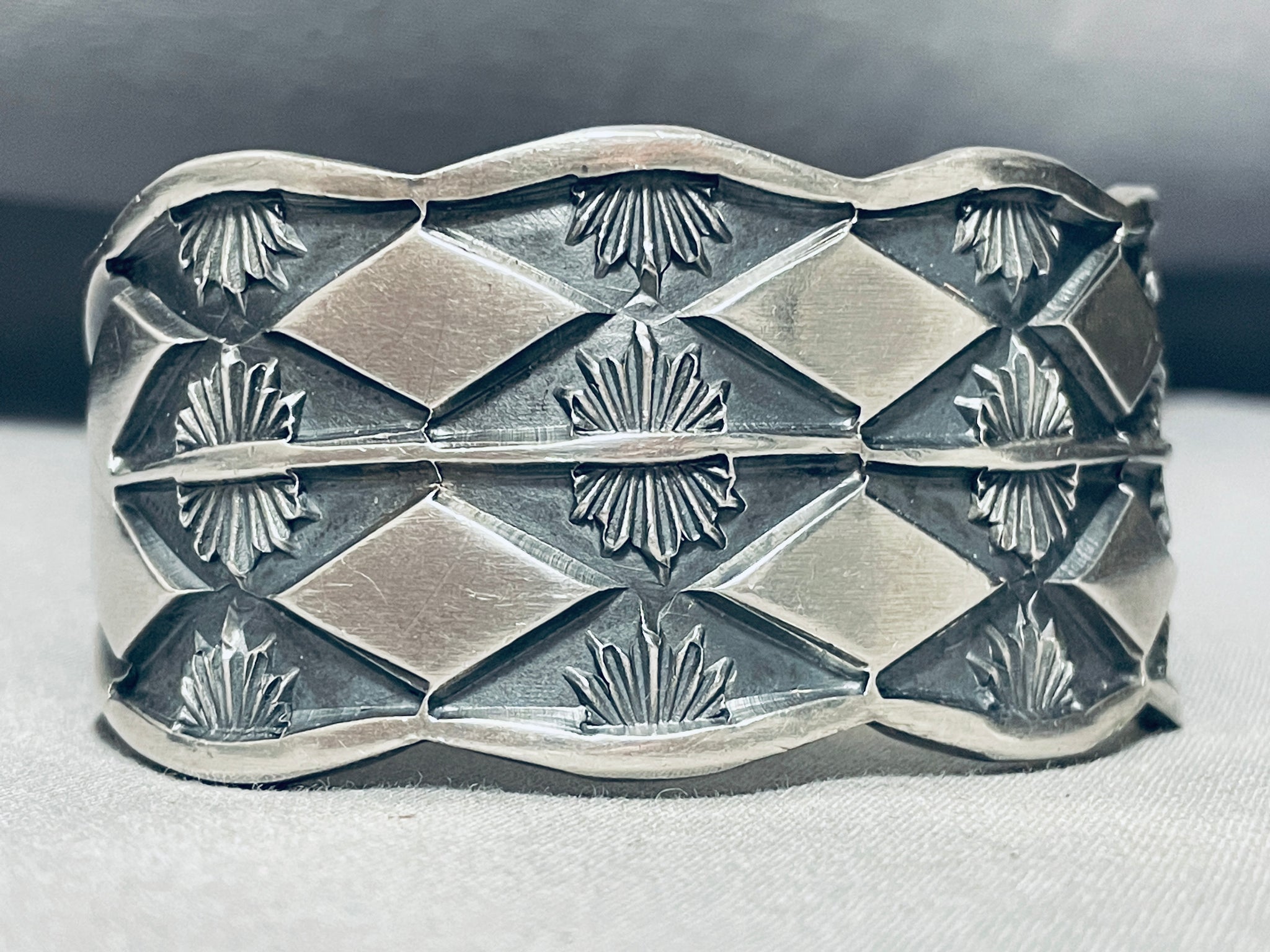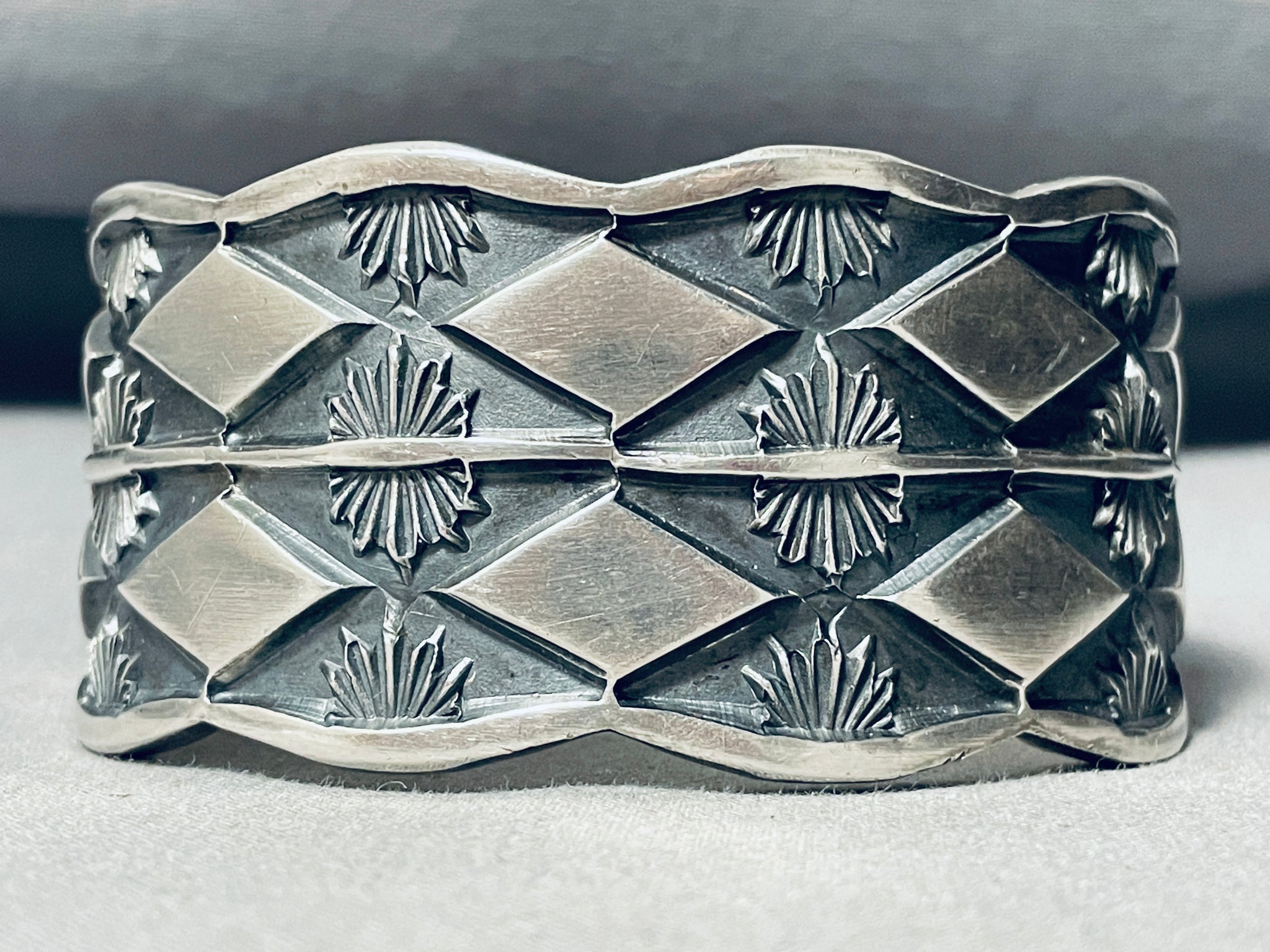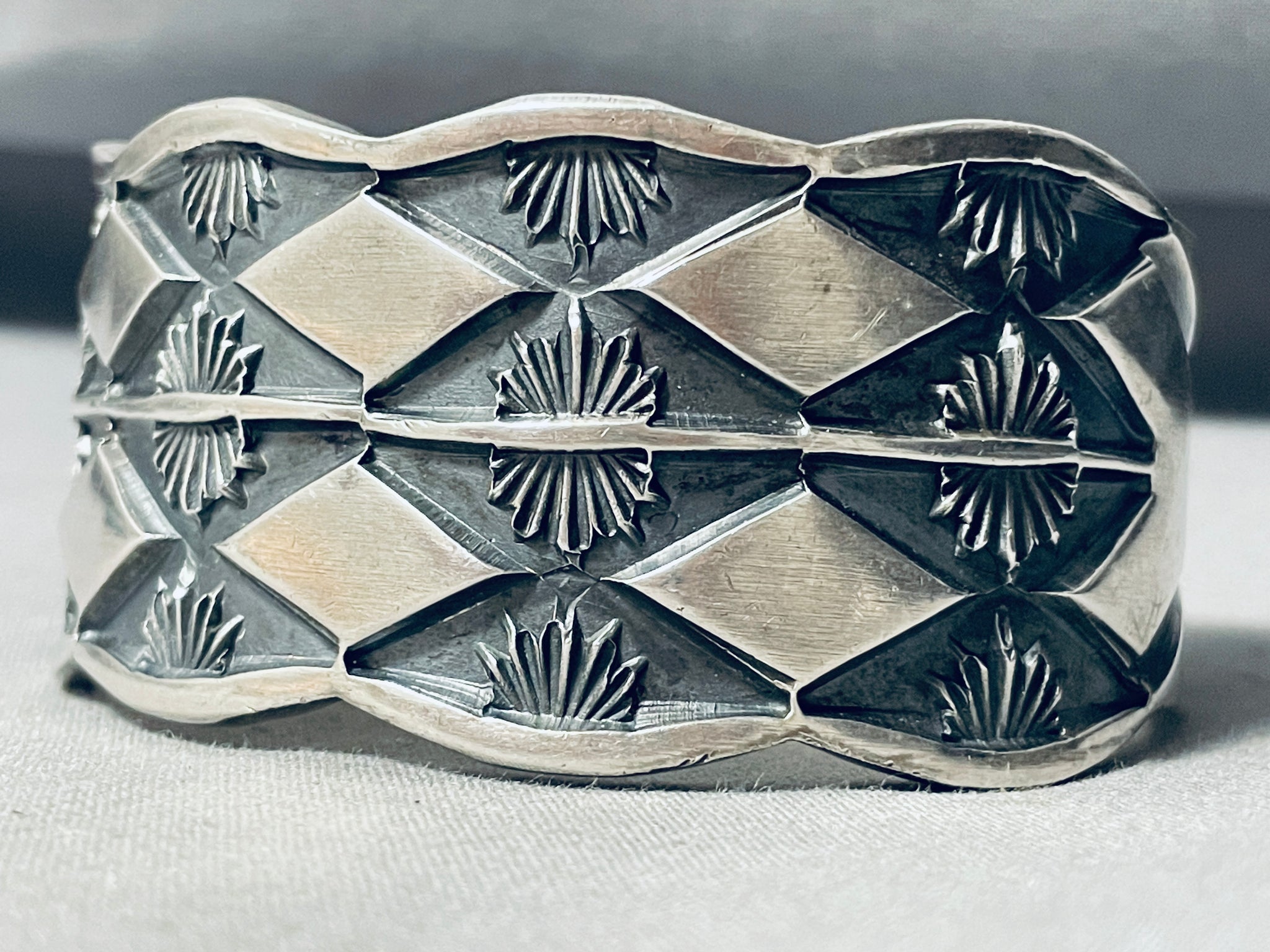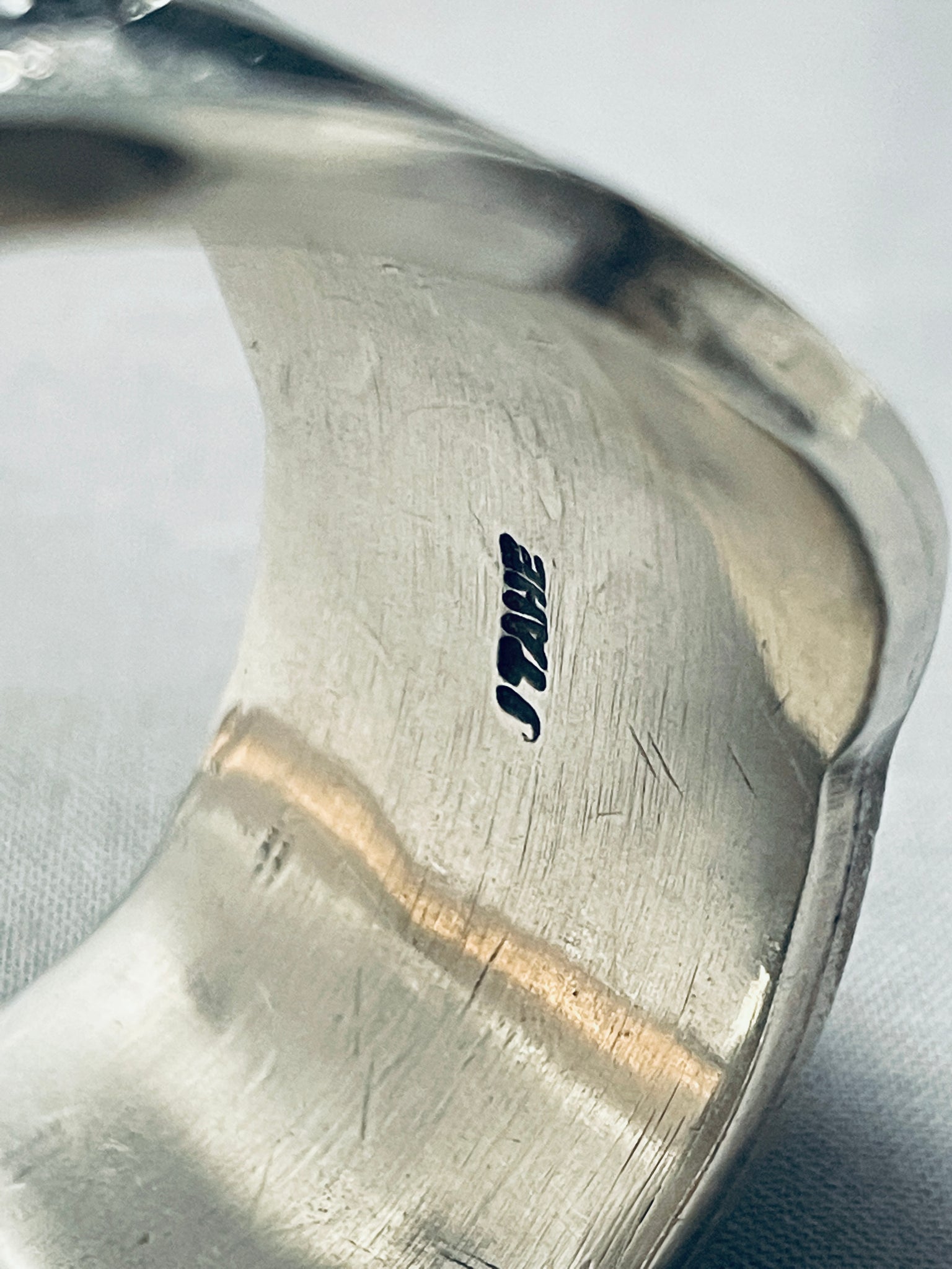 This is a magnificent vintage Navajo all silver cuff bracelet. This remarkable bracelet contains a very thick and wide silver cuff. The edges of the cuff beautifully wave from one end to the other giving the bracelet that much more character. Running throughout the cuff are impressive silver works that consist of protruding diamond patterns, star plant patterns and line segments with end sun bursting patterns. Such a fabulous bracelet. The width of the bracelet measures around 1-3/8". Signed by Navajo artist, J. Tahe. Sterling silver, marked. Cir. 1970's+. The inside end to end measures around 6" with an additional 1-1/4" gap. Sturdy 130 grams.