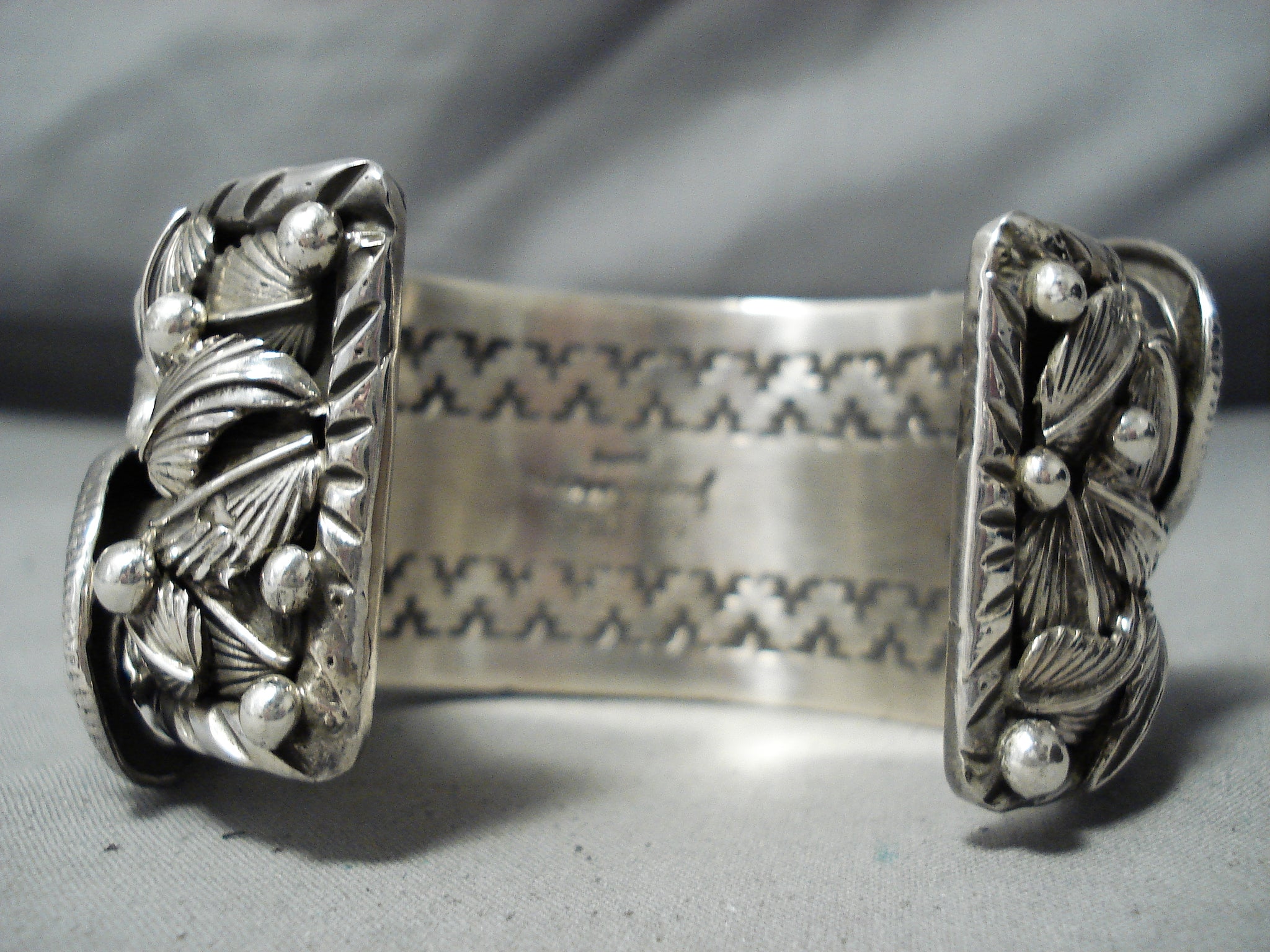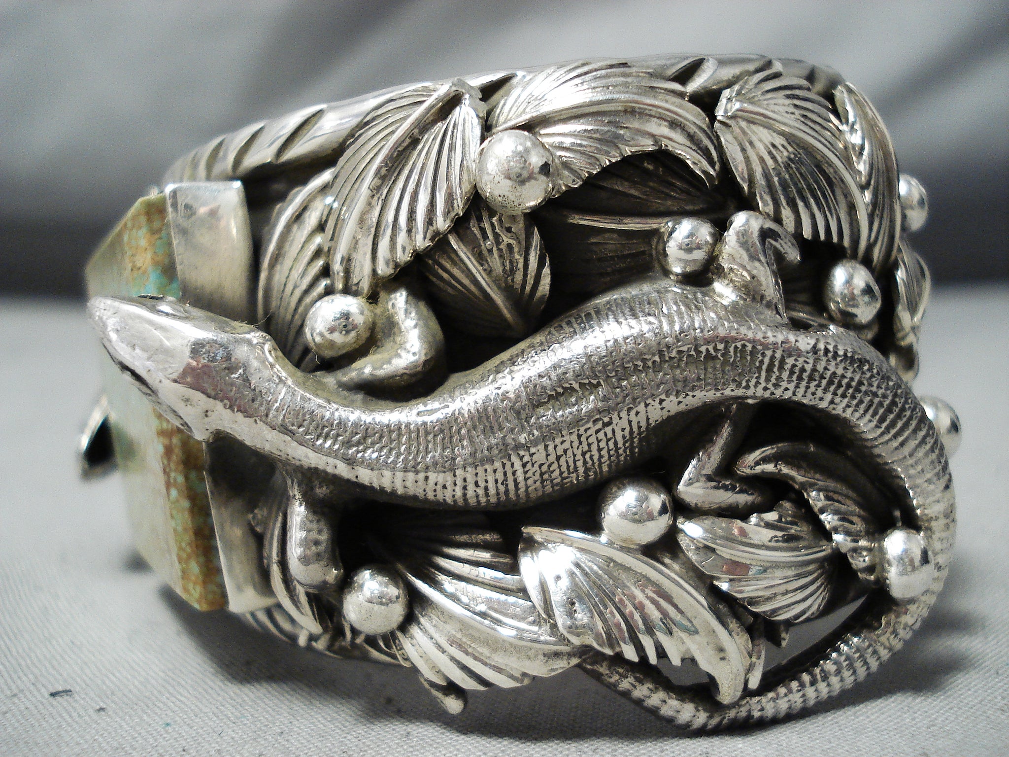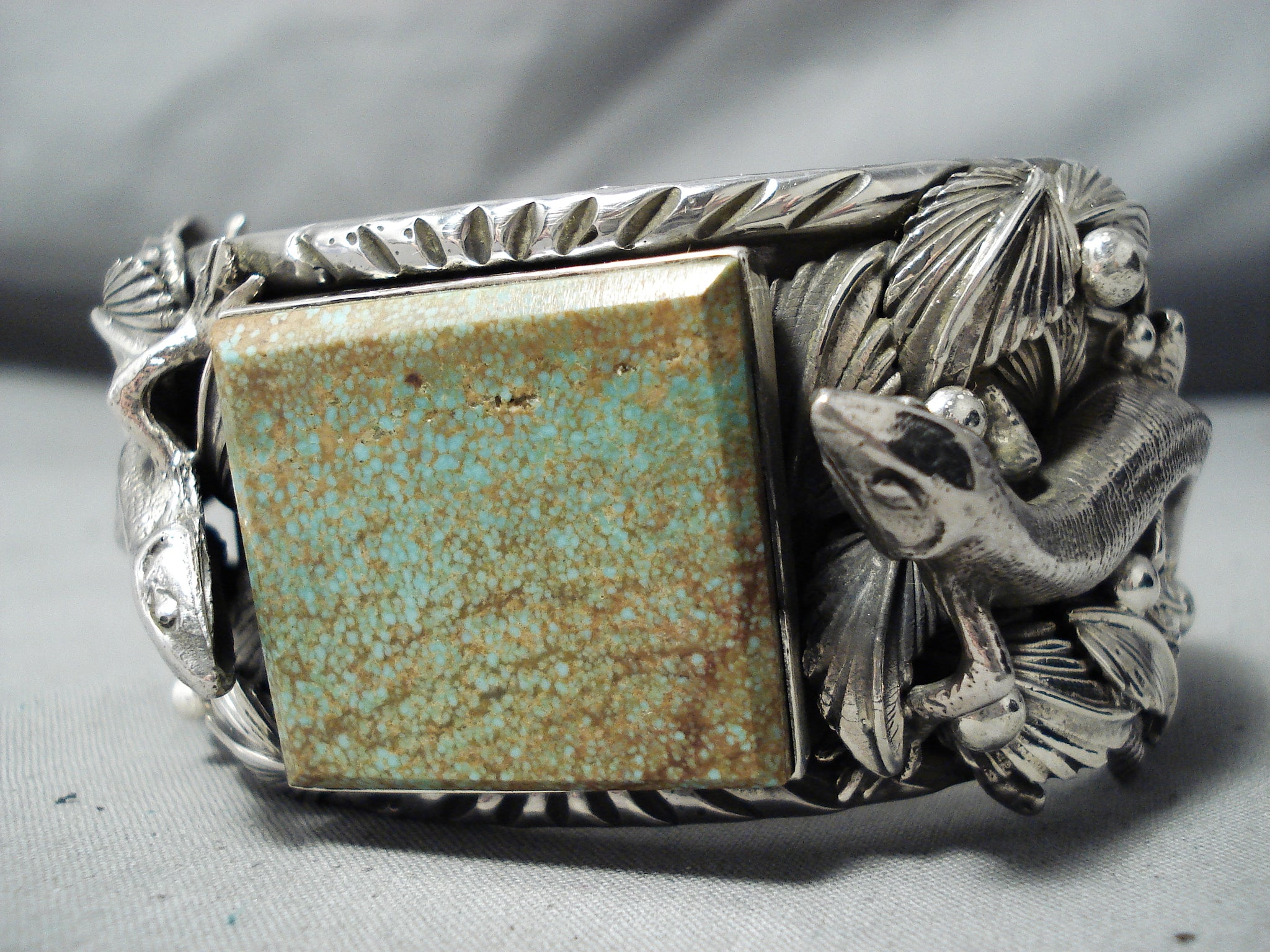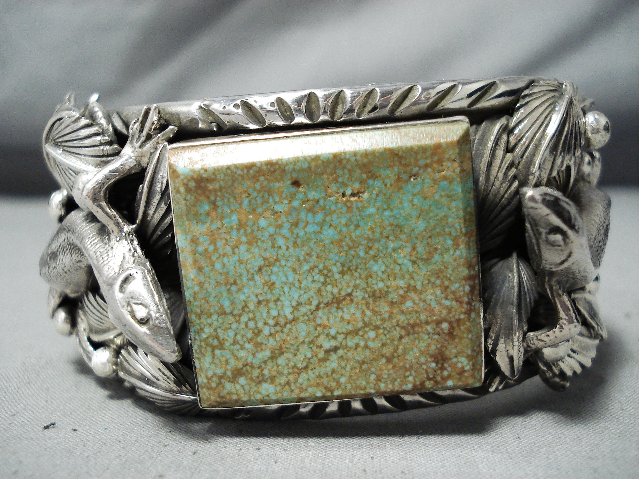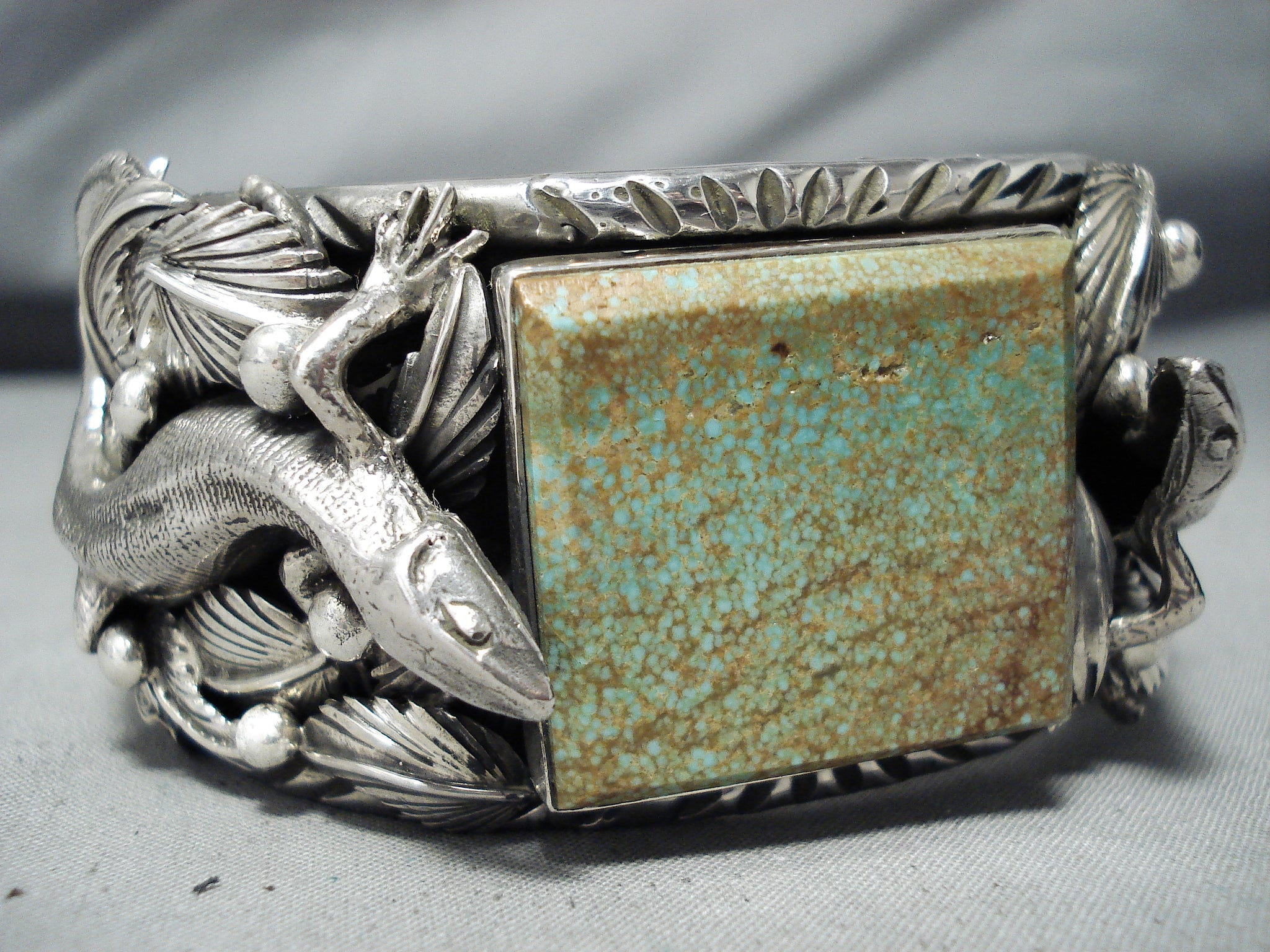 We are proud to offer this magnificent San Felipe silver bracelet having an enormous #8 turquoise square cut center with 2 huge intricately handcarved silver gekkos, curved silver leaves and silver beads on the handcarved solid silver cuff with silver handstamped rug designs on the inner cuff! Absolutely Incredible Piece! Silver gekkos measure around 2-1/4" x 1-1/8". The center stone measures around 1-1/4" x 1-1/8". The width of the bracelet measures around 1-1/2". Signed by San Felipe artist, Jake Francosa. Sterling silver, marked. The inside end to end measures around 5-3/4" with an additional 1-3/8" gap. Sturdy 184 grams.