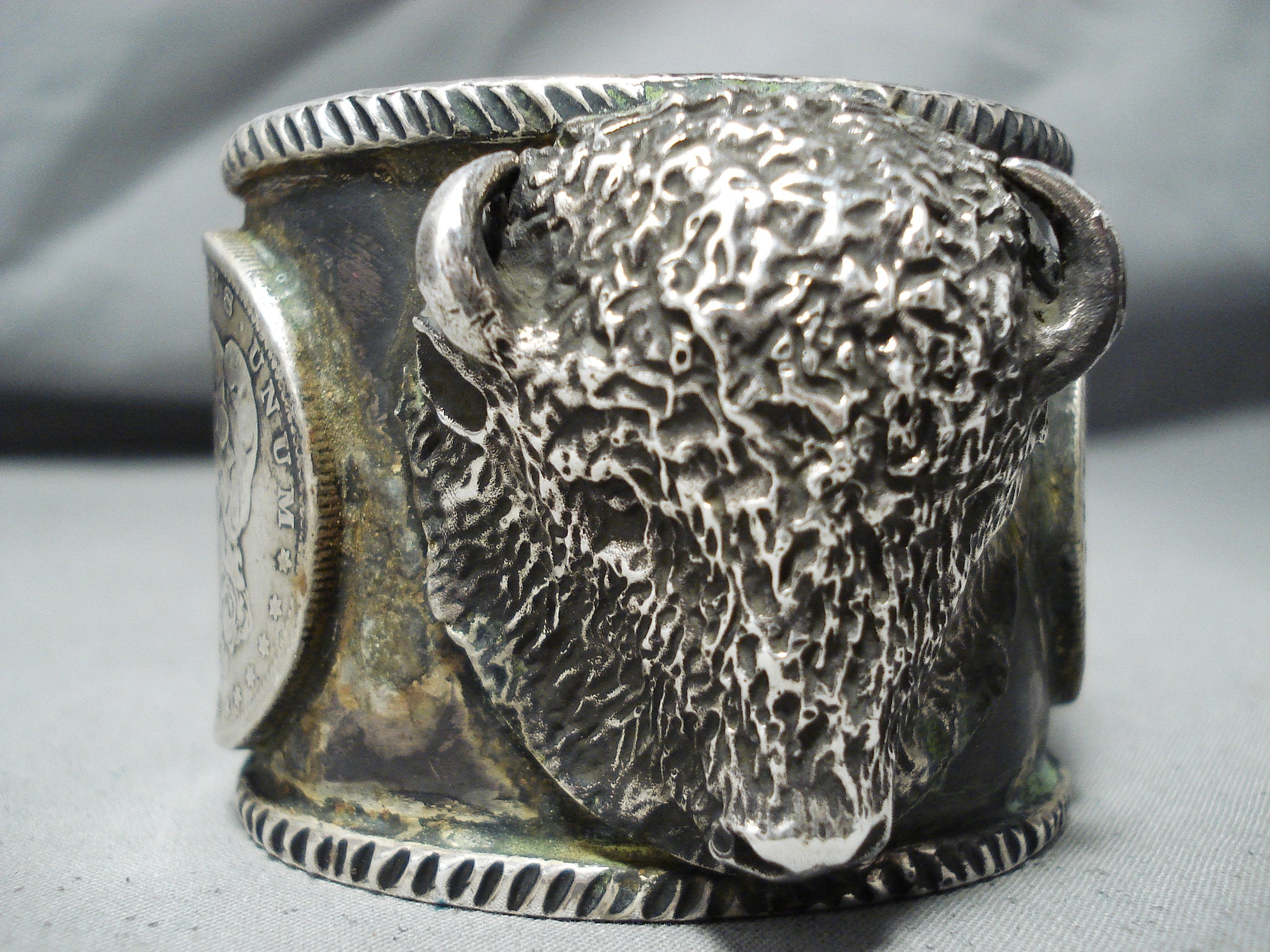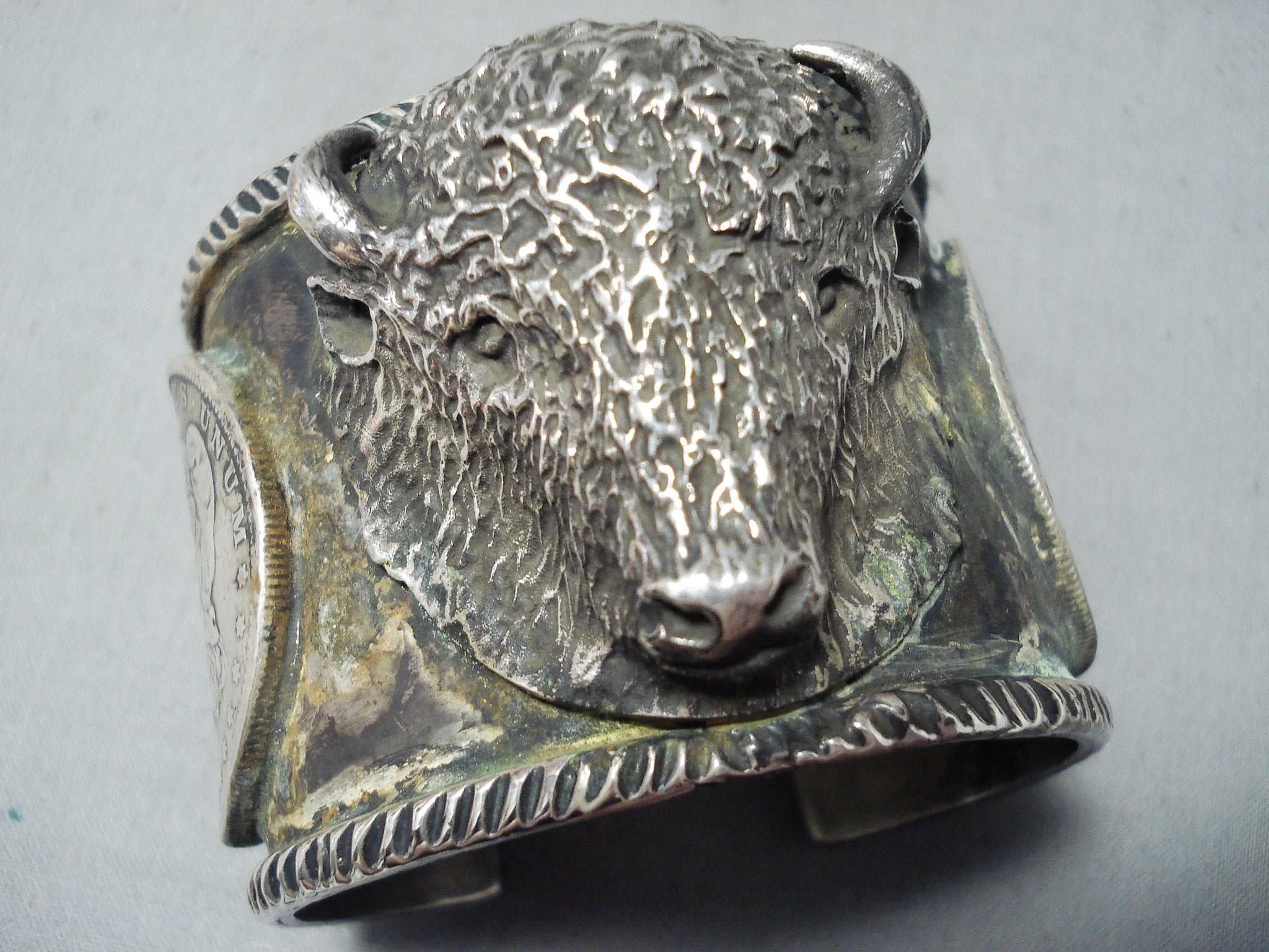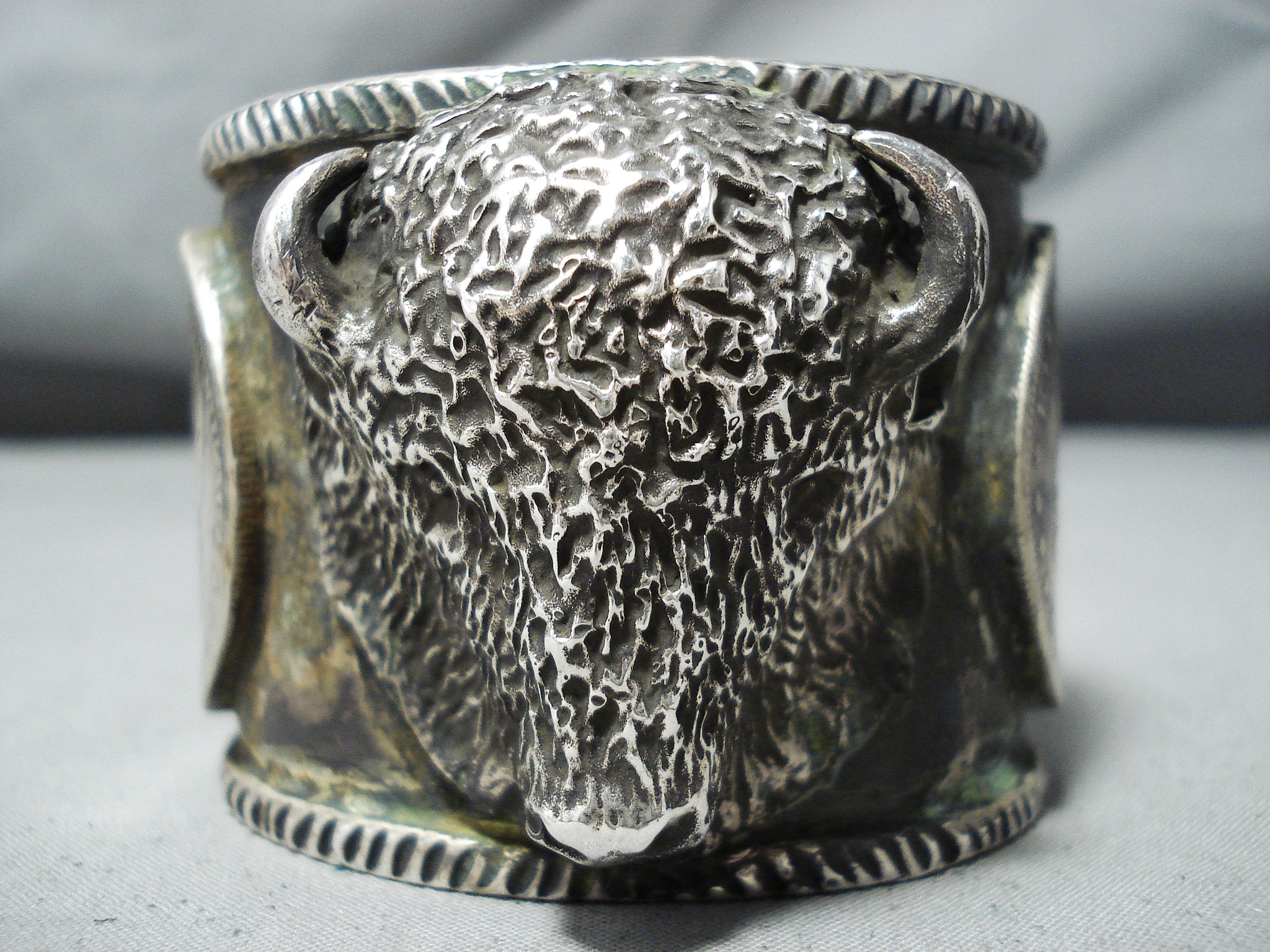 Heavy 221 Grams Native American Navajo Buffalo Sterling Silver Coin Bracelet