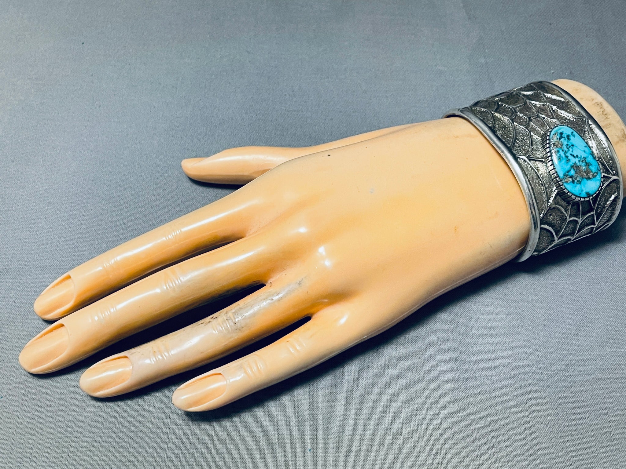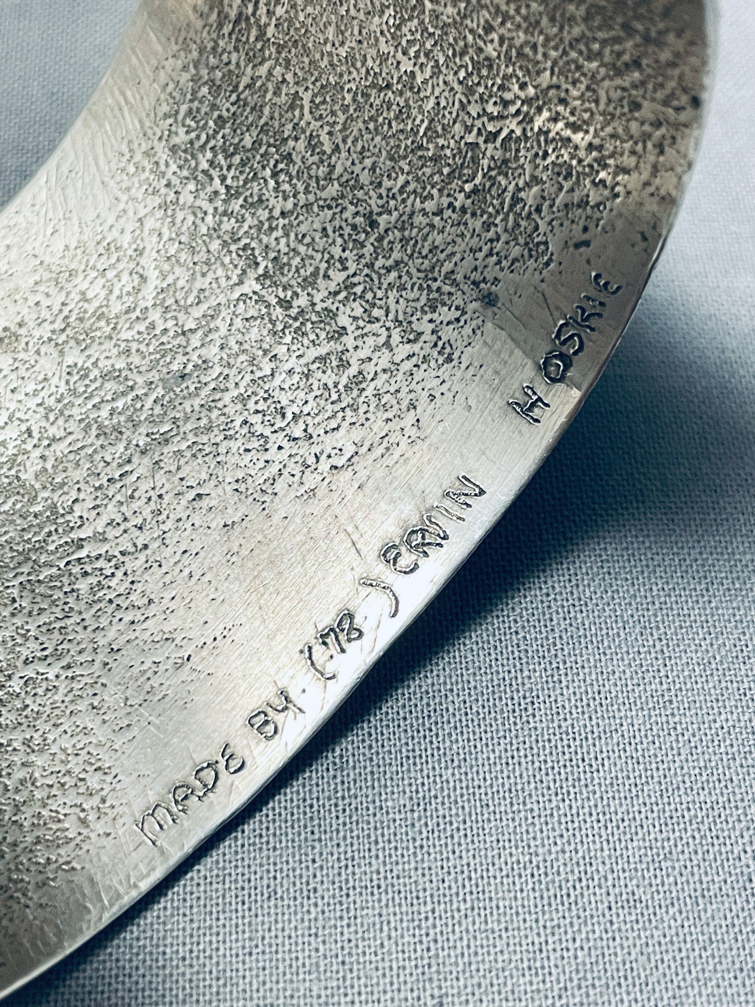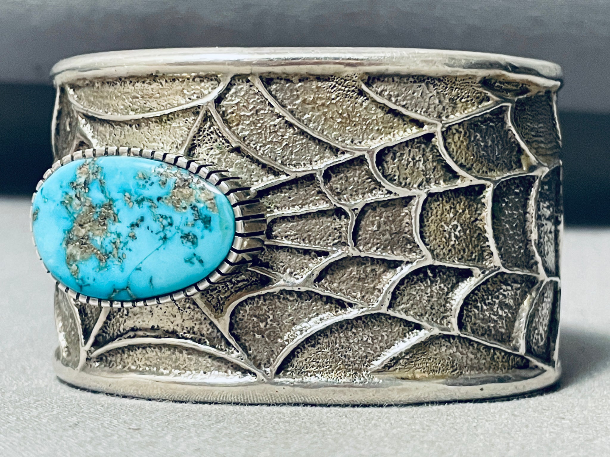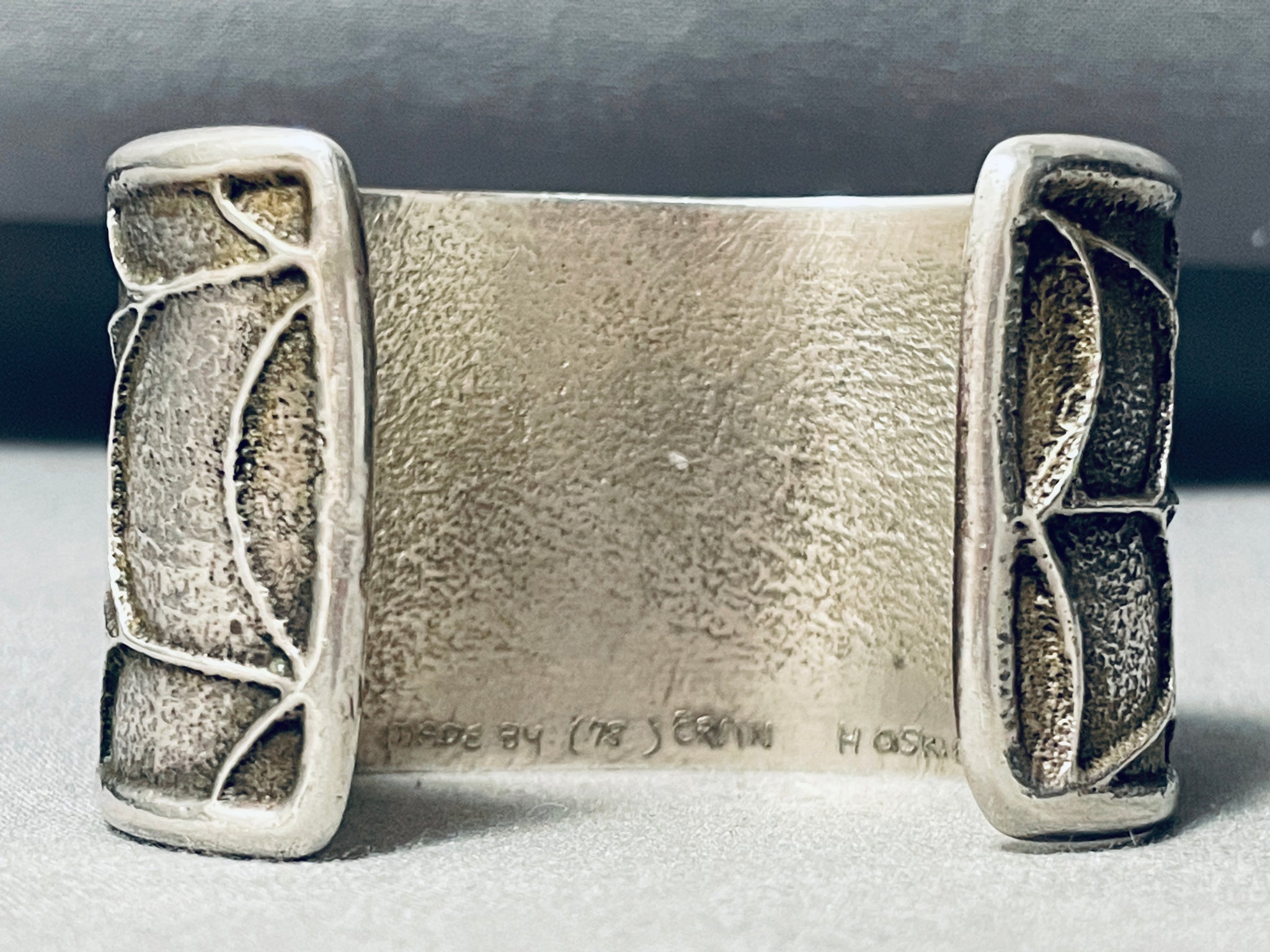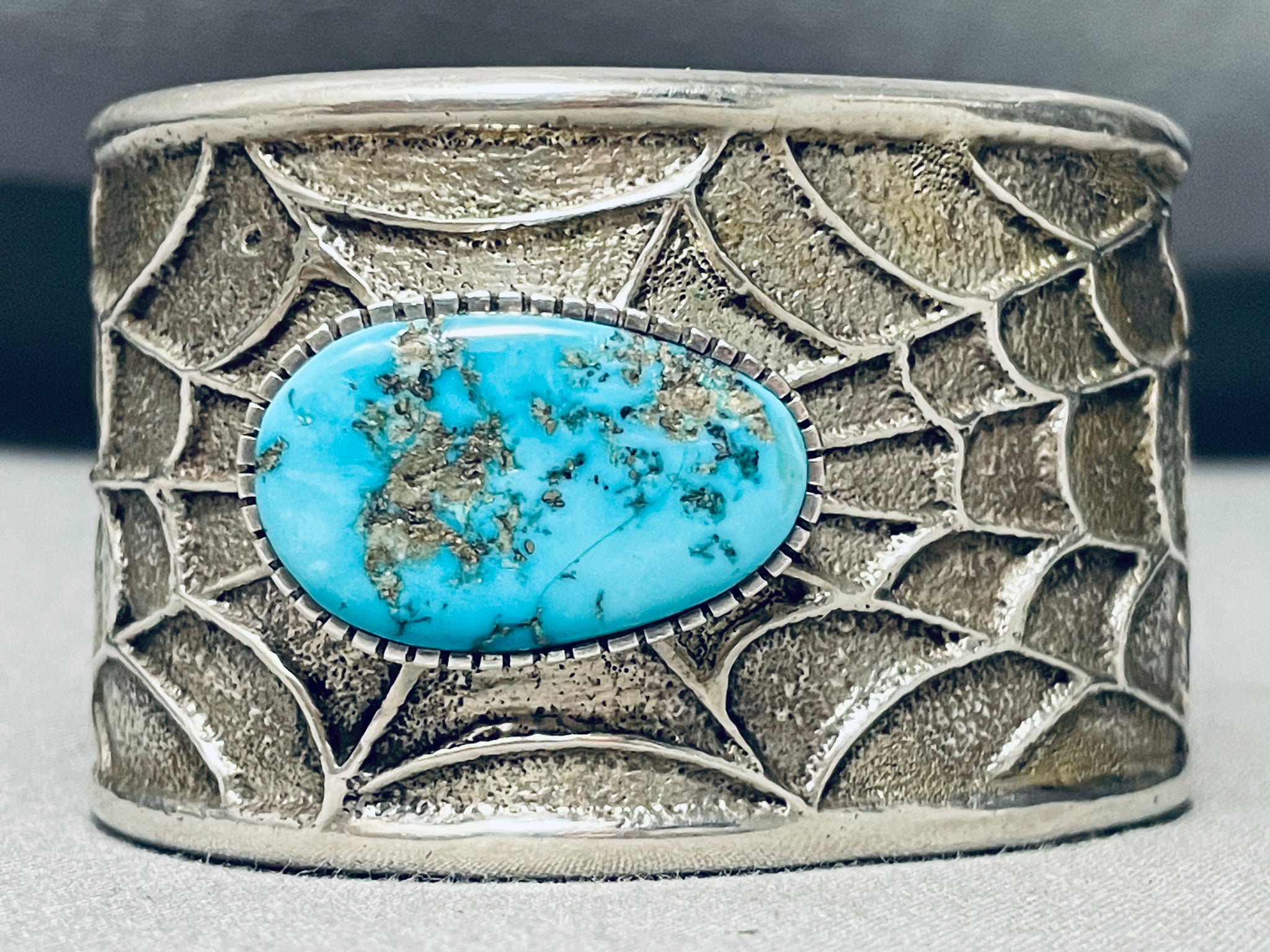 This is an amazing vintage Navajo single stone silver spiderweb designed bracelet. This outstanding bracelet contains a beautiful offset Old Kingman turquoise stone with a channeled silver bezel. The entire thick and wide cuff of this bracelet consists of a remarkable spdierweb pattern, absolutely incredible. I absolutely love the textured silver cuff in the background of the spiderweb. The edges of the cuff wonderfully protrude out giving the bracelet that much more character. The center stone measures around 1" x 5/8". The width of the bracelet measures around 1-1/2". Signed by Navajo artist, Ervin Hoskie. Sterling silver. Cir. 1978. The inside end to end measures around 5" with an additional 1-1/4" gap. Sturdy 74 grams.