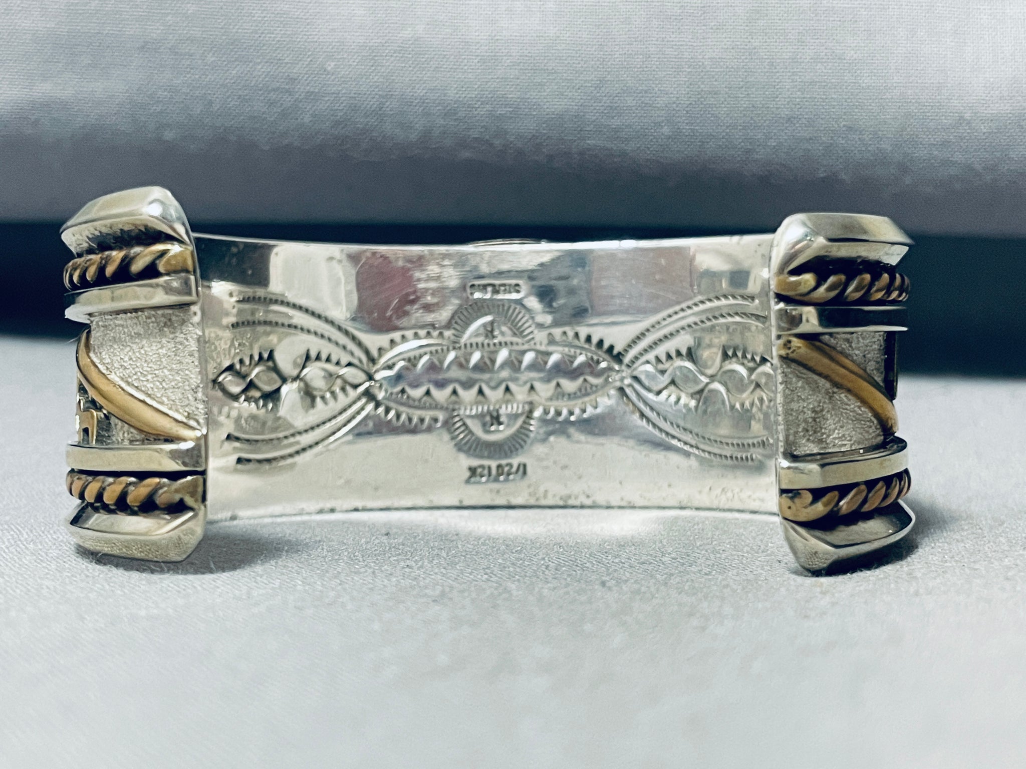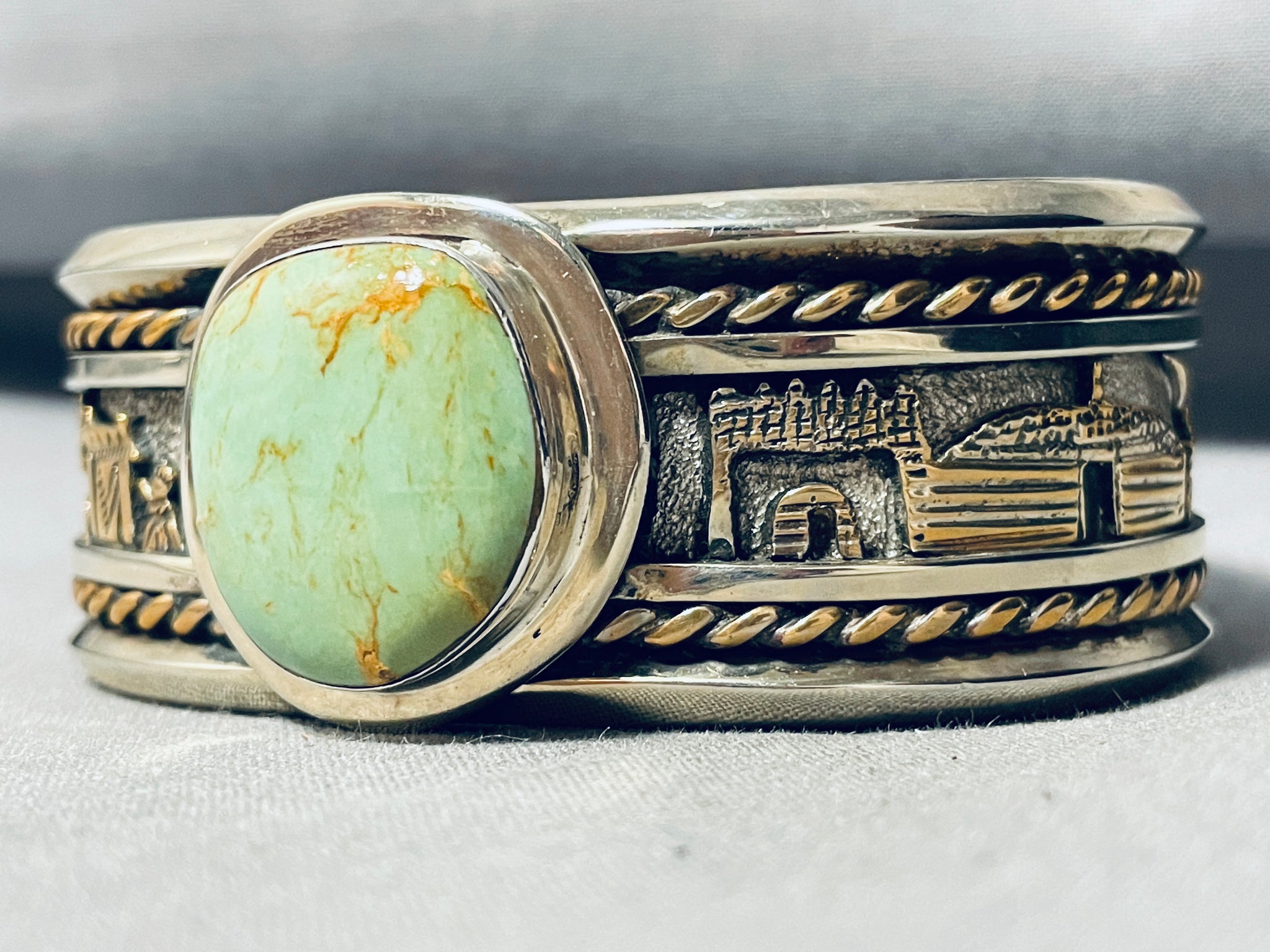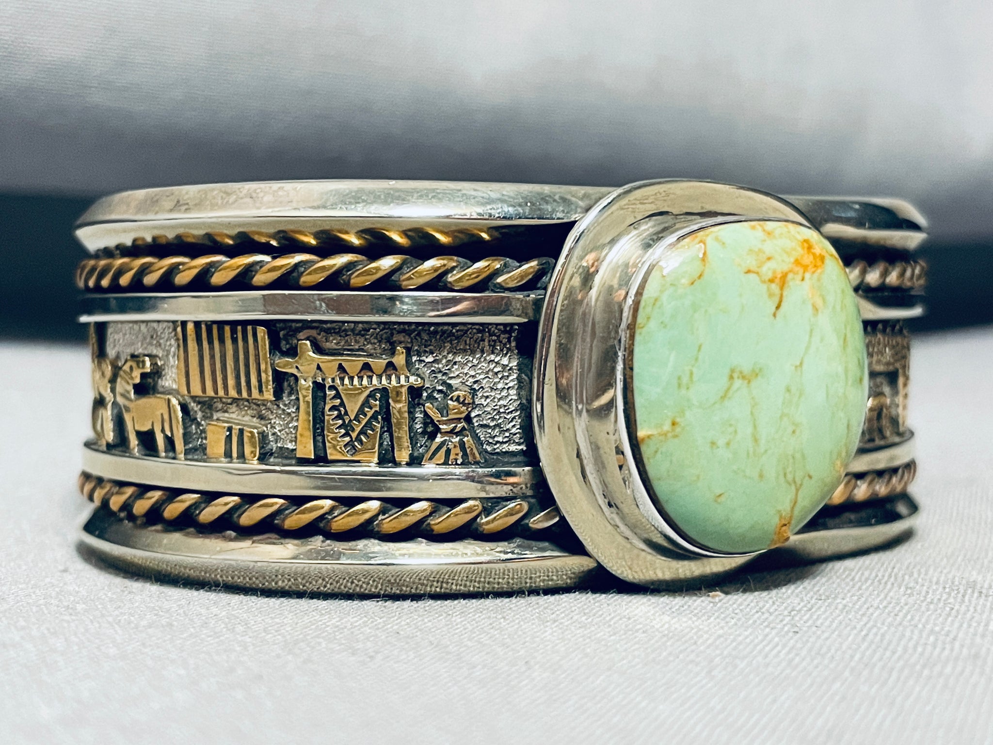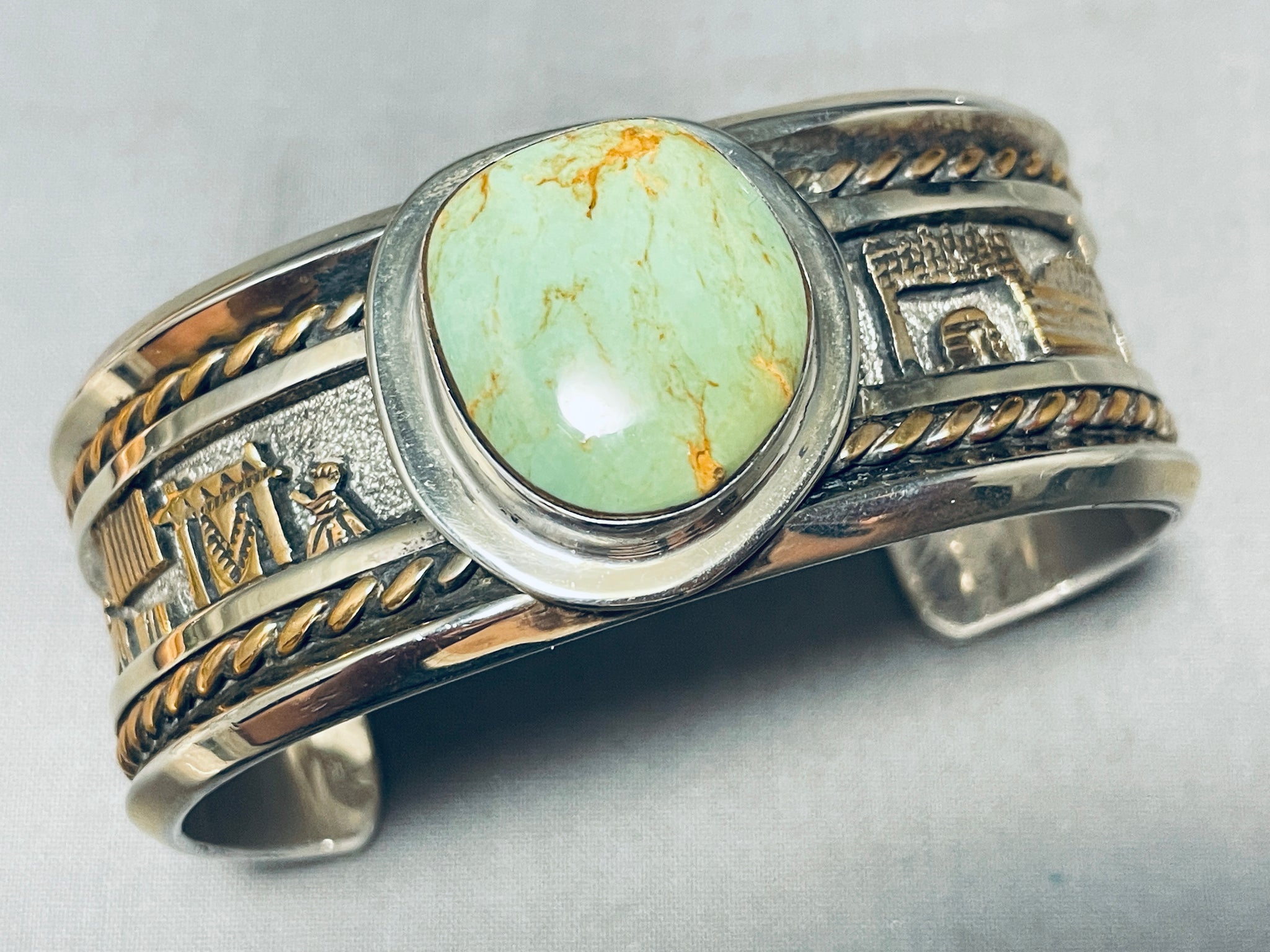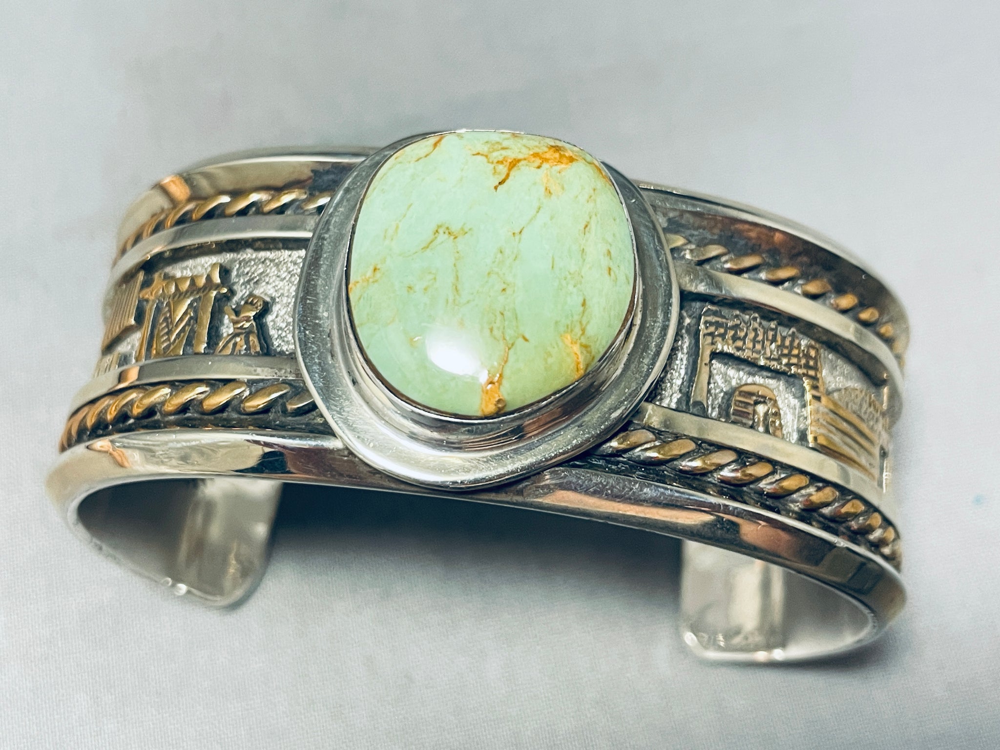 Heavy 89 Gram Native American Navajo Green Turquoise Sterling Silver Gold Bracelet