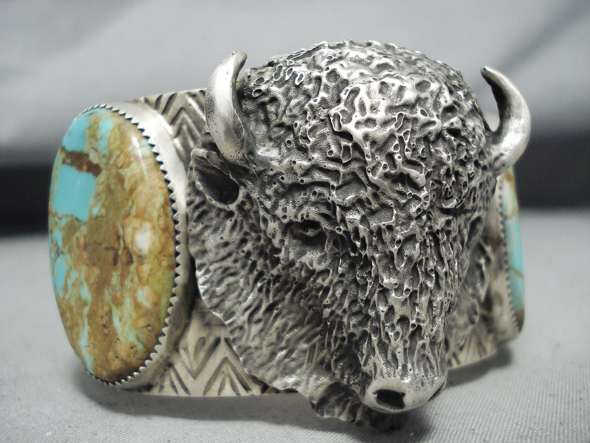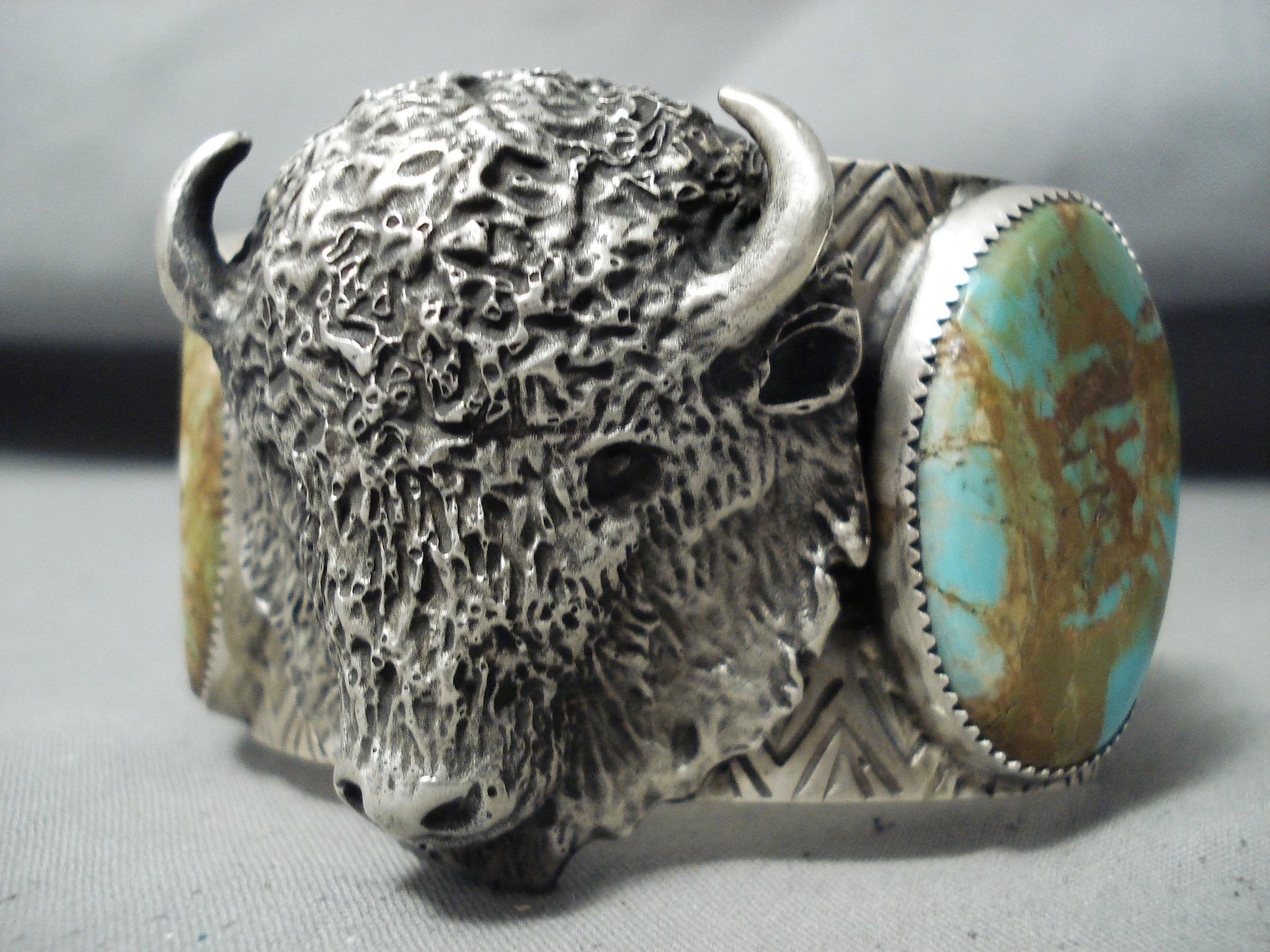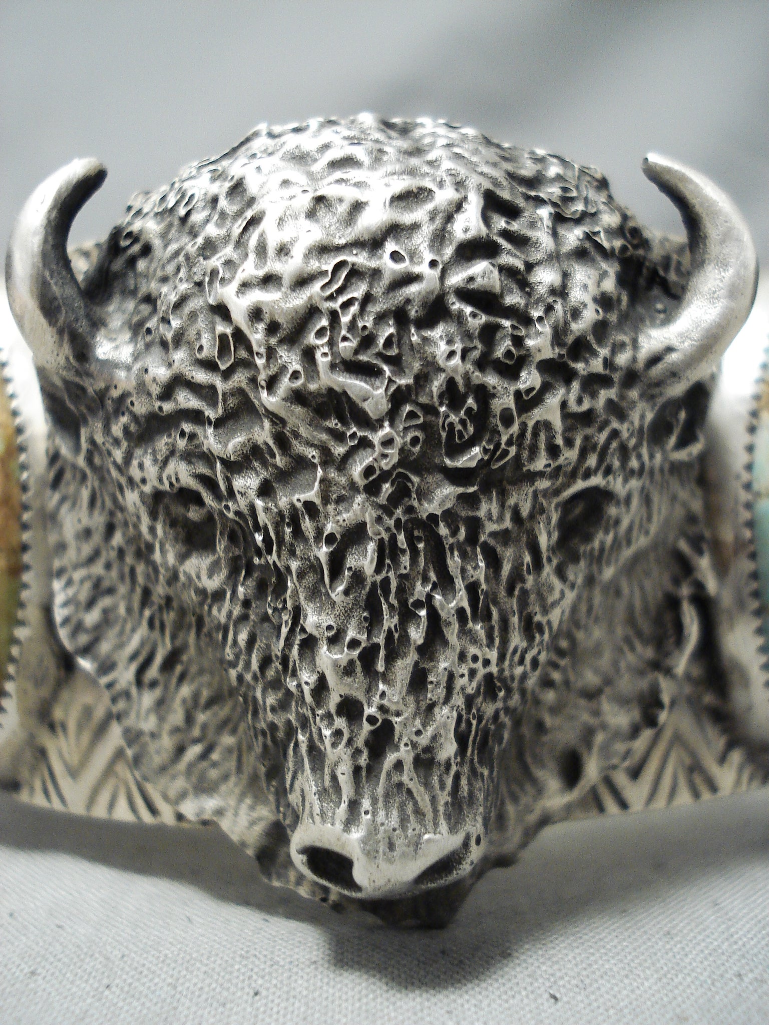 Heavy Buffalo Native American Navajo #8 Turquoise Mine Sterling Silver Buffalo Bracelet