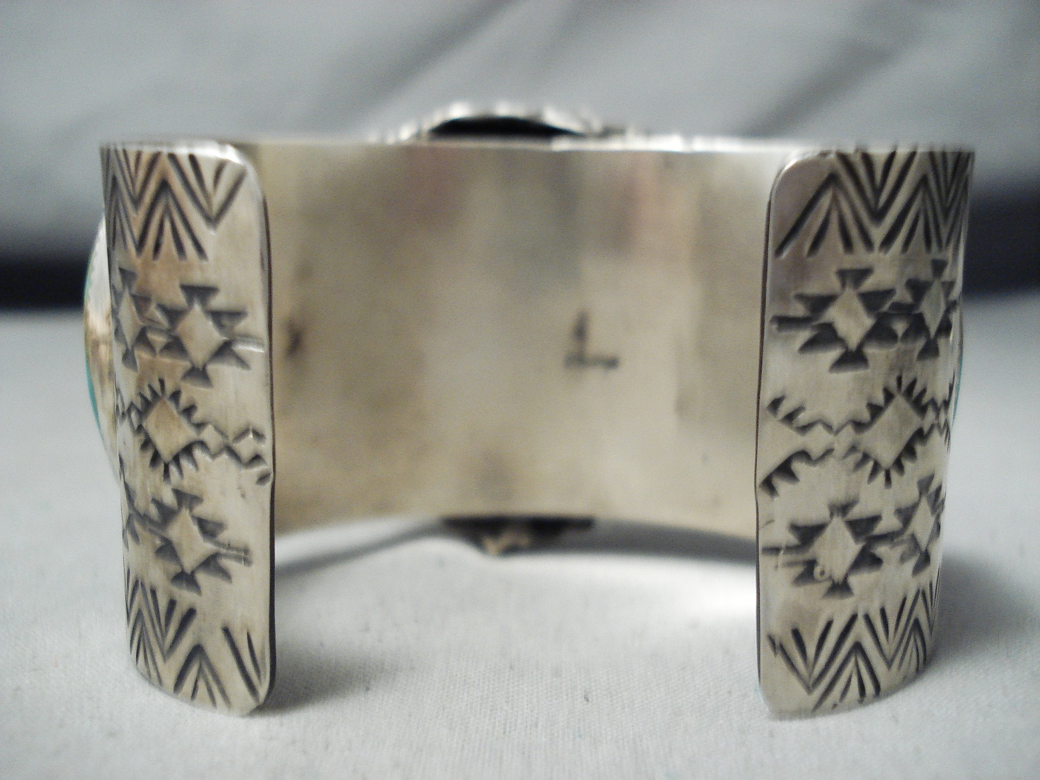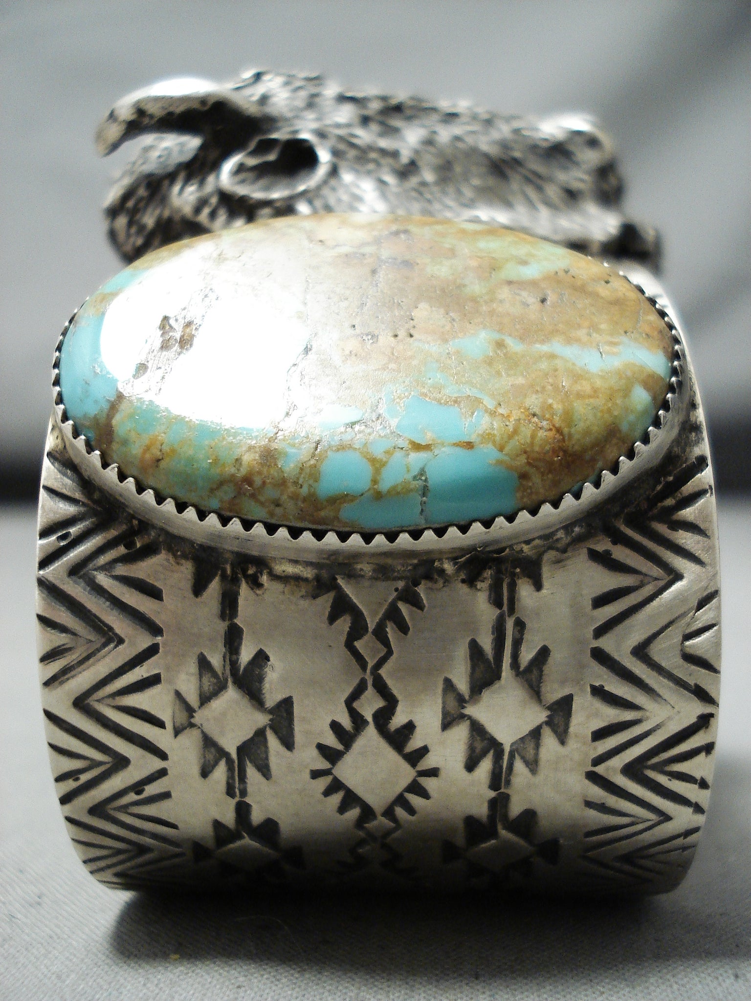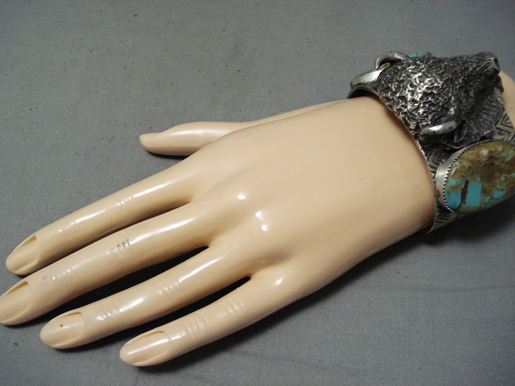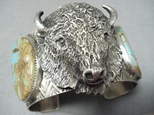 Heavy Buffalo Native American Navajo #8 Turquoise Mine Sterling Silver Buffalo Bracelet