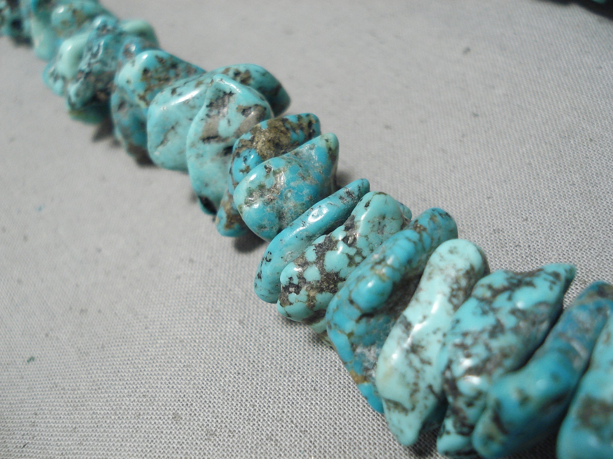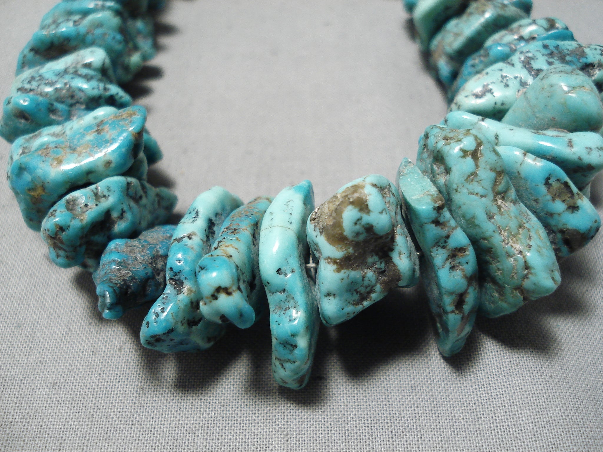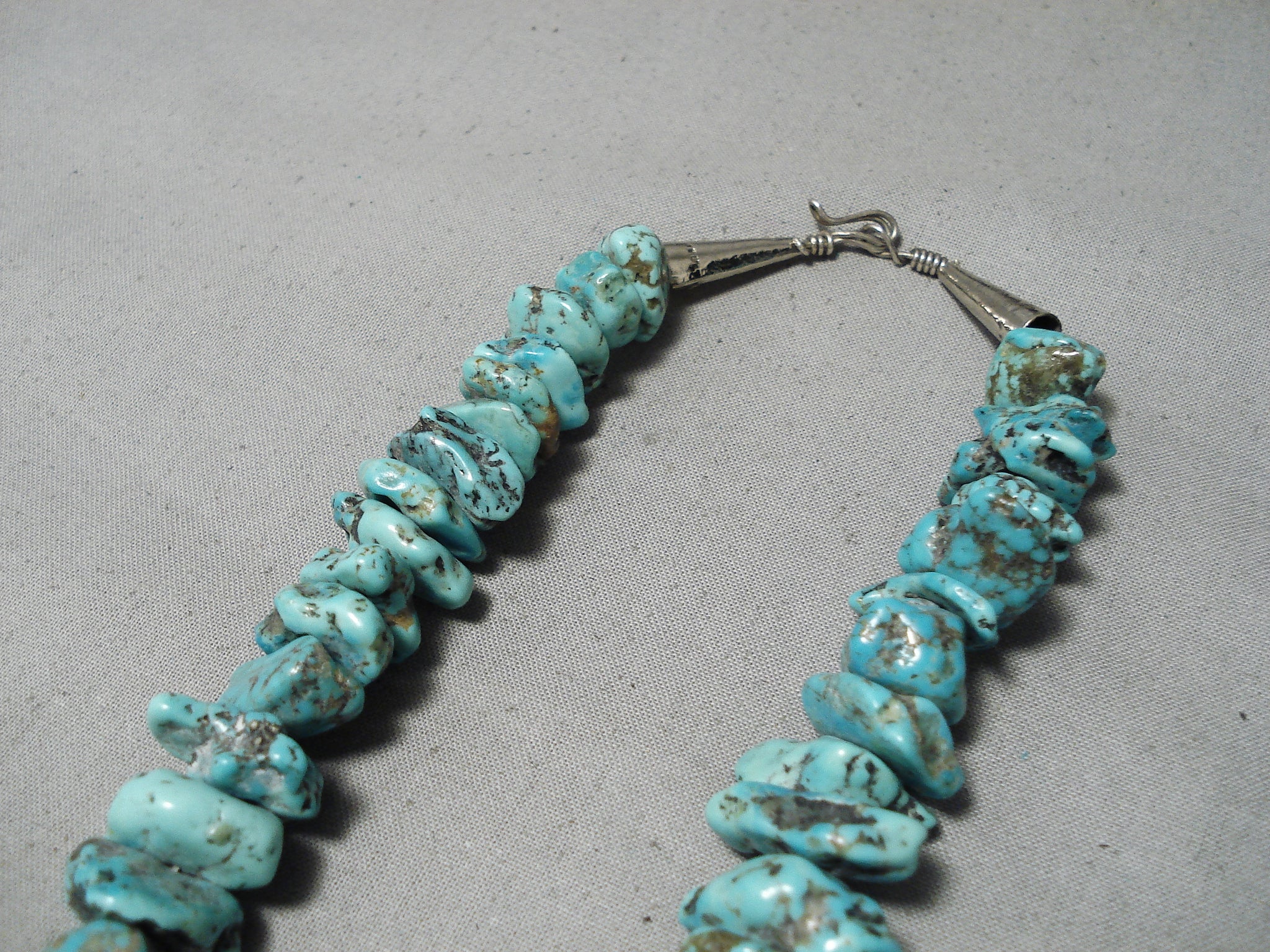 This is an astonishing vintage Navajo chunky turquoise nugget necklace. This piece contains a beautiful plethora of huge graduating chunky turquoise nuggets with the largest measuring a mind blowing 1" X 1/2". The necklace is completely full of turquoise nuggest, no heishi anywhere. Resting at the ends are stunning silver cones with a traditional silve clasp. Sterling silver. Cir. Mid century . The length of the necklace measures around 23". Sturdy 182 grams.