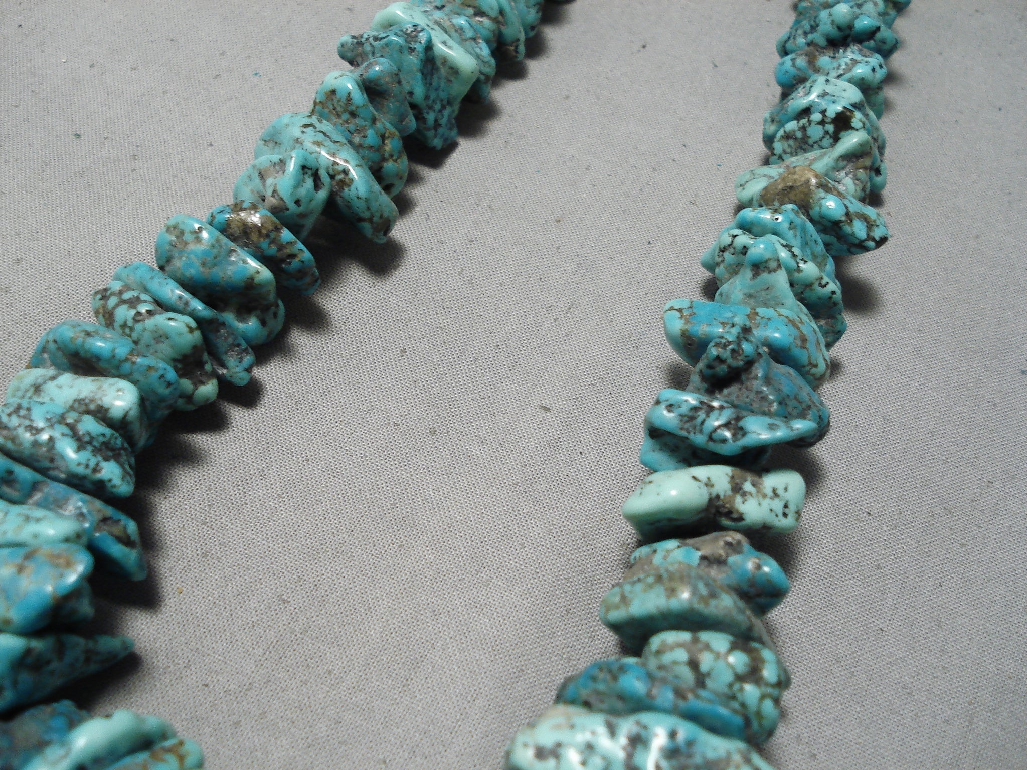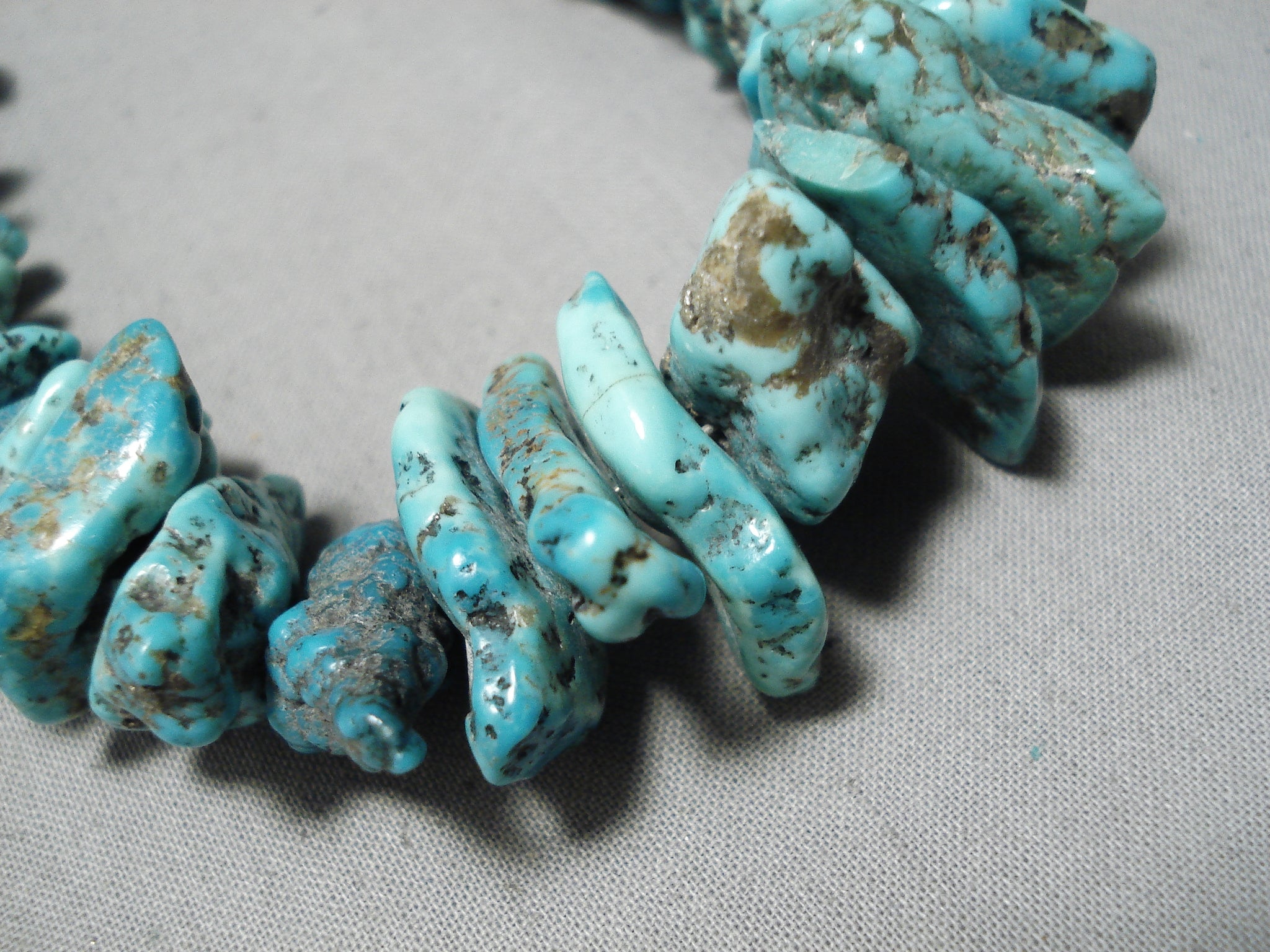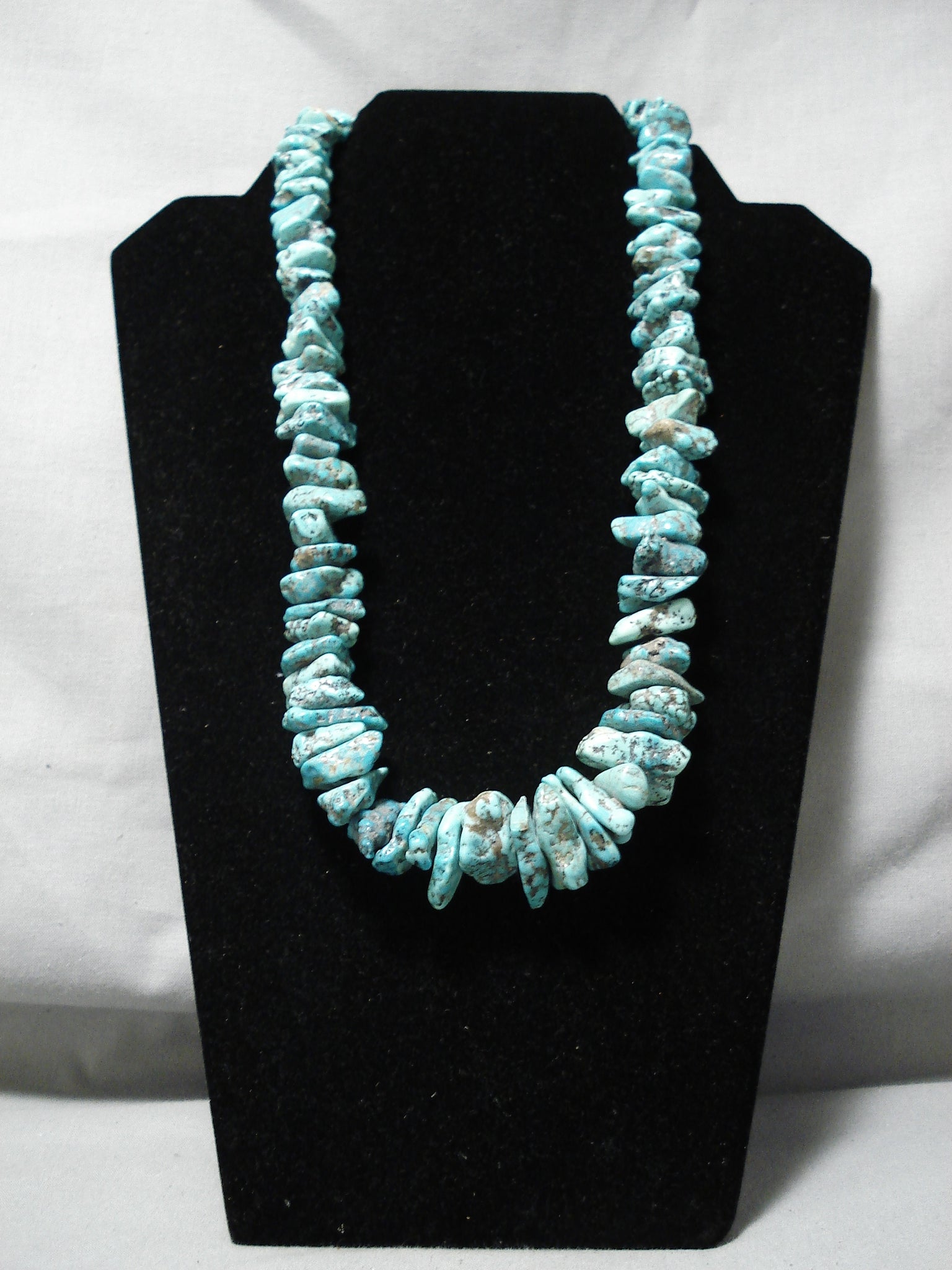 This is an astonishing vintage Navajo chunky turquoise nugget necklace. This piece contains a beautiful plethora of huge graduating chunky turquoise nuggets with the largest measuring a mind blowing 1" X 1/2". The necklace is completely full of turquoise nuggest, no heishi anywhere. Resting at the ends are stunning silver cones with a traditional silve clasp. Sterling silver. Cir. Mid century . The length of the necklace measures around 23". Sturdy 182 grams.