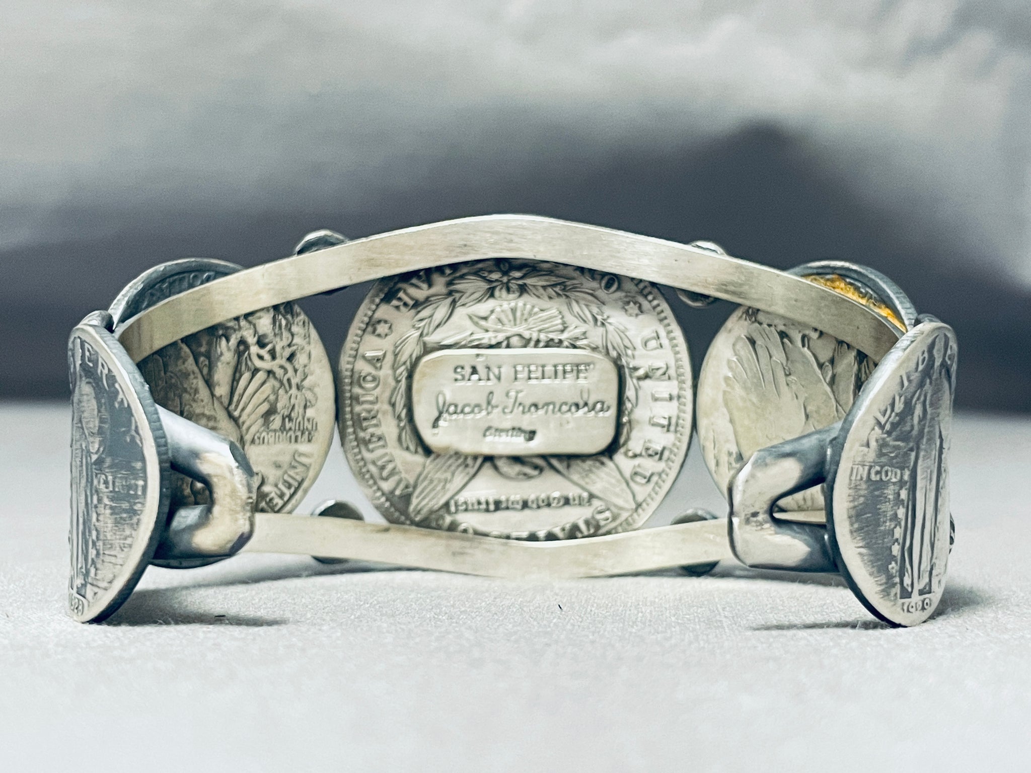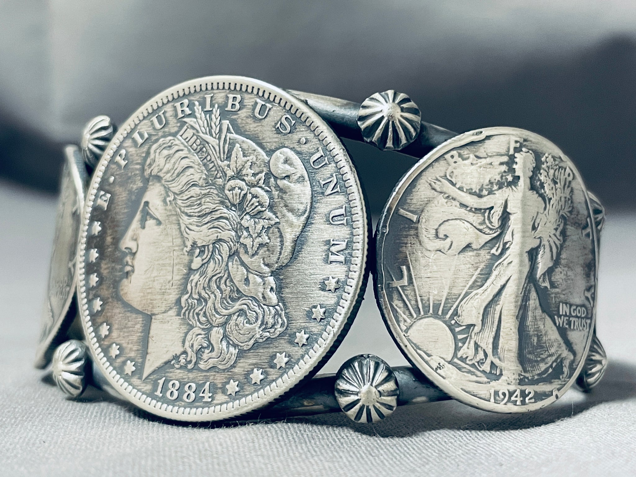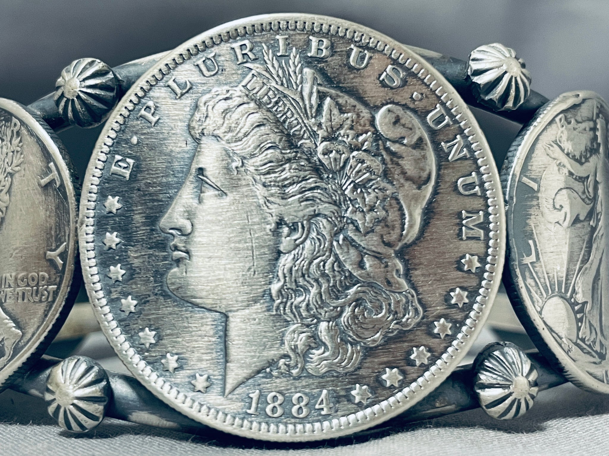 This is an exquisite Native American large multiple silver coin bracelet. This impressive bracelet contains five graduating silver coins. The two end coins are quarters from the 1920's, next are two half dollars being from the 1940's and the center coin is a wonderful silver dollar being from the year 1884, WOW! Resting throughout the coins are superior silver shells. This bracelet contains a sturdy and thick double silver shank cuff. The width of the bracelet measures around 1-1/2". Signed by artist, Jake Troncosa. Sterling silver, marked. Cir. 1980's+. The inside end to end measures around 6-1/4" with an additional 1-1/4" gap. Sturdy 92 grams.