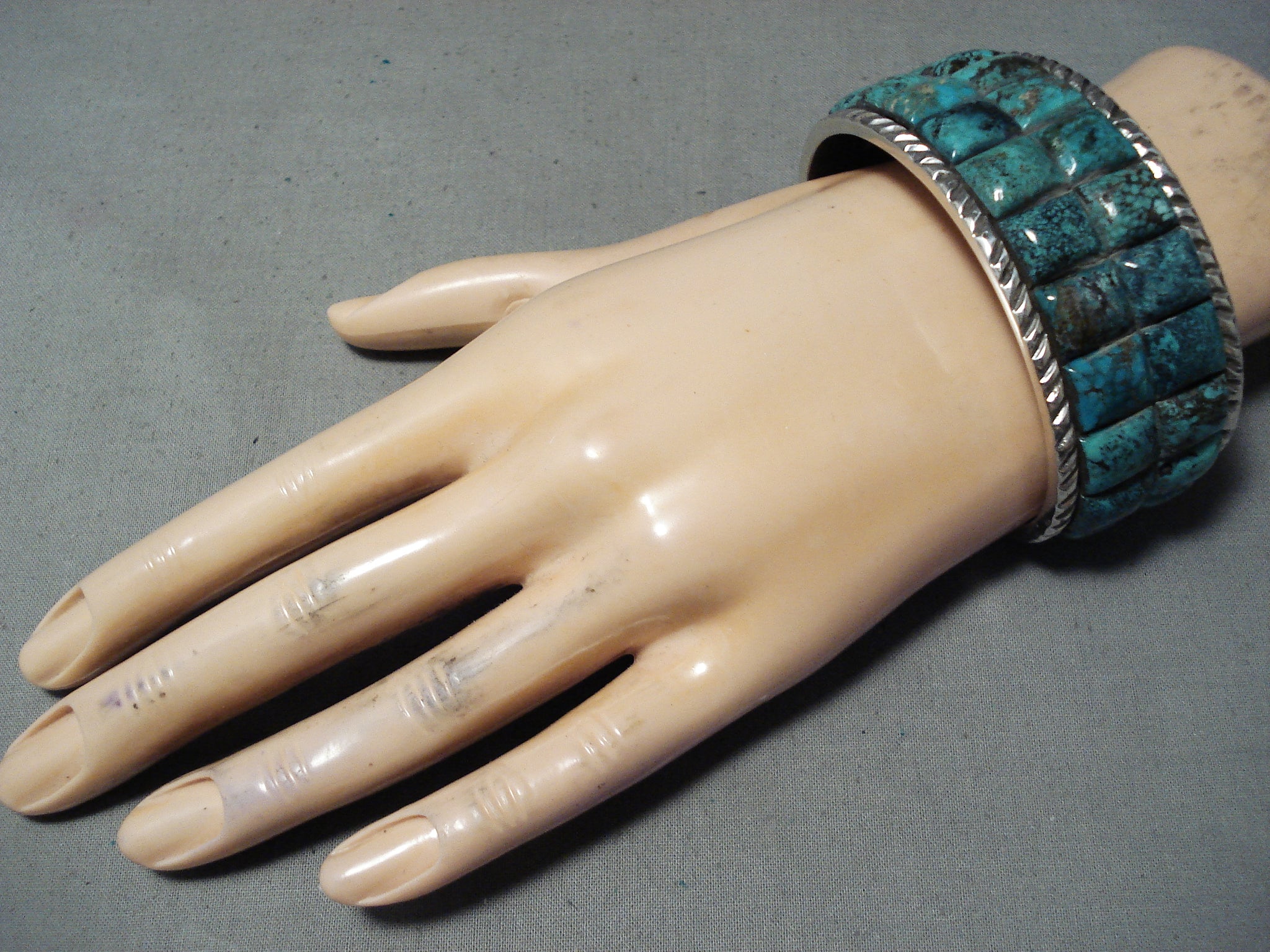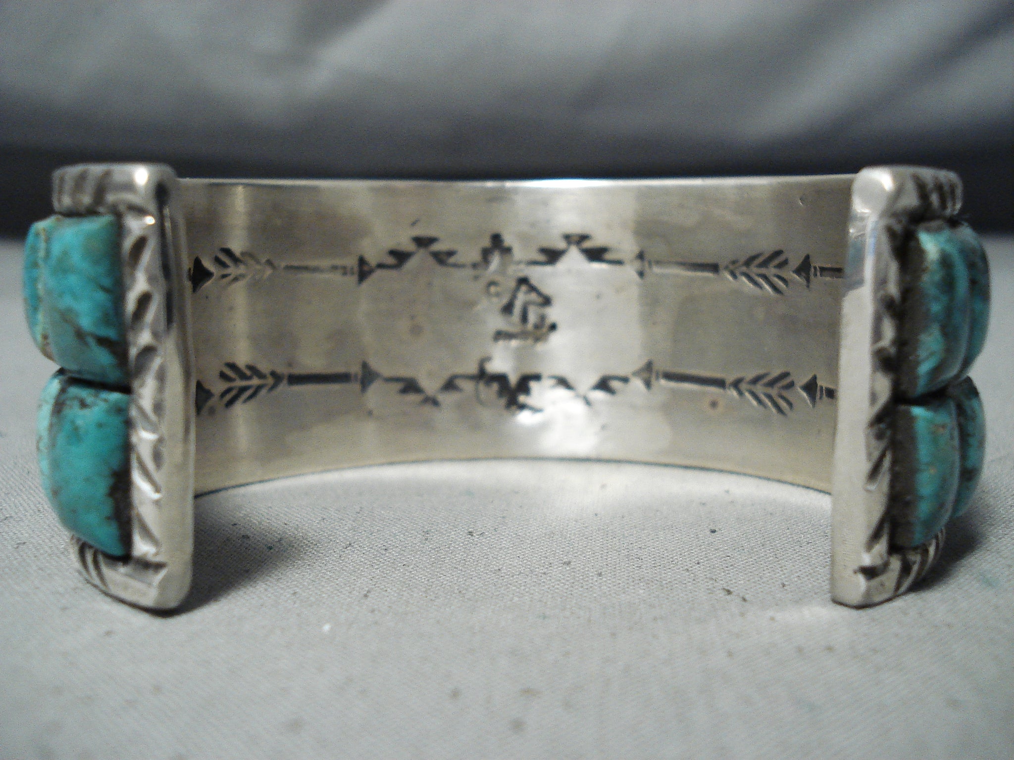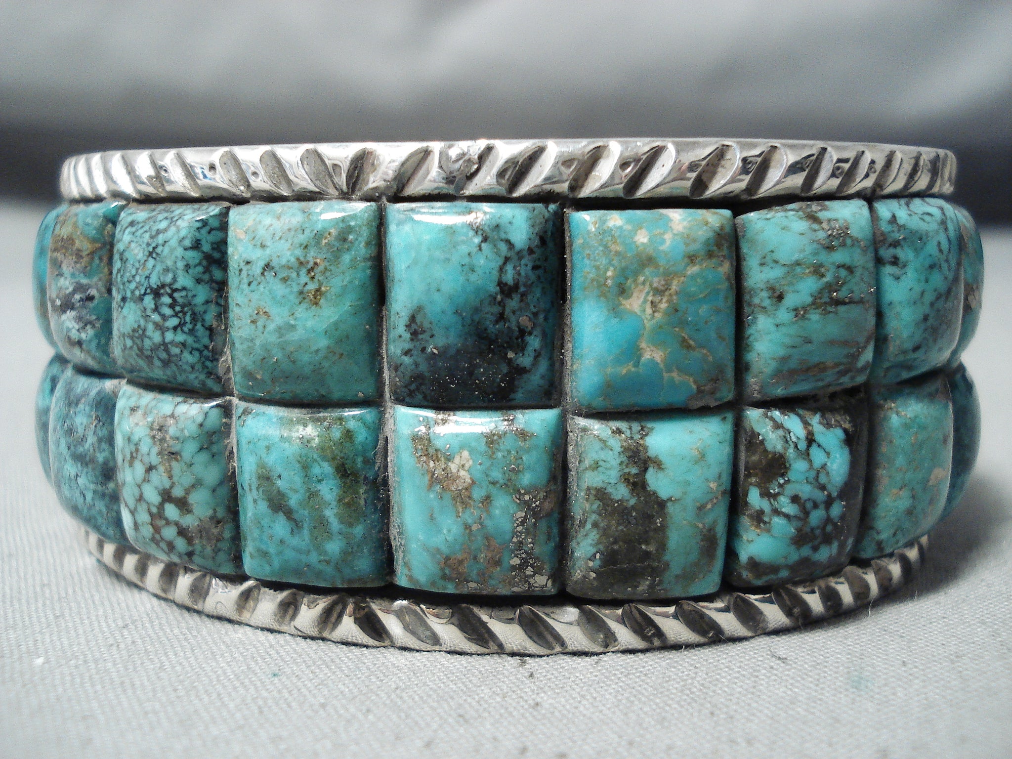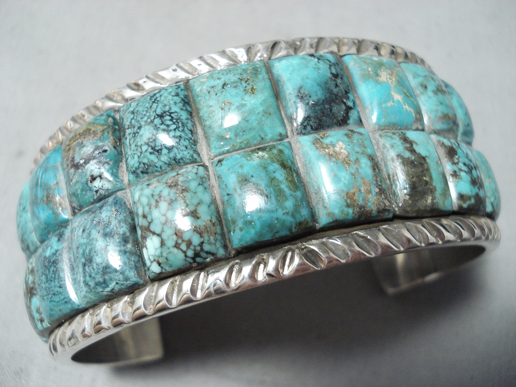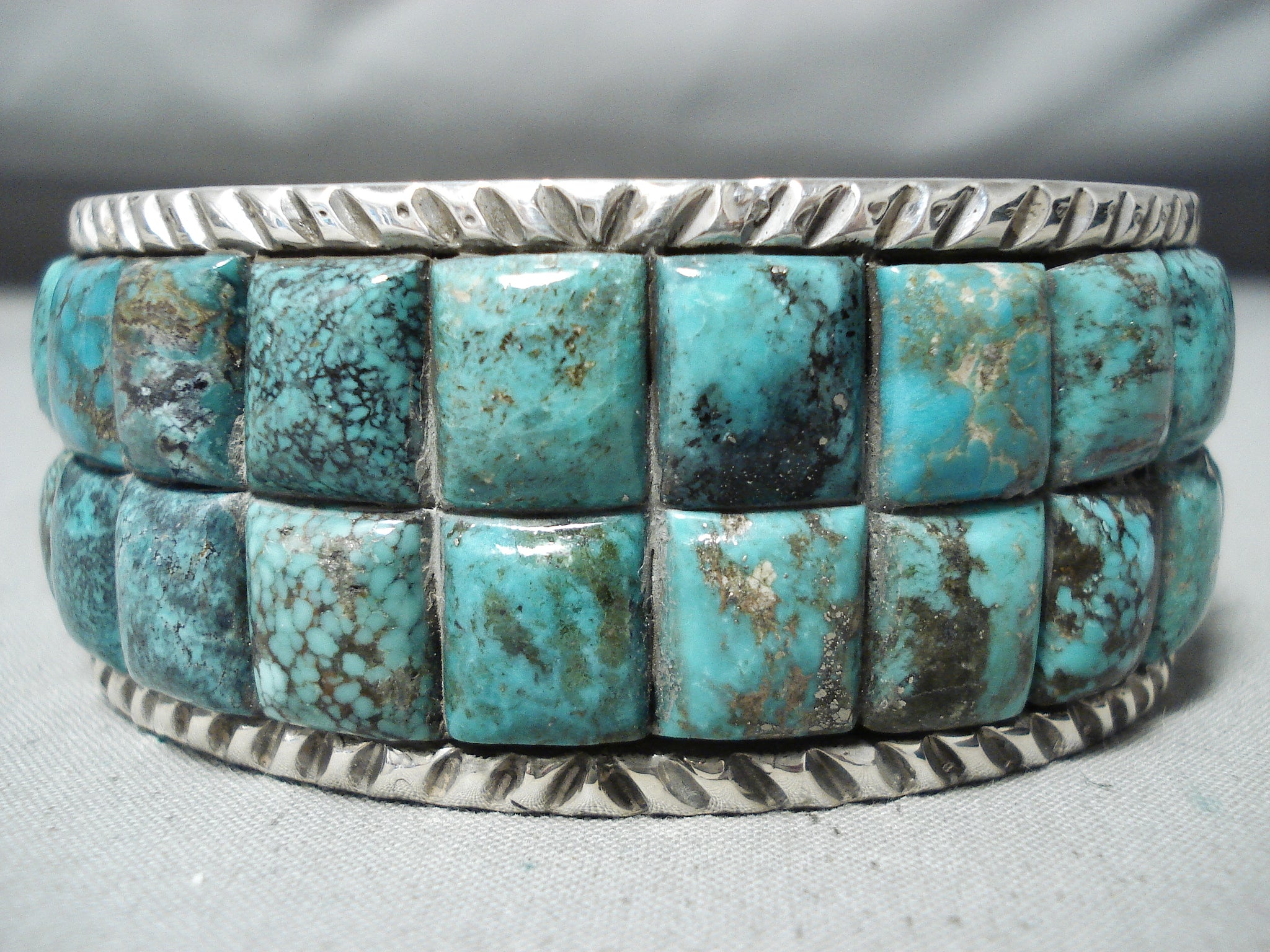We are proud to offer this fascinating Navajo silver bracelet. Surrounded all around with a deep handcarved frame, these 30 square cut turquoise are set side by side to create this astonishing overall look - admired from any angle! The width of the bracelet measures around 1-1/4". Signed by Navajo artist, Curt John. Sterling silver, marked. The inside end to end measures around 5-3/4" with an additional 1-5/8" gap. Sturdy 100 grams.