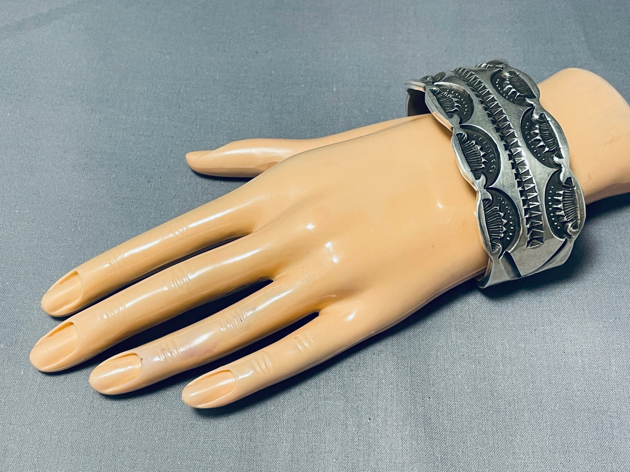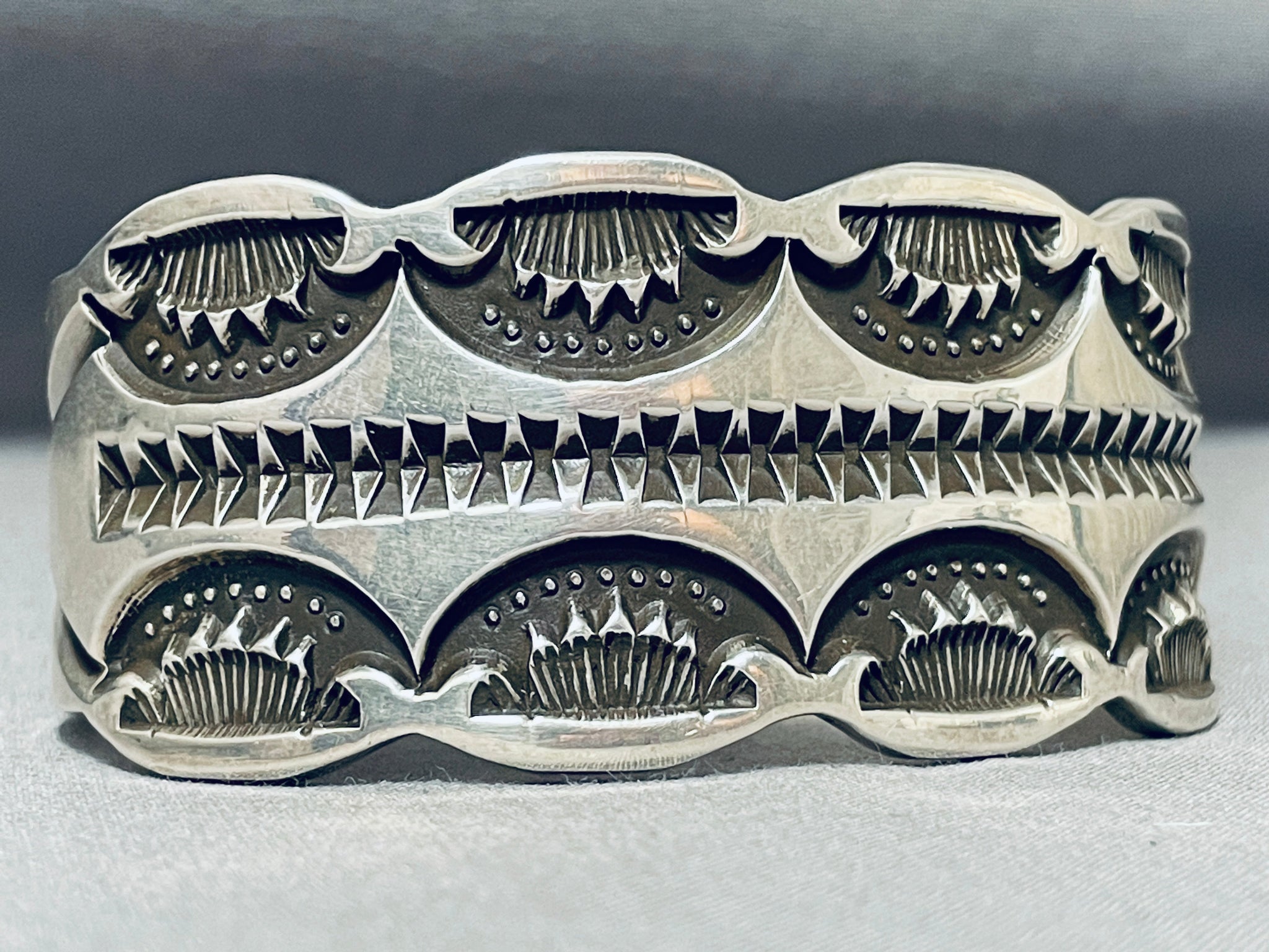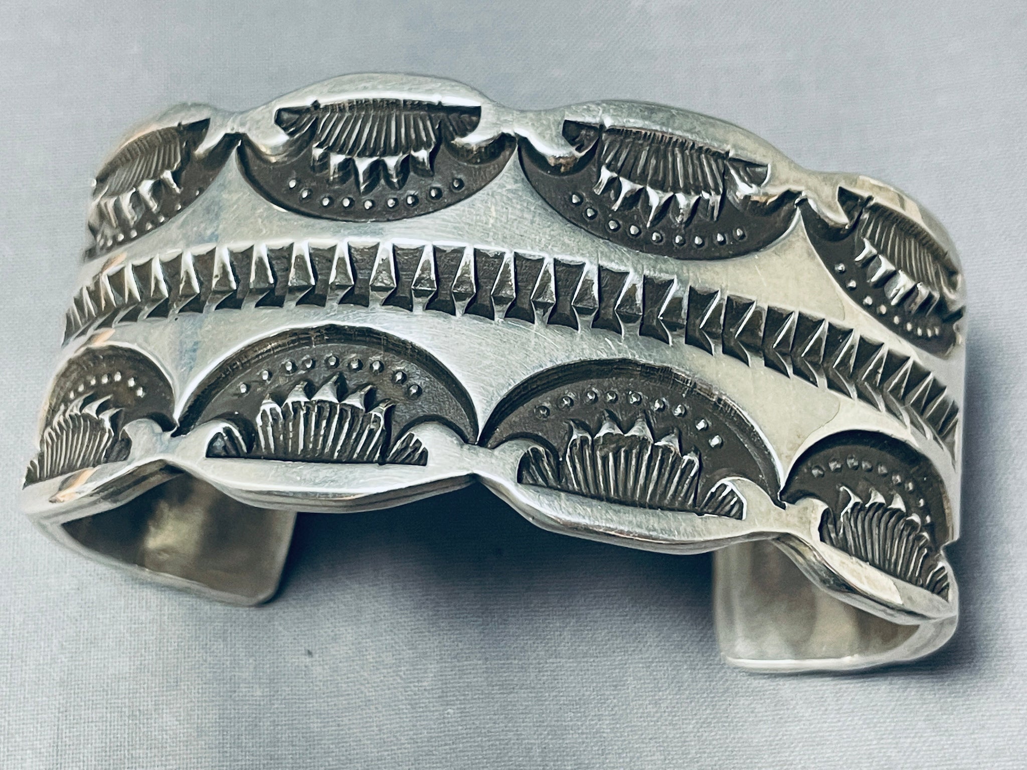 Heavy Deep Stamp Native American Navajo Family Sterling Silver Thick Bracelet