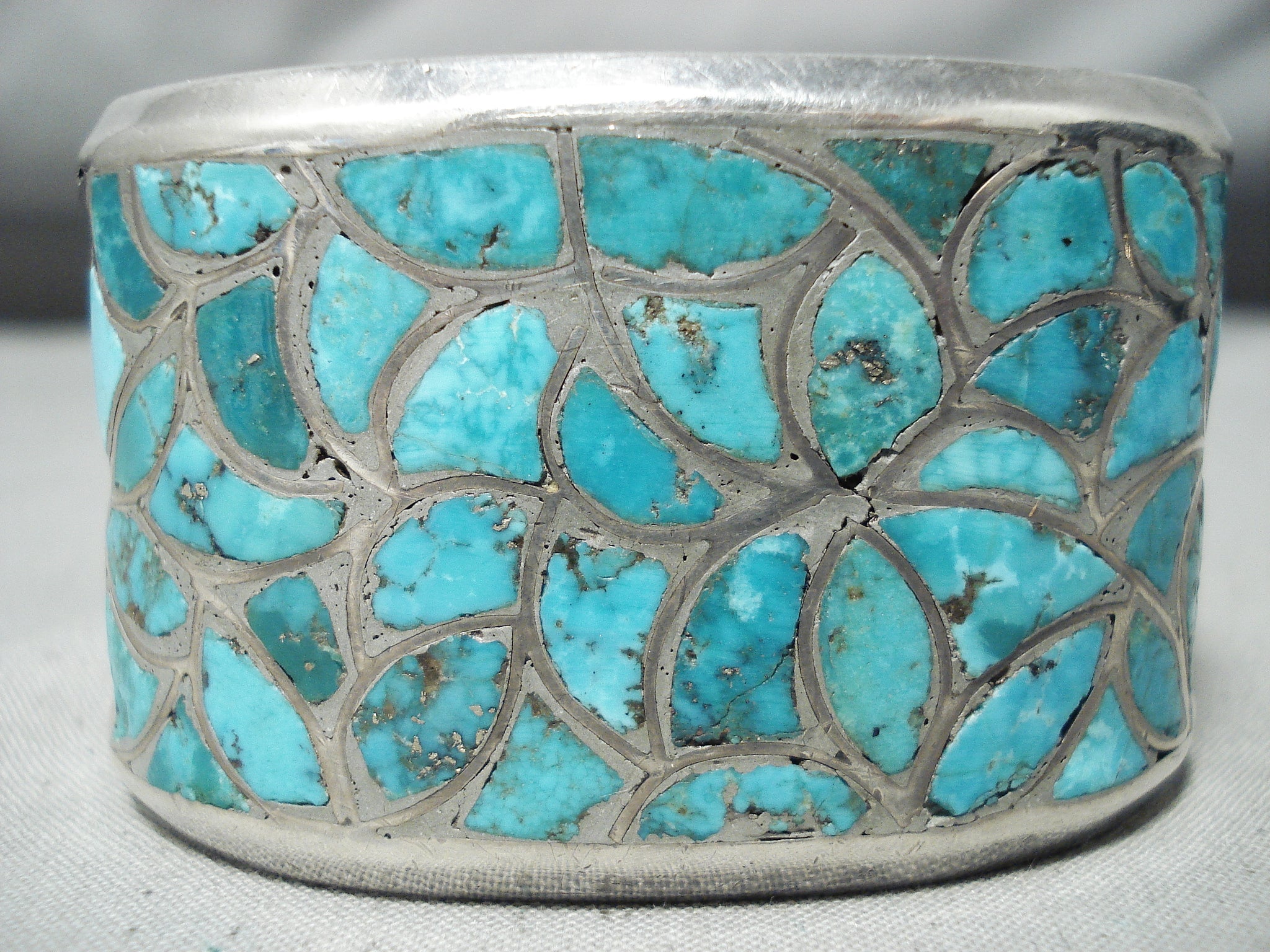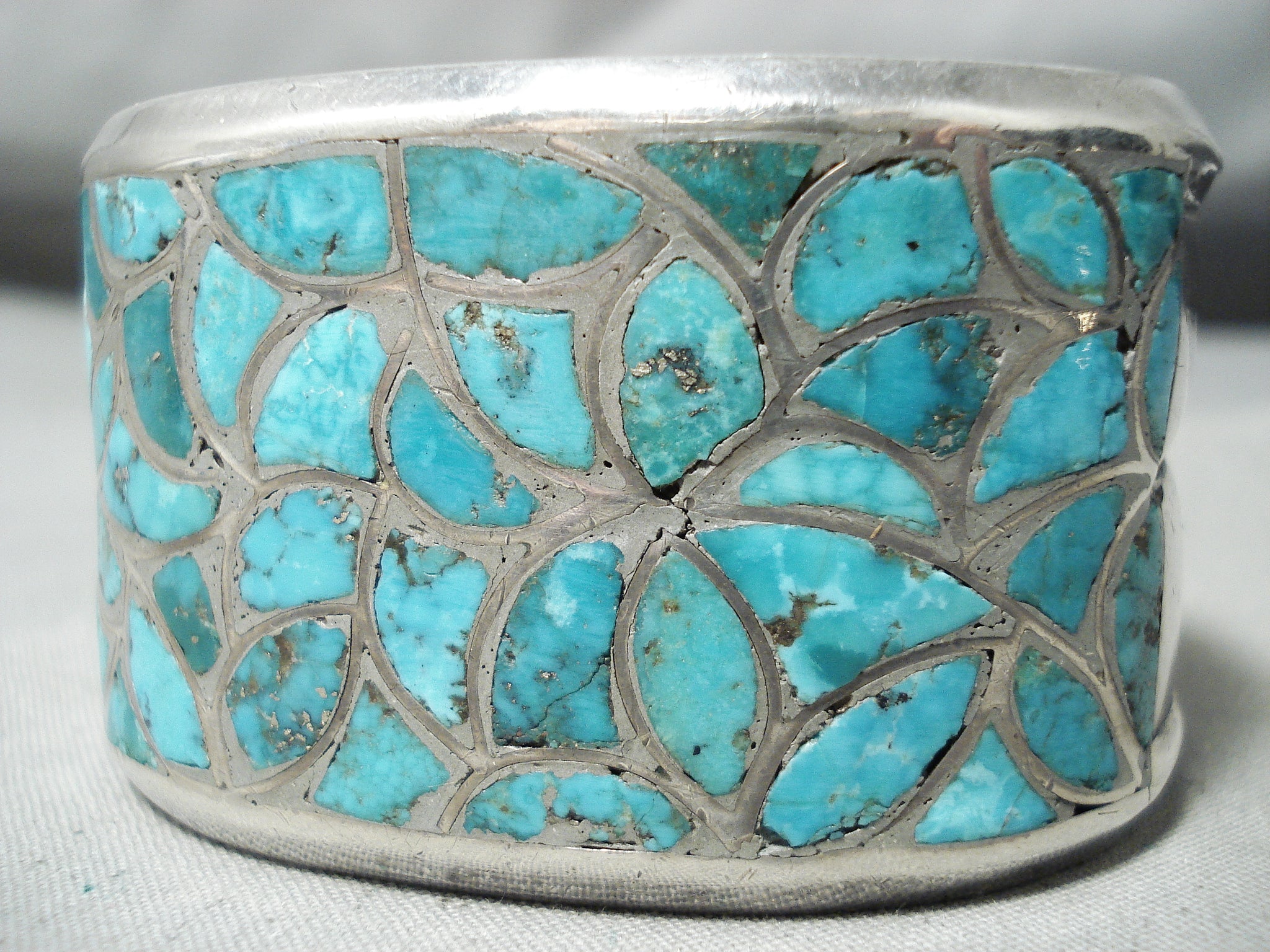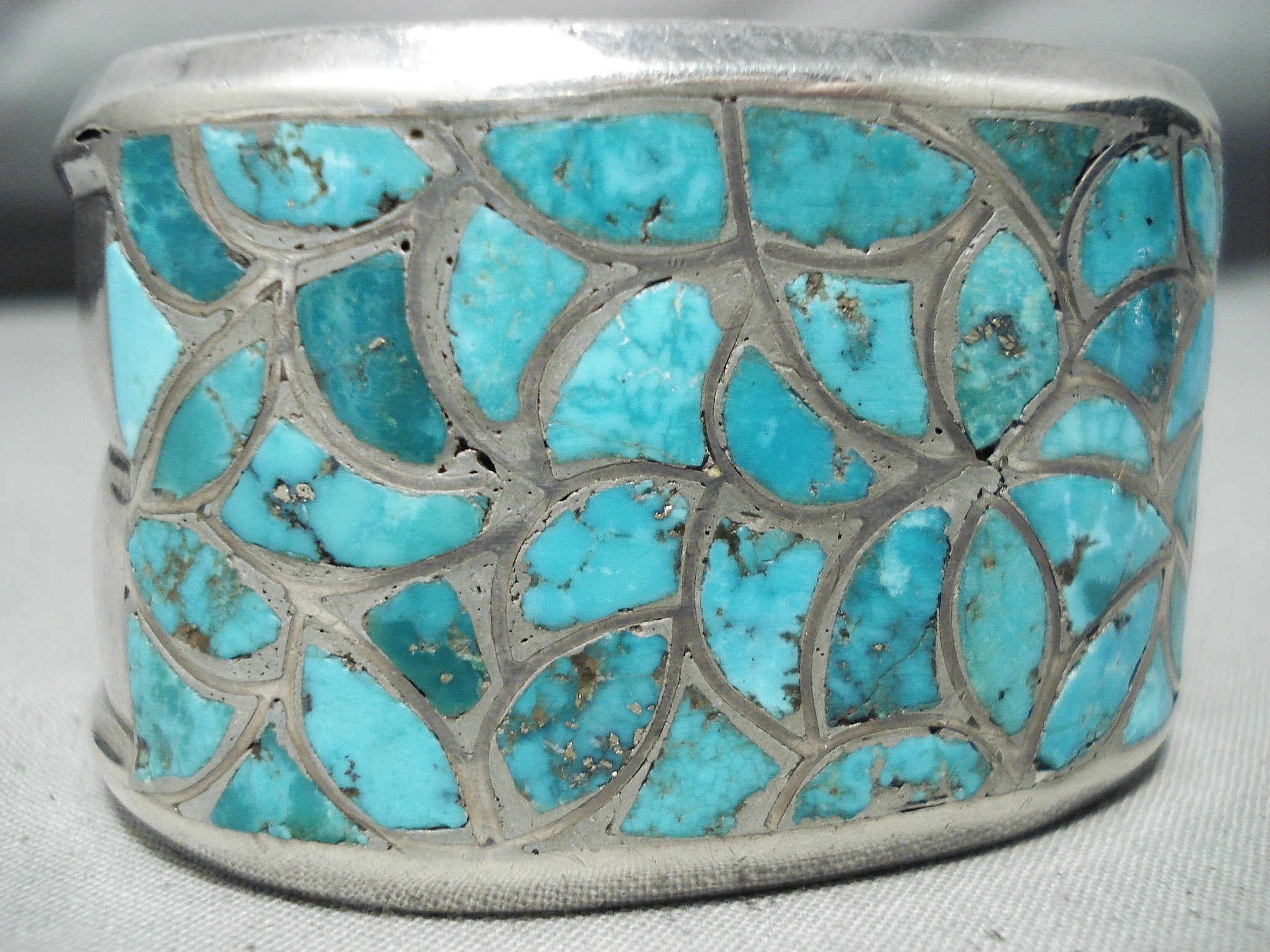 Heavy Detailoed Vintage Native American Zuni Turquoise Sterling Silver Bracelet Old