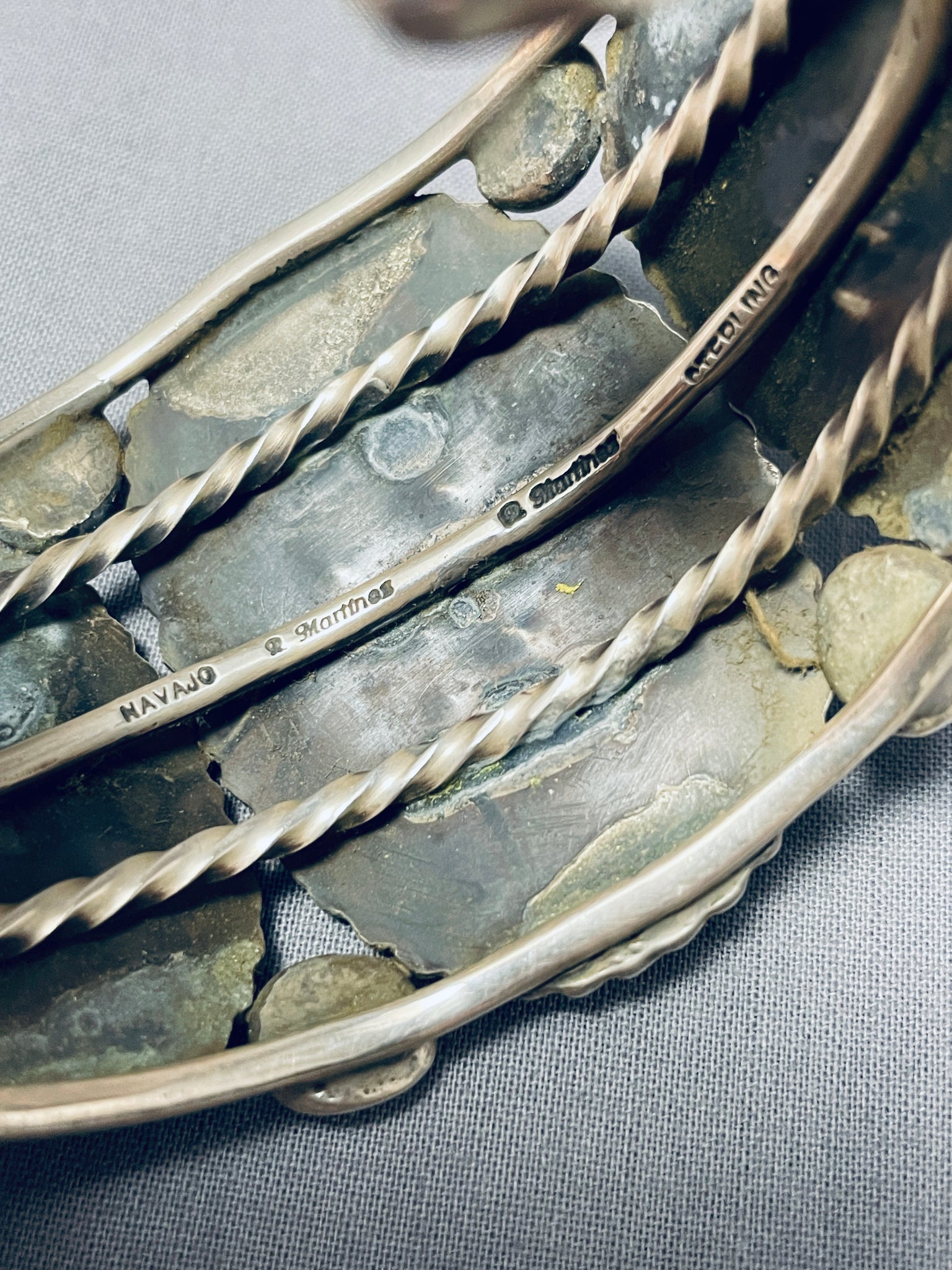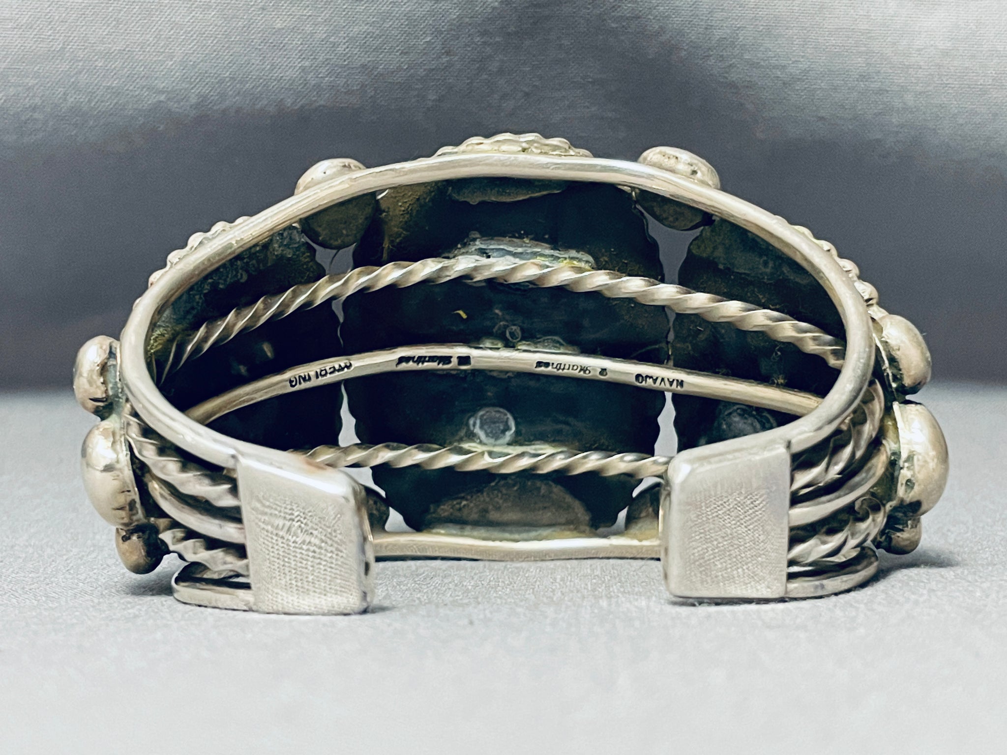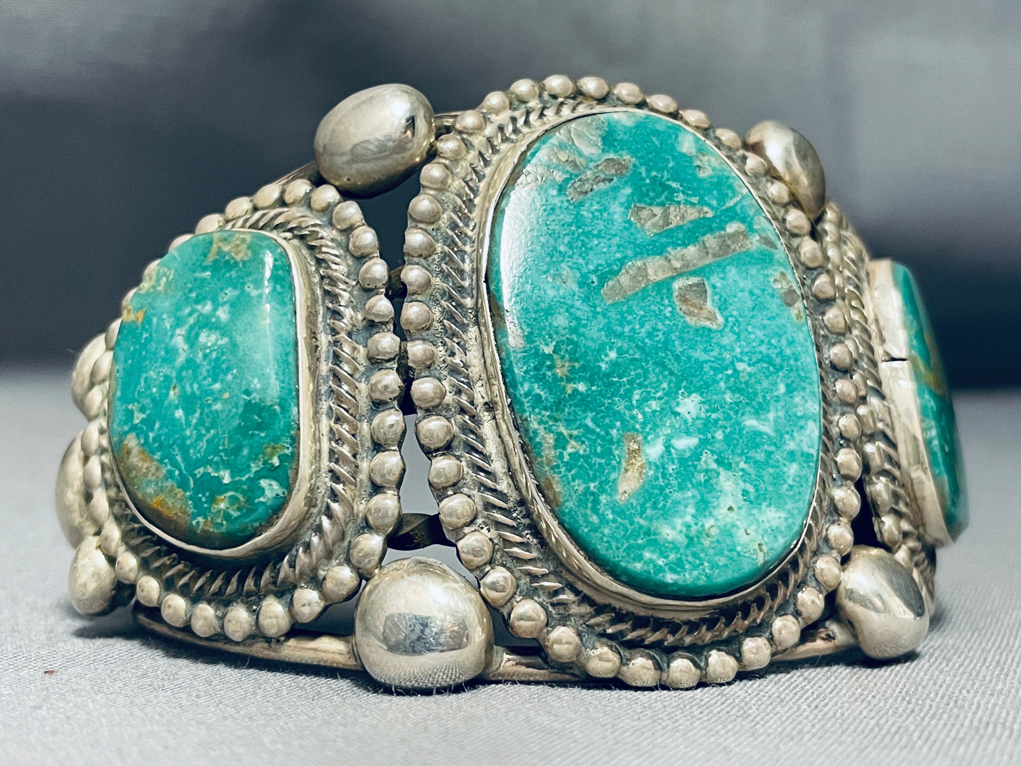 This is a museum quality vintage Navajo large three stone silver bracelet handmade by the famous artist, Rick Martinez. This amazing bracelet is very thick and sturdy and consists of three veyr large chunky Royston turquoise stones. Surrounding each stone are impeccable silver works that consist of raindrops, ropes and amazingly large raindrops. This bracelet contains a phenomenal very thick and sturdy five silver shank cuff with two being coiled from one end to the other. I absolutely love the intricacy of this bracelet as it is extremley thick and sturdy. The center stone measures around 1-5/8" x 1". The width of the bracelet measures around 2". Signed by Navajo artist, Rick Martinez. Sterling silver, marked. Cir. 1970's+. The inside end to end measures around 6" with an additional 1" gap. Sturdy 137 grams.