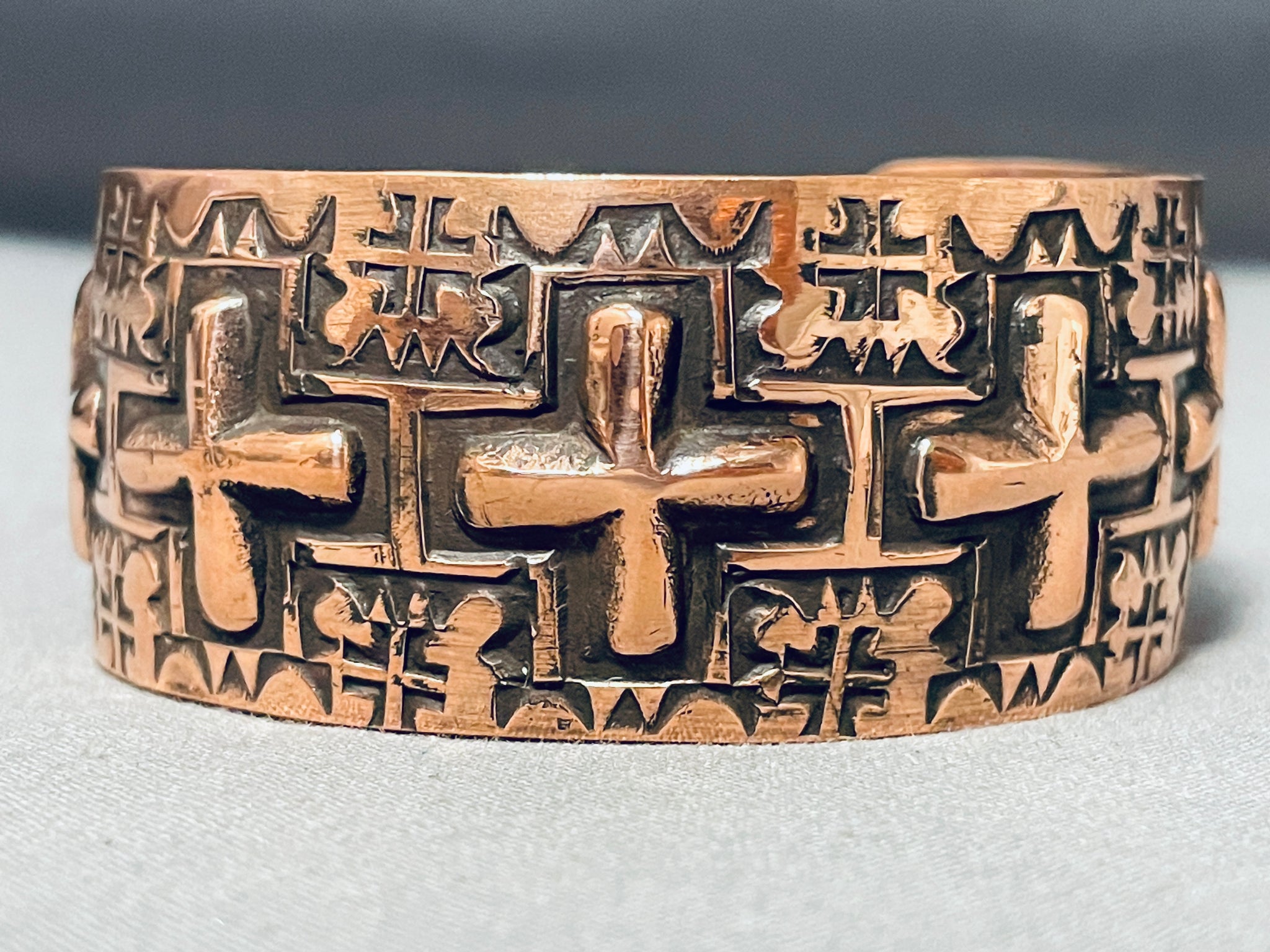This is an exquisite Navajo bracelet featuring handcarved crosses and handstamped rug designs, all across a solid copper cuff! So Dazzling! The width of the bracelet measures around 1". Signed by Navajo artist, Ron Willie. Sterling silver. The inside end to end measures around 5-1/2" with an additional 1" gap. Sturdy 64 grams.