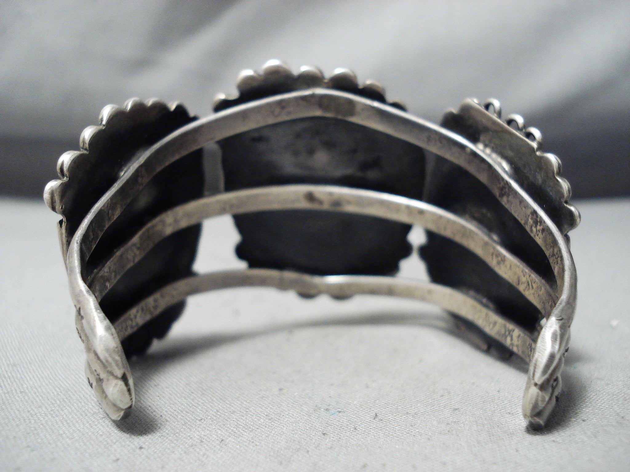 This is a magnificent vintage Navajo three stone silver bracelet. This incredible piece contains three large chunky green turquoise stones that appear to be from the amazing rare Carico Lake turquoise mine. Surrounding each stone are phenomenal silver wave works and thick silver ropes. This bracelet contains a fascinating triple silver shank cuff with old natural patina. The center stone measures around 1" x 7/8". The width of the bracelet measures around 1-1/2". Sterling silver. Cir. Mid century . The inside end to end measures around 5" with an additional 1-1/2" gap. Sturdy 76 grams.