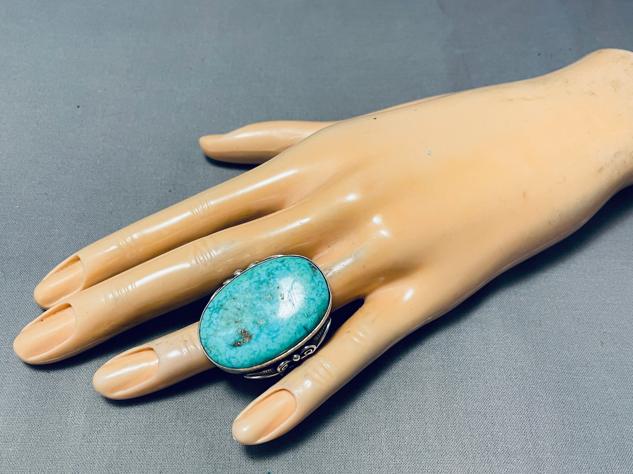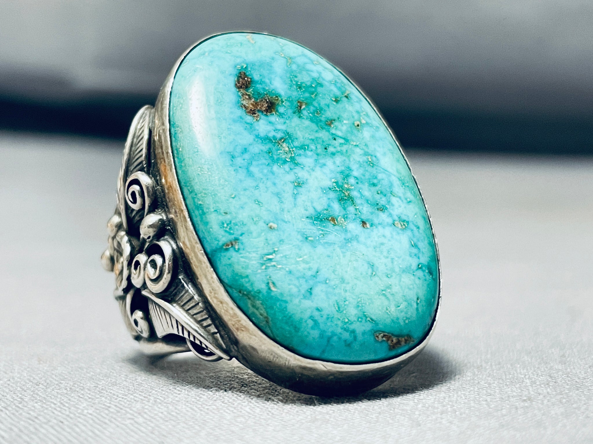 Heavy Mens 25 Gram Vintage Native American Navajo Turquoise Leaf Sterling Silver Ring Old