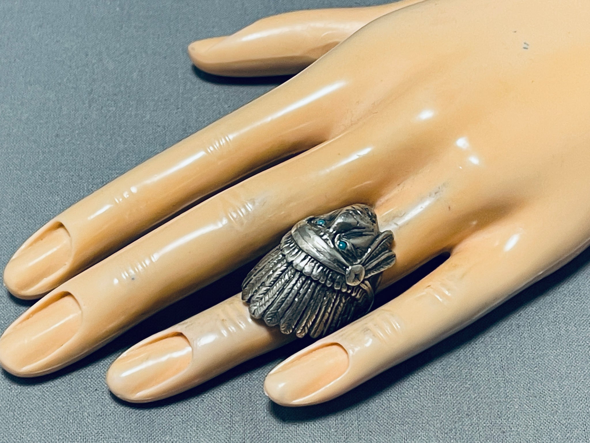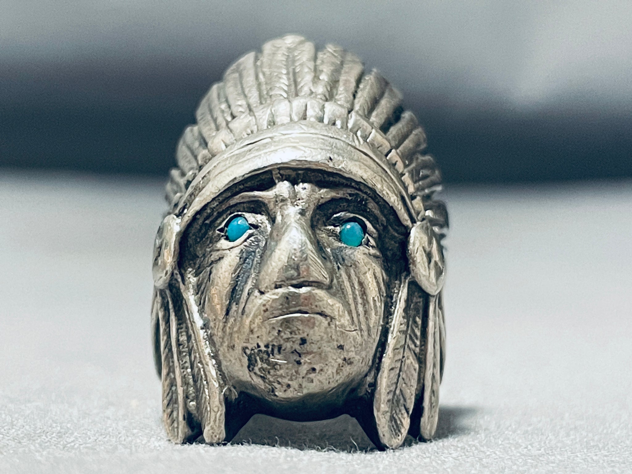 Heavy Mens Chief Head Vintage Native American Navajo Turquoise Sterling Silver Ring