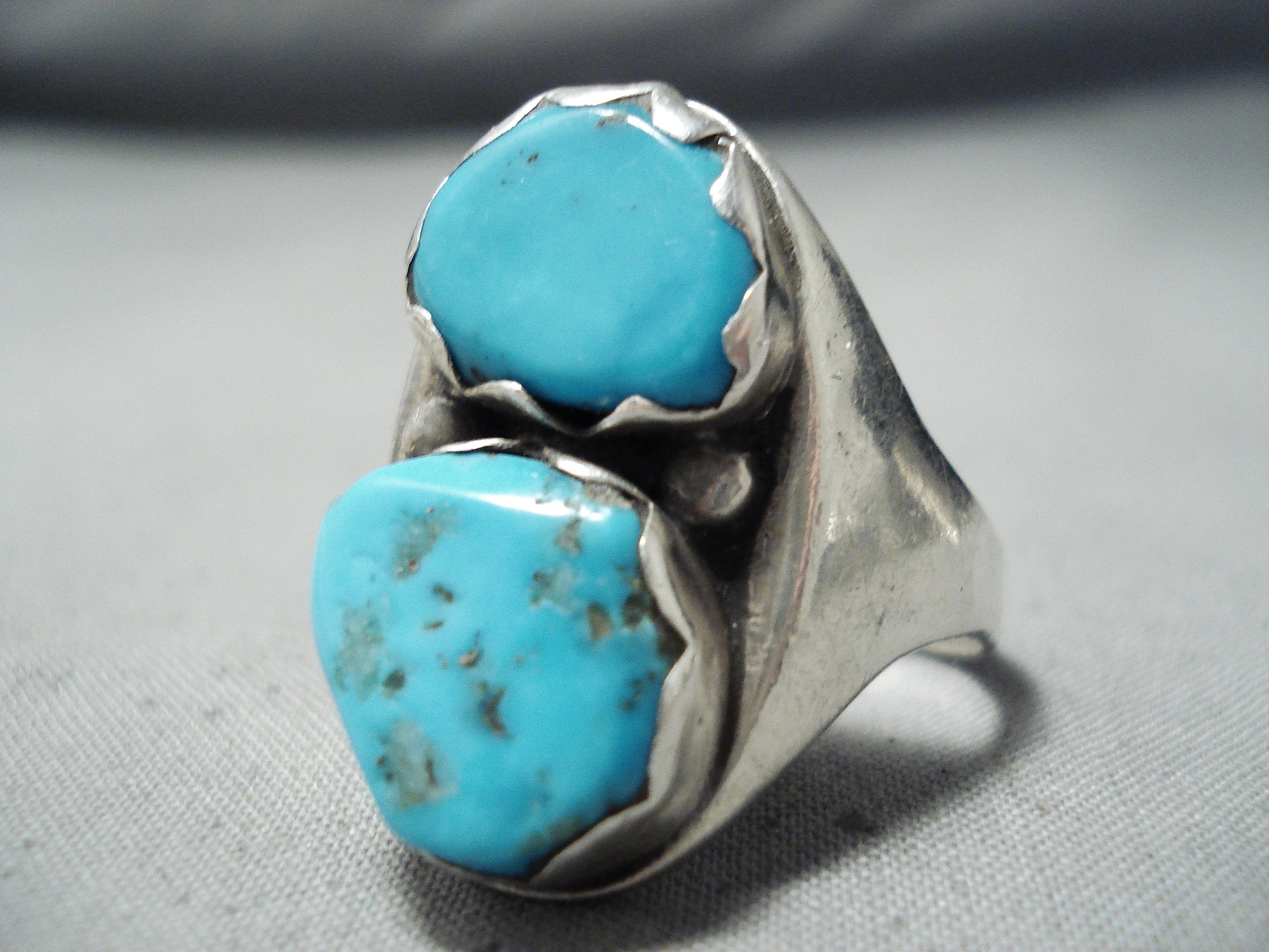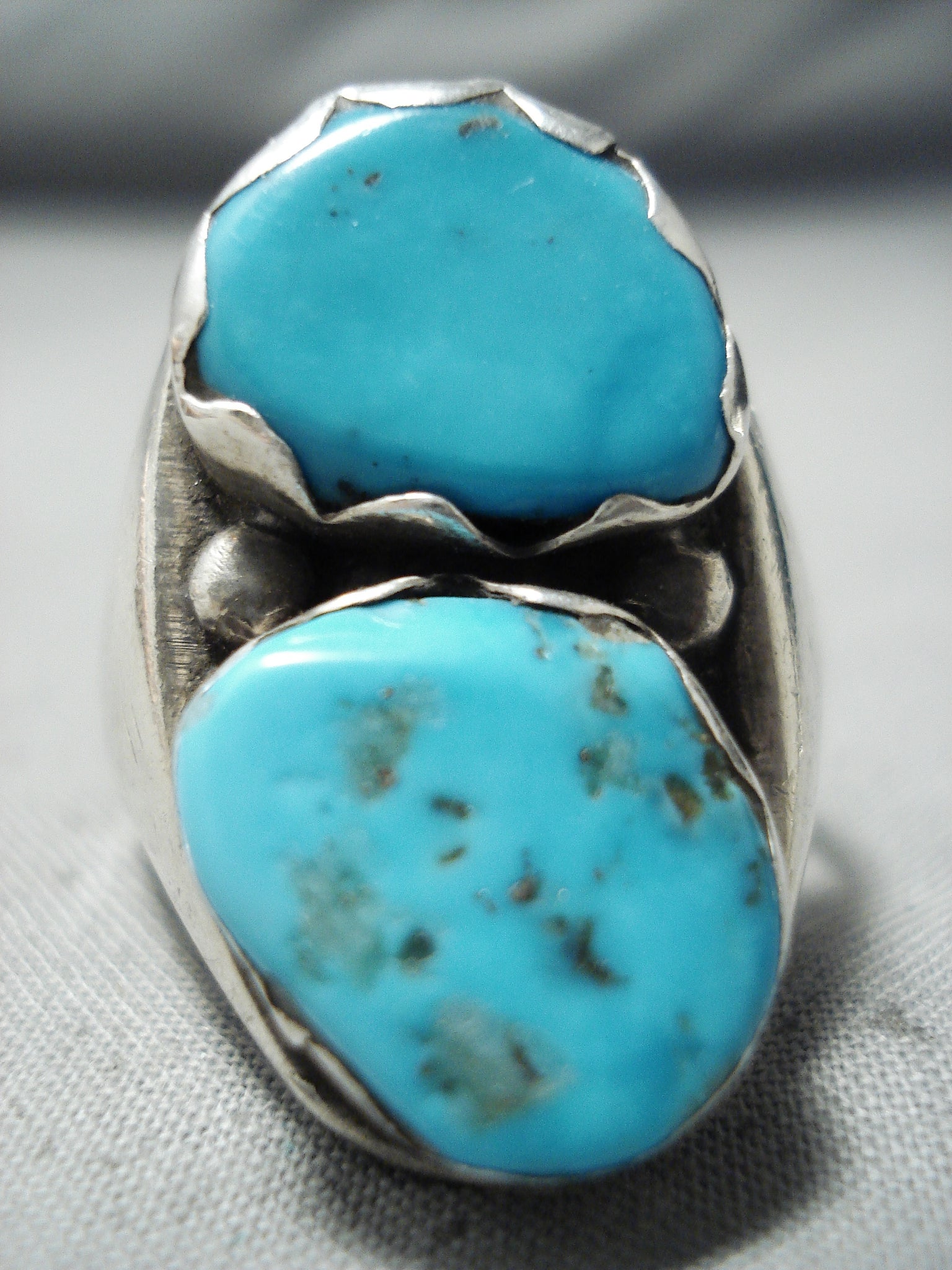 This is a superior vintage Zuni/ Navajo two stone silver ring. This piece contains two large turquoise stones. This ring contains two accenting silver raindrops. The silver is very thick and sturdy. The largest stone measures around 1/2" x 3/8". The ring face measures around 1-1/8" x 3/4". The ring size is around 12.5. Cir. Mid century . Sterling silver. Sturdy 17 grams.