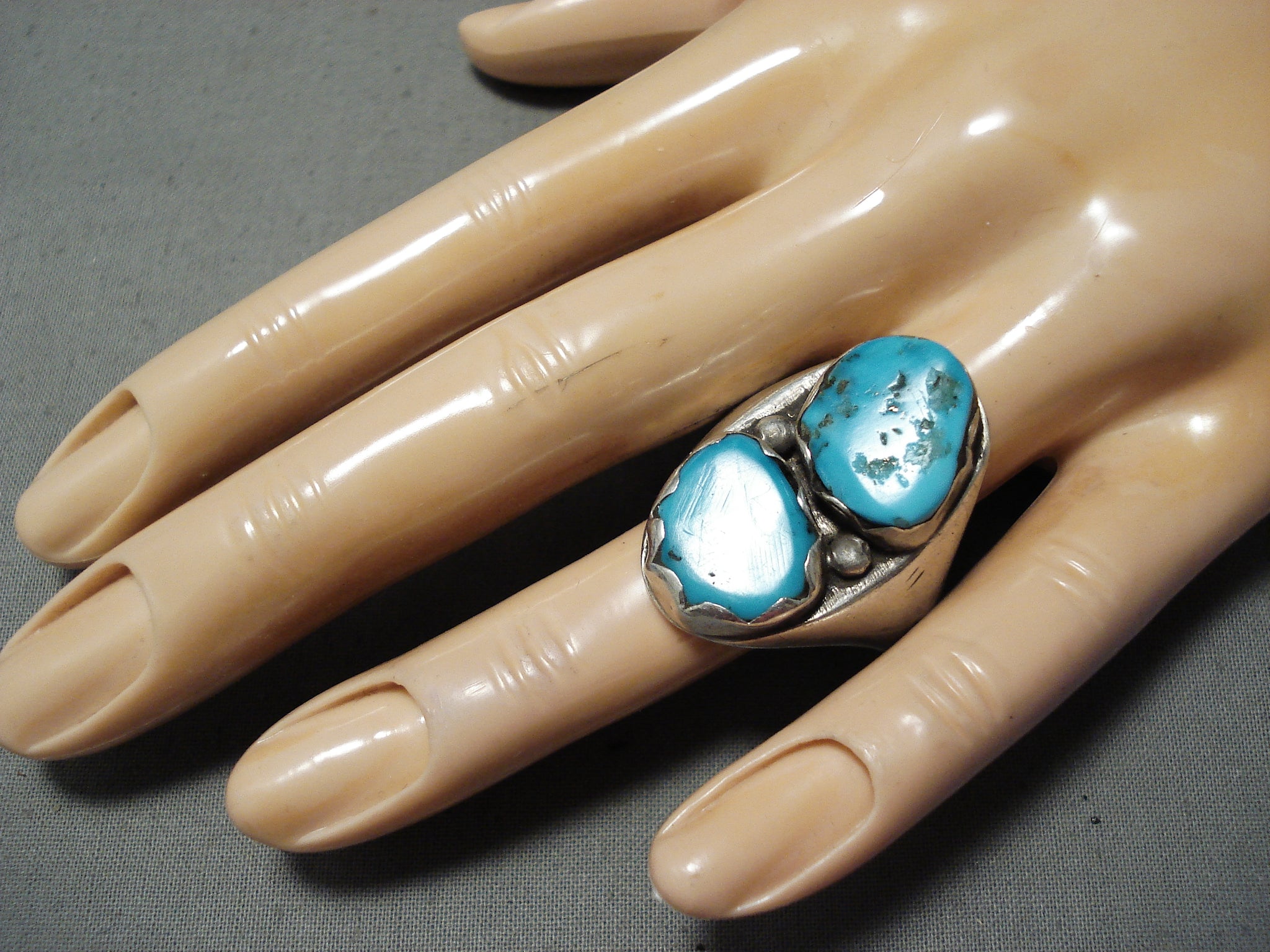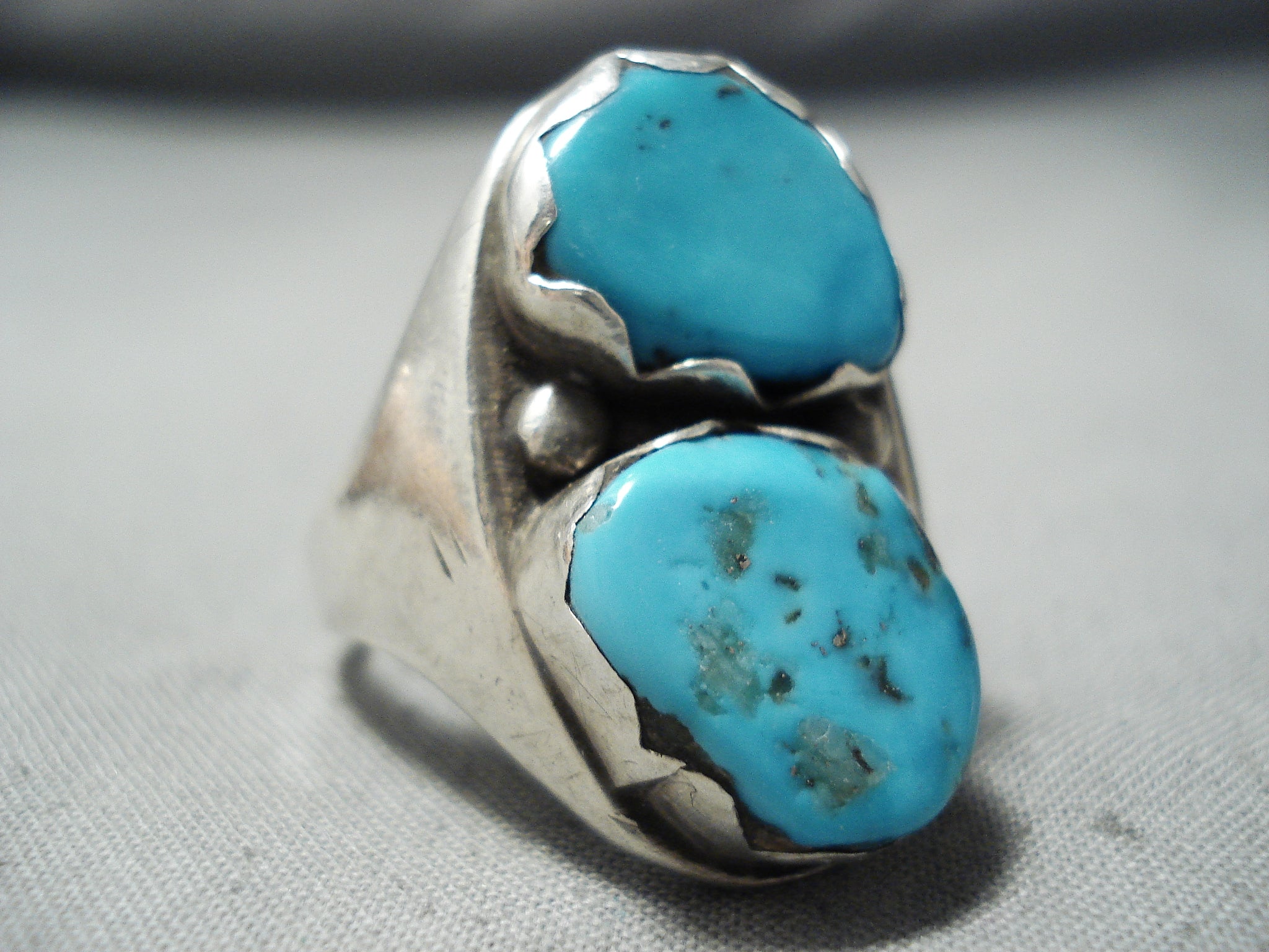 Heavy Men's Double Turquoise Vintage Native American Navajo Sterling Silver Ring Old