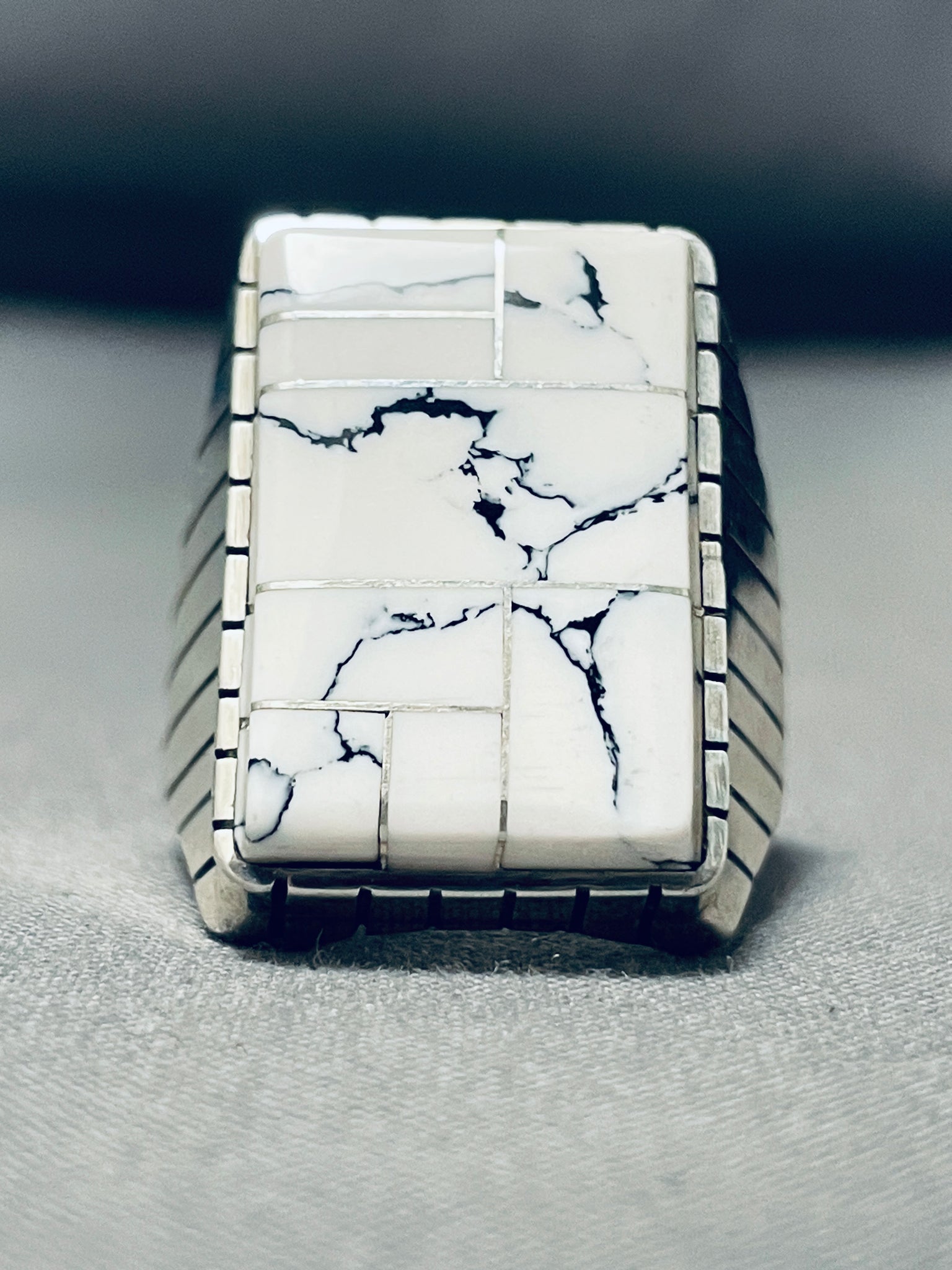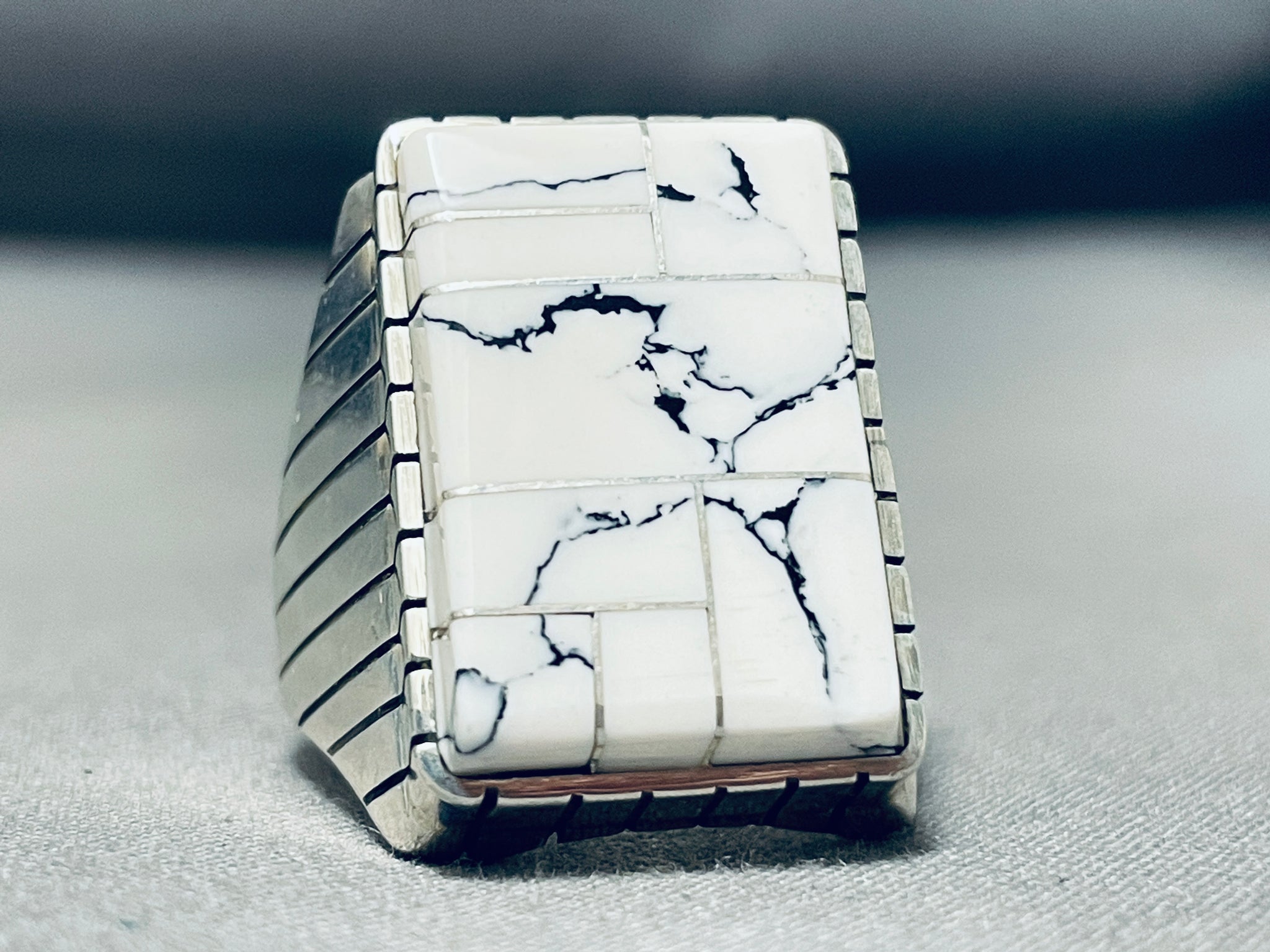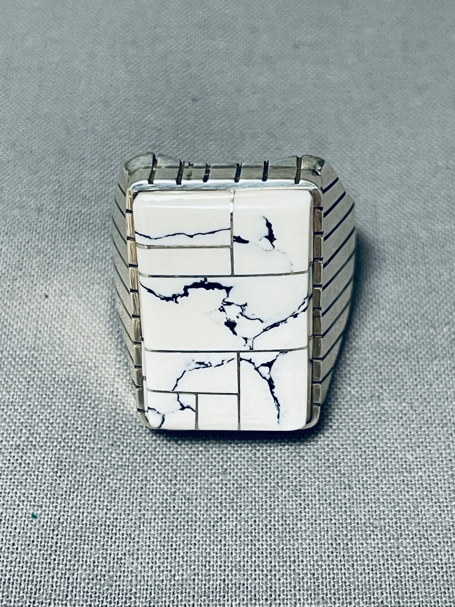 This is an impressive vintage Navajo inlaid silver ring. This remarkable inlaid mens ring is just spectacular consisting of channel inlaid White Buffalo turquoise stones. The matrix is just amazing and the color of the turquoise is incredible. Accenting the stone and around the edges of the ring are marvelous line segments. This ring is very thick and sturdy. The ring face measures around 1" x 3/4". The ring size is around 12 . Sterling silver, marked. Sturdy 20 grams.