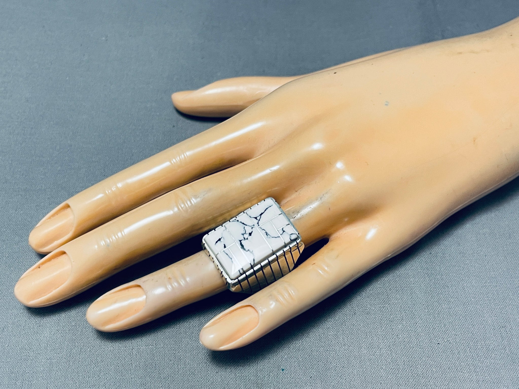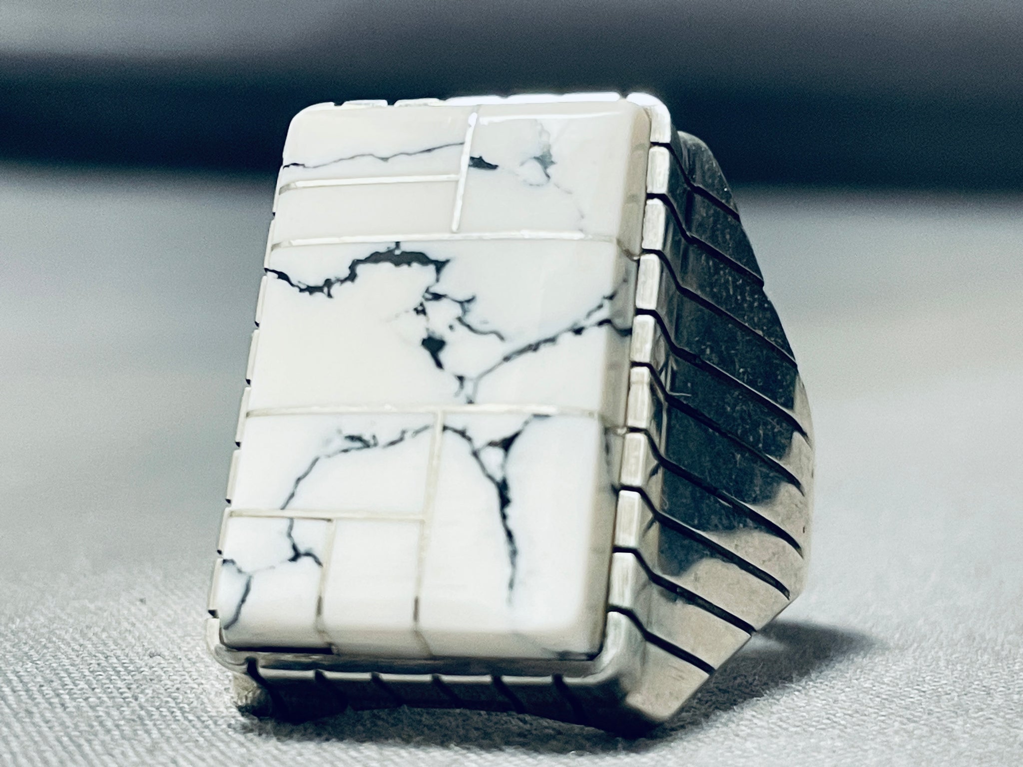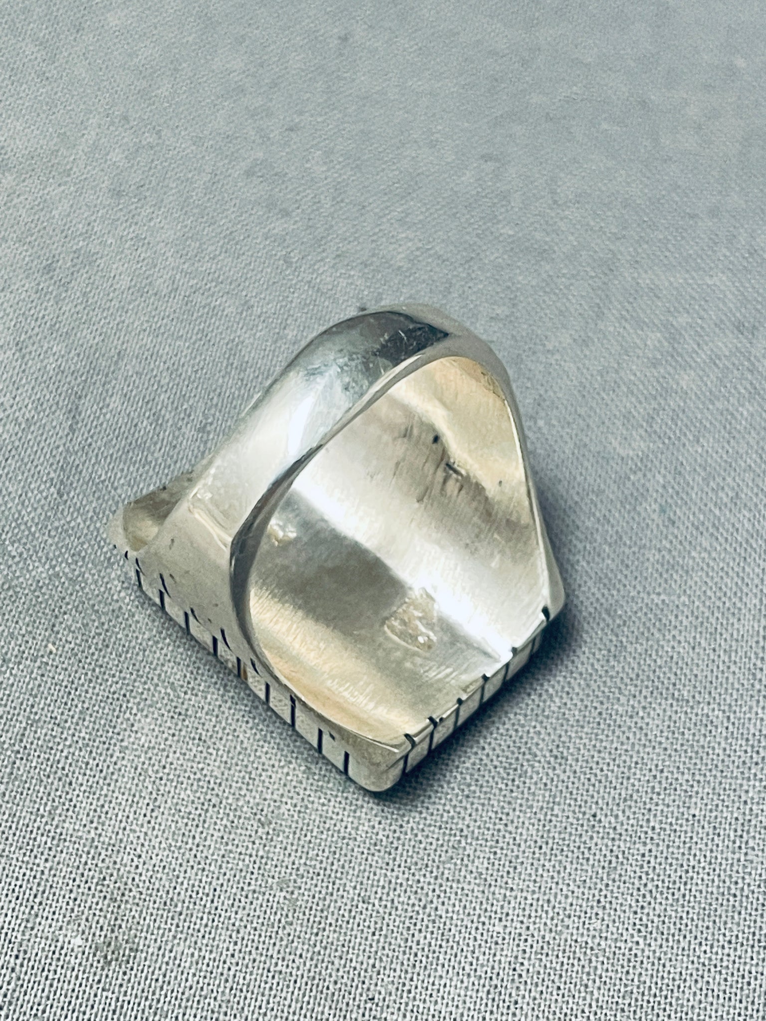 This is an impressive vintage Navajo inlaid silver ring. This remarkable inlaid mens ring is just spectacular consisting of channel inlaid White Buffalo turquoise stones. The matrix is just amazing and the color of the turquoise is incredible. Accenting the stone and around the edges of the ring are marvelous line segments. This ring is very thick and sturdy. The ring face measures around 1" x 3/4". The ring size is around 12 . Sterling silver, marked. Sturdy 20 grams.
