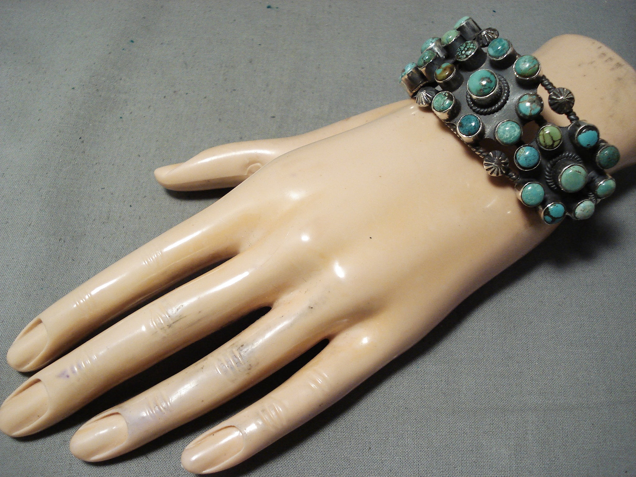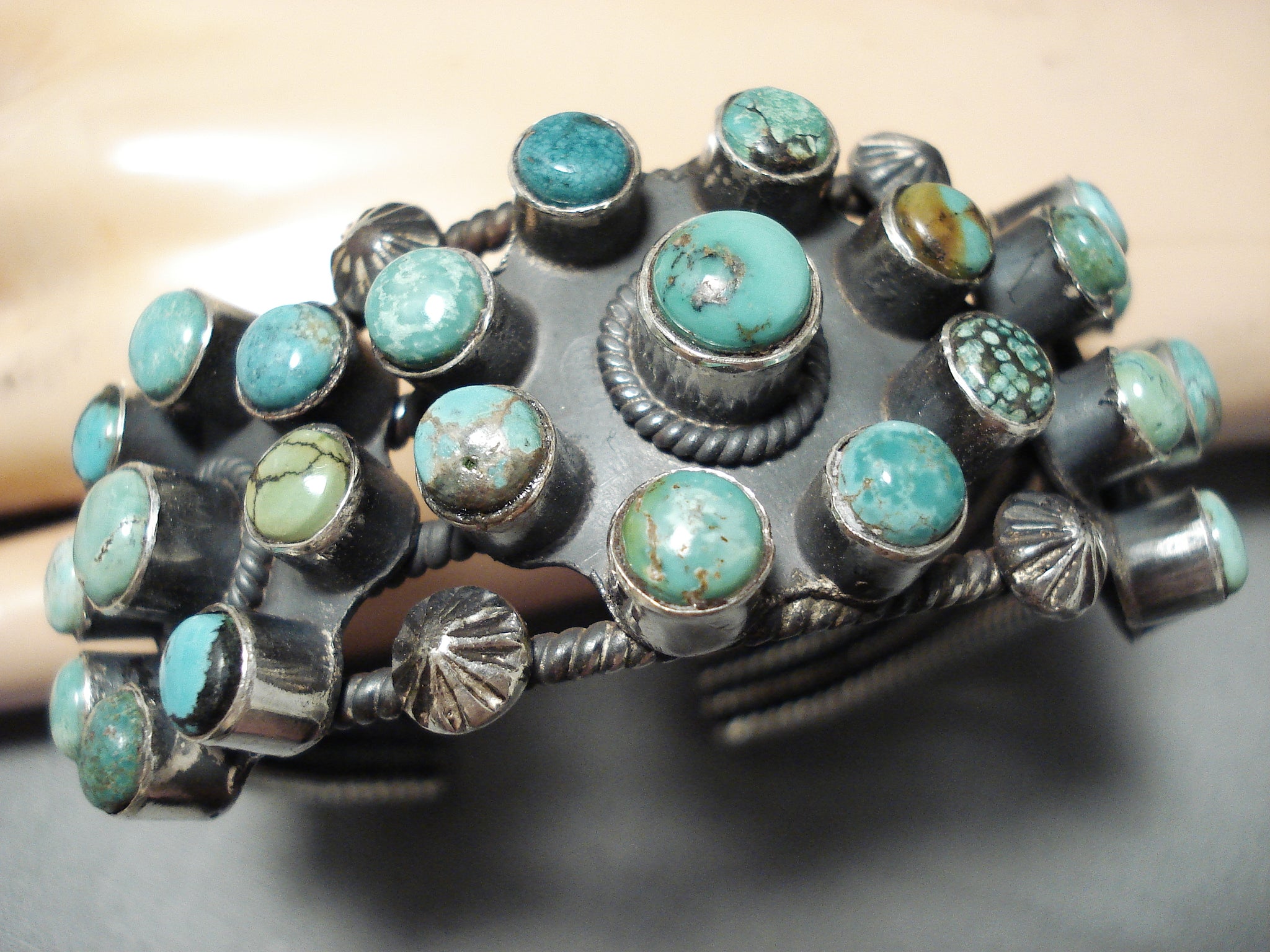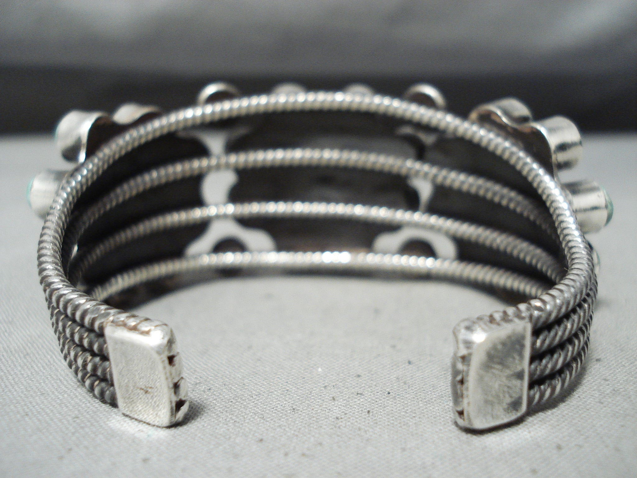 Heavy Native American Navajo Green Spiderweb Turquoise Coiled Sterling Silver Bracelet