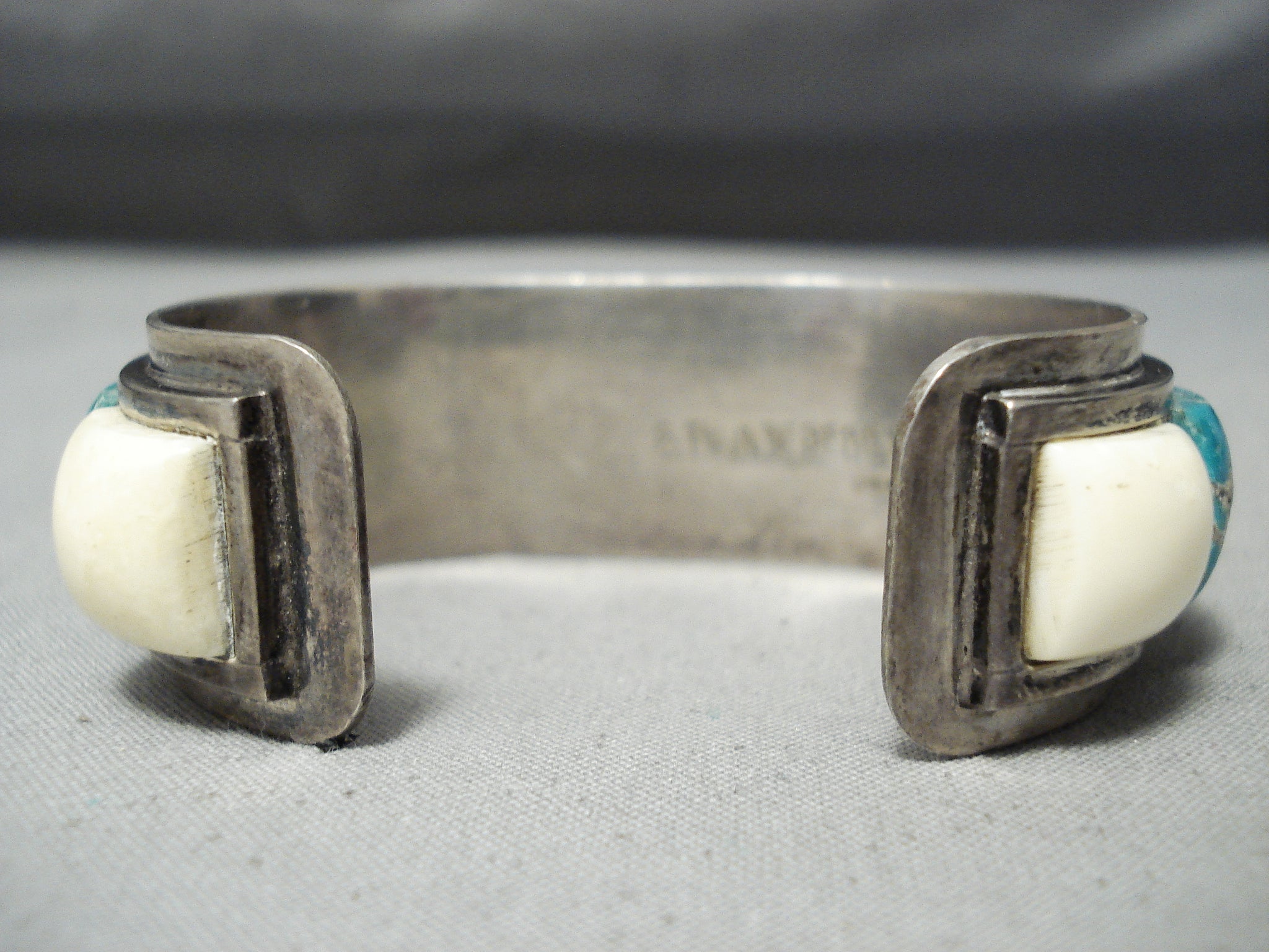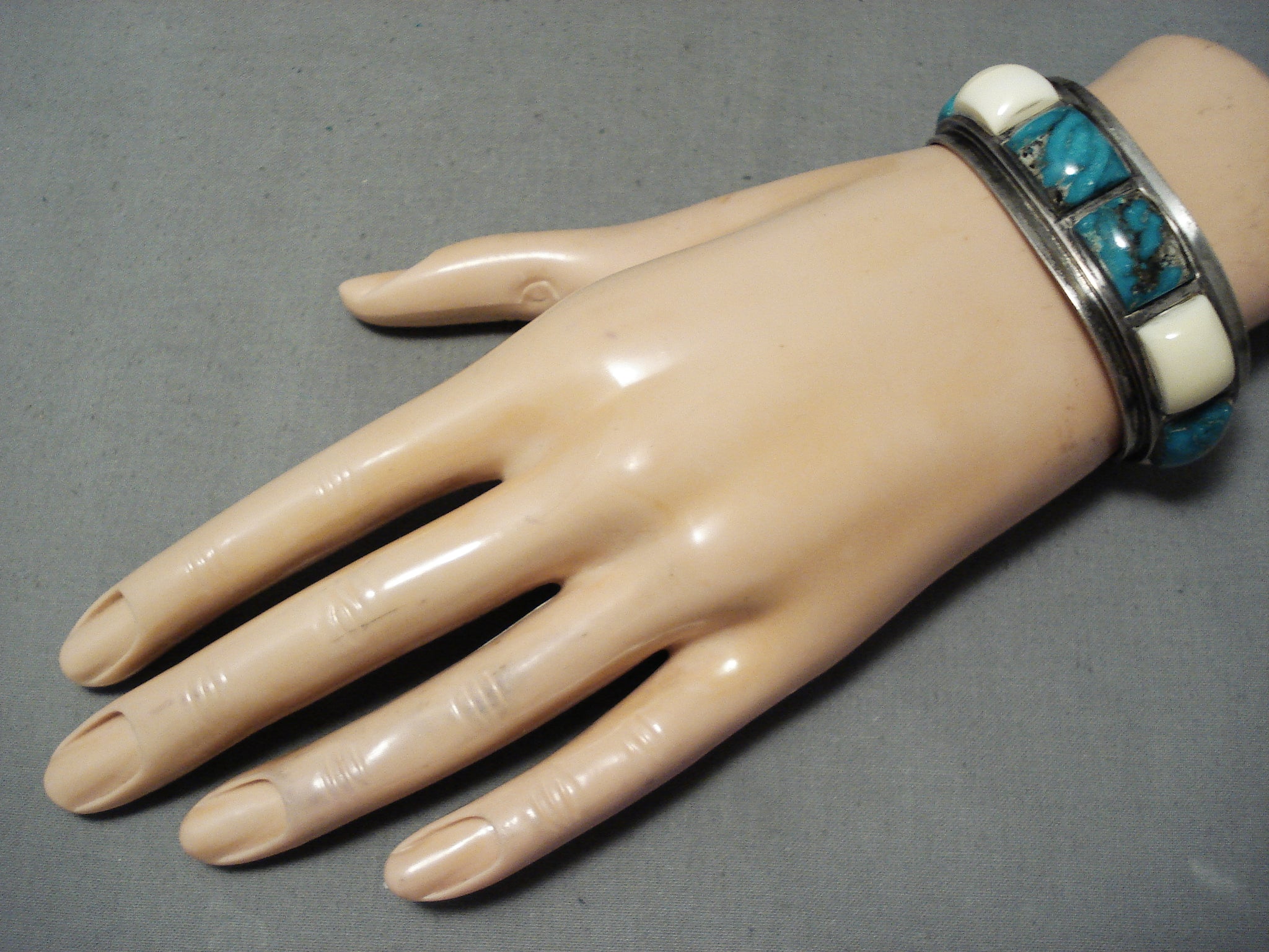 This is a wonderful vintage Navajo inlaid silver bracelet. This amazing piece contains thick and bubble like square shaped stones that protrude out from the thick and sturdy cuff. This bracelet consists of four impeccable Blue Diamond turquoise stones with four accenting white shells. This bracelet contains beautiful old natural patina. The stones measure around 5/8" x 1/2". The width of the bracelet measures around 7/8". Signed by Navajo artist, G. Thunderfoot . Sterling silver. Cir. 1970's+. The inside end to end measures around 5-1/4" with an additional 1" gap. Sturdy 59 grams.
