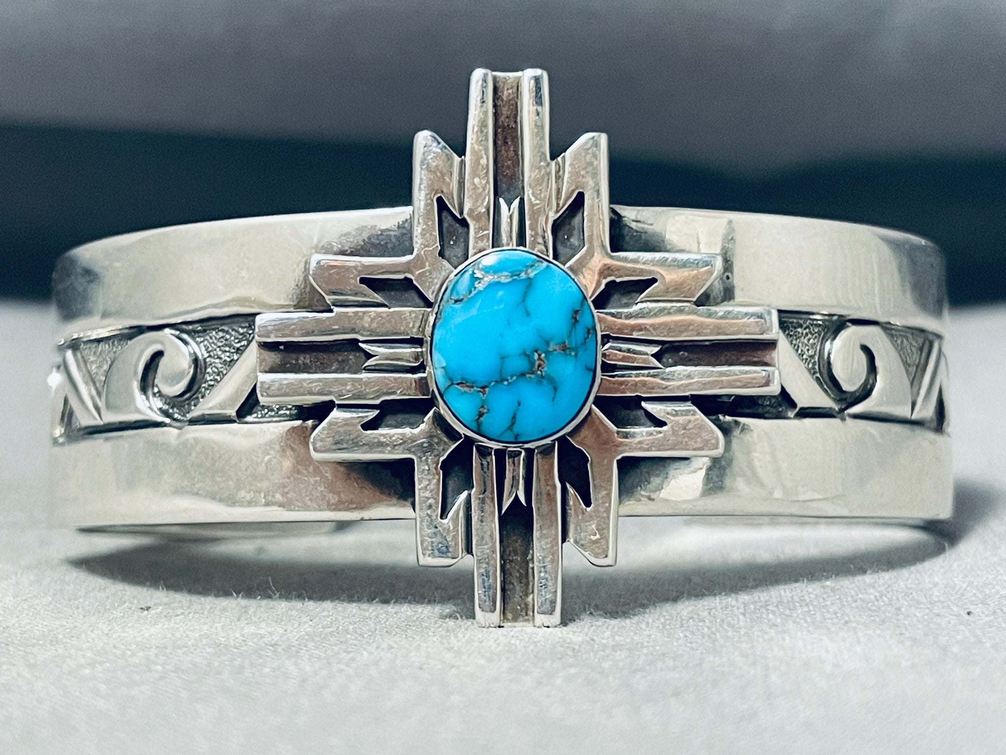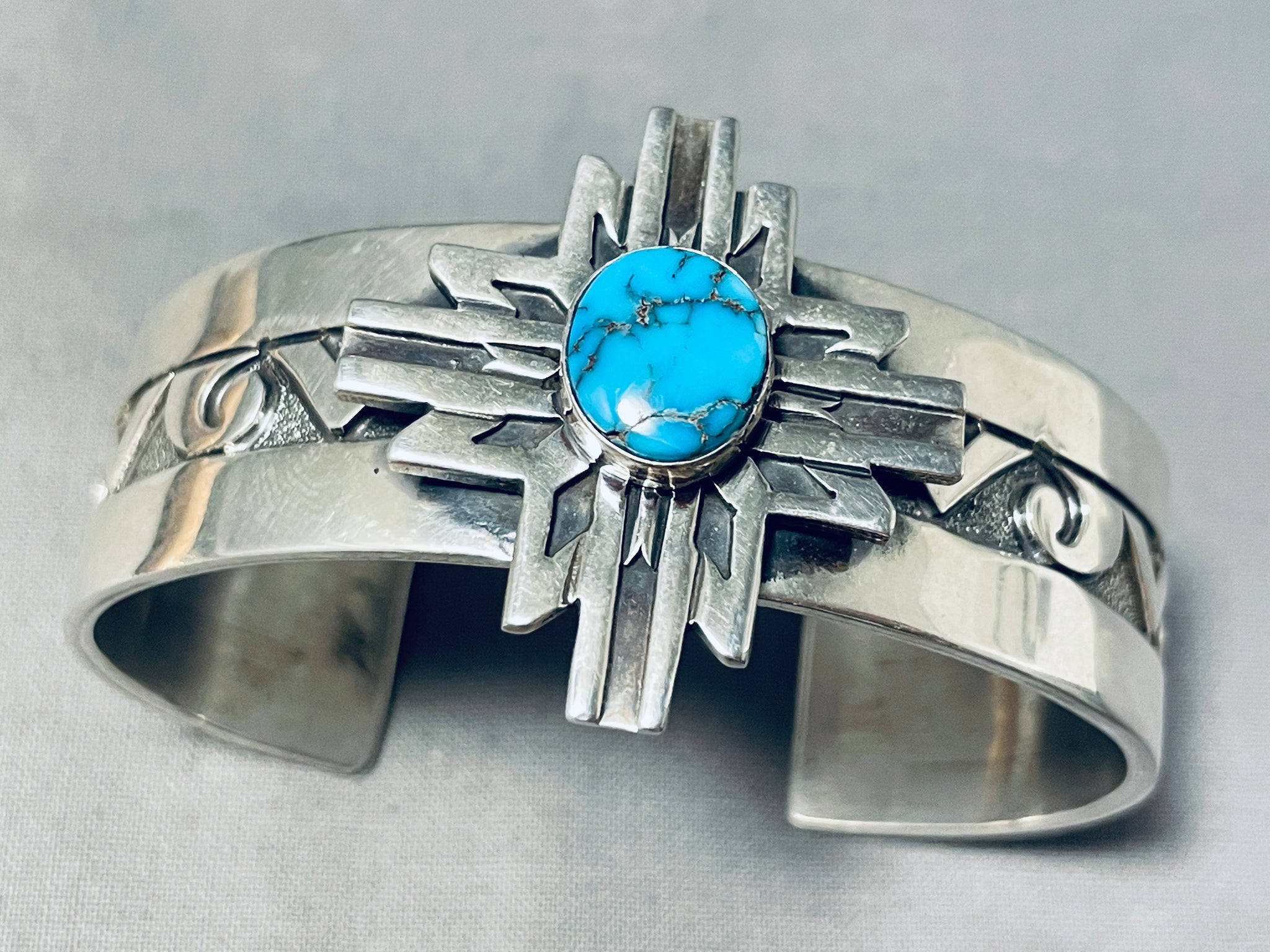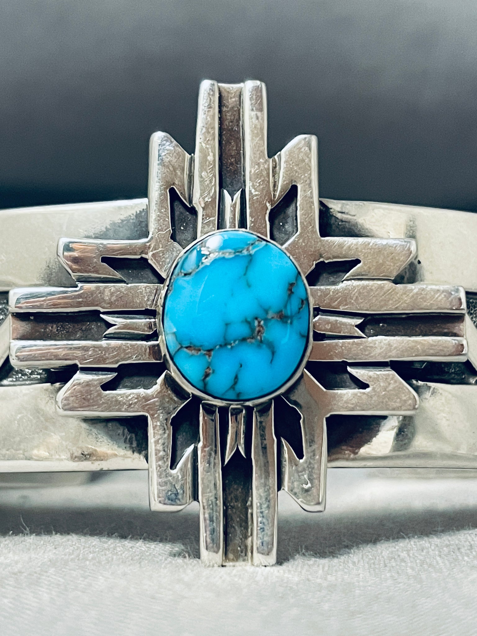 Heavy Signed Native American Navajo Zia Turquoise Sterling Silver Bracelet Cuff
