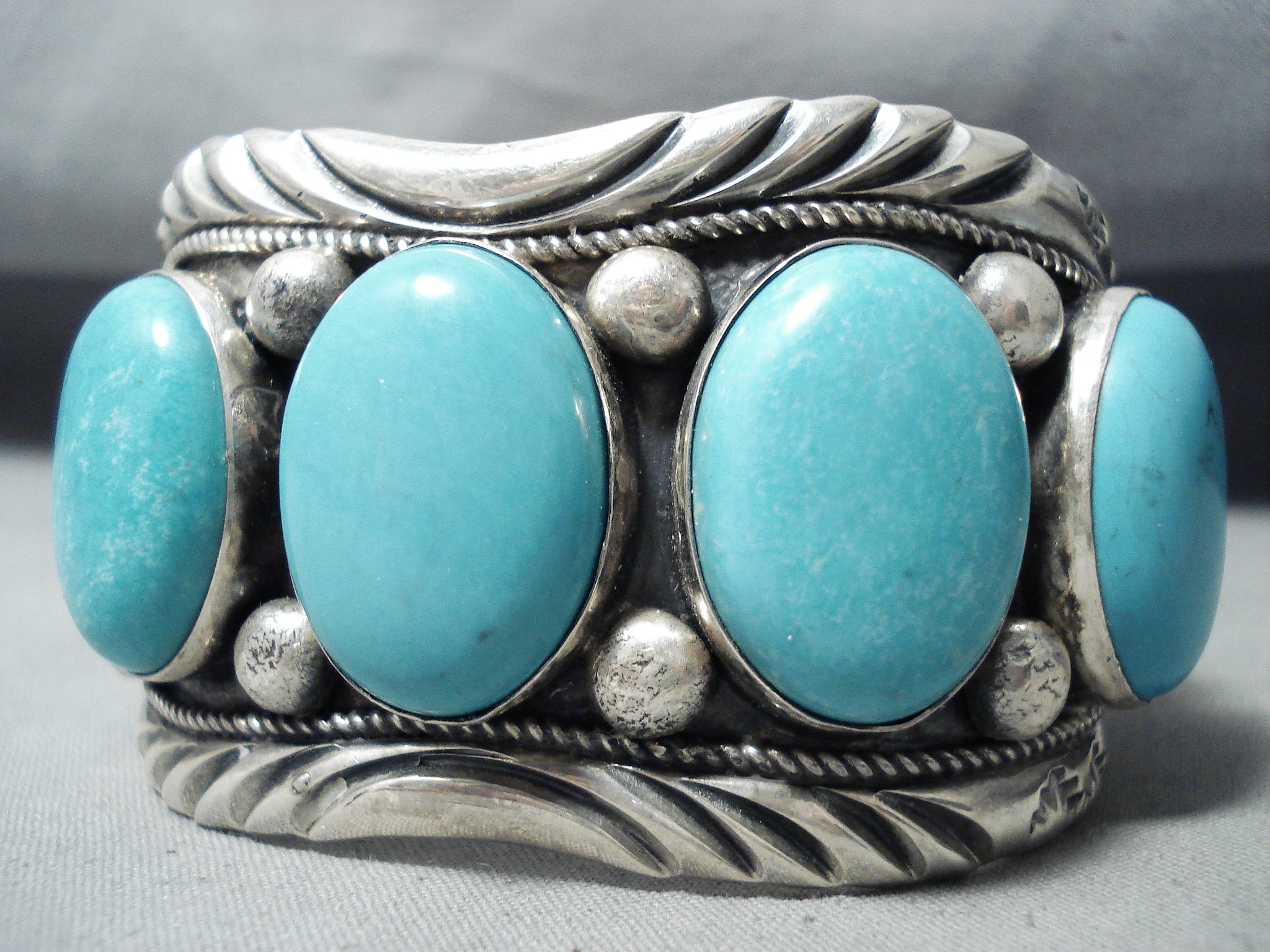 Up for sale is this remarkable vintage Navajo silver bracelet having 5 turquoise ovals, dual silver beads, silver rope and handcarved silver borders on a handcarved solid silver cuff with silver fans at the terminal ends! Truly Exceptional Piece! The stones measure around 1" x 3/4". The width of the bracelet measures around 1-3/4". Signed by Navajo artist, E. Etcitty. Sterling silver, marked. The inside end to end measures around 5-7/8" with an additional 1-3/8" gap. Sturdy 120 grams.