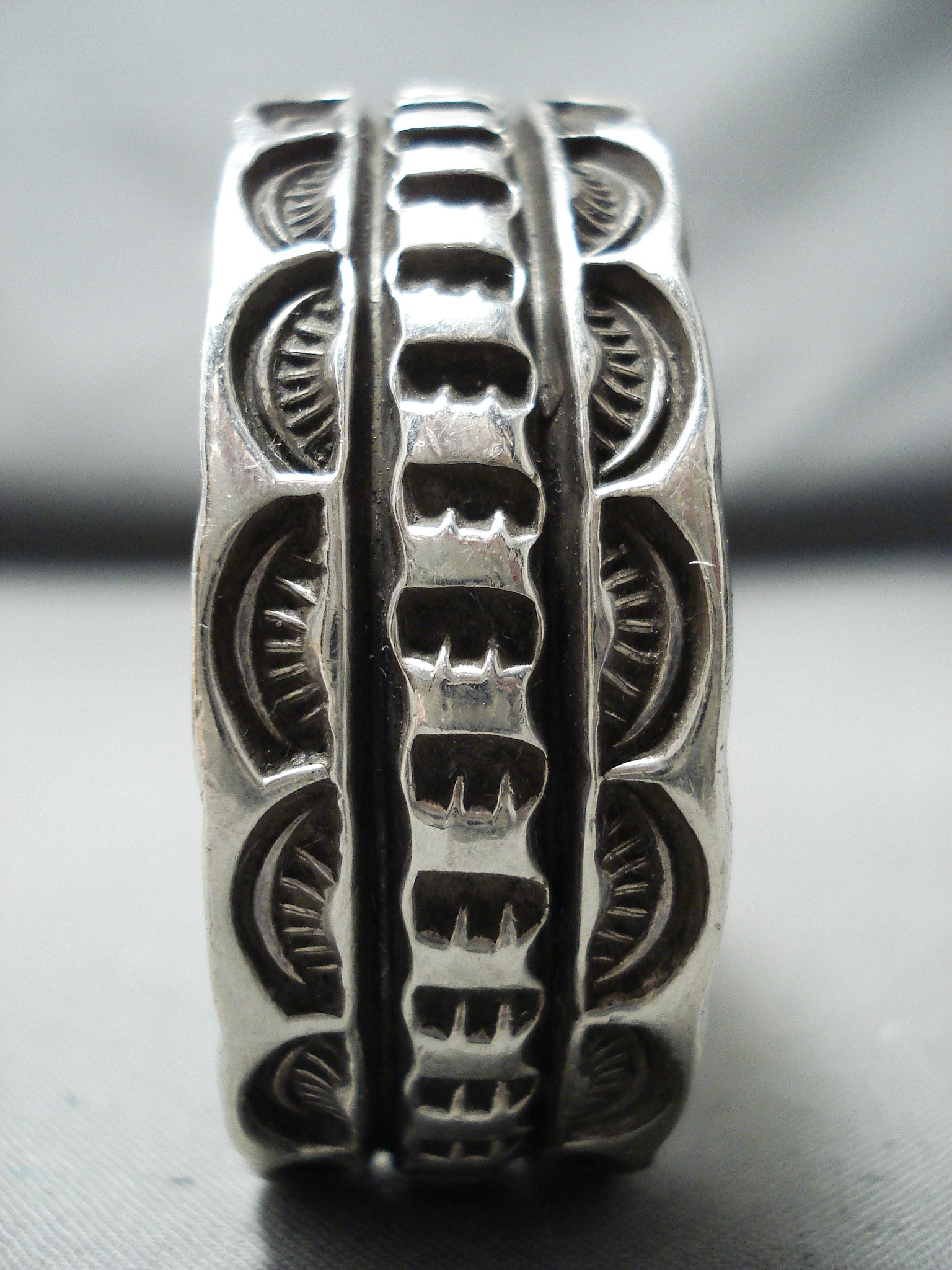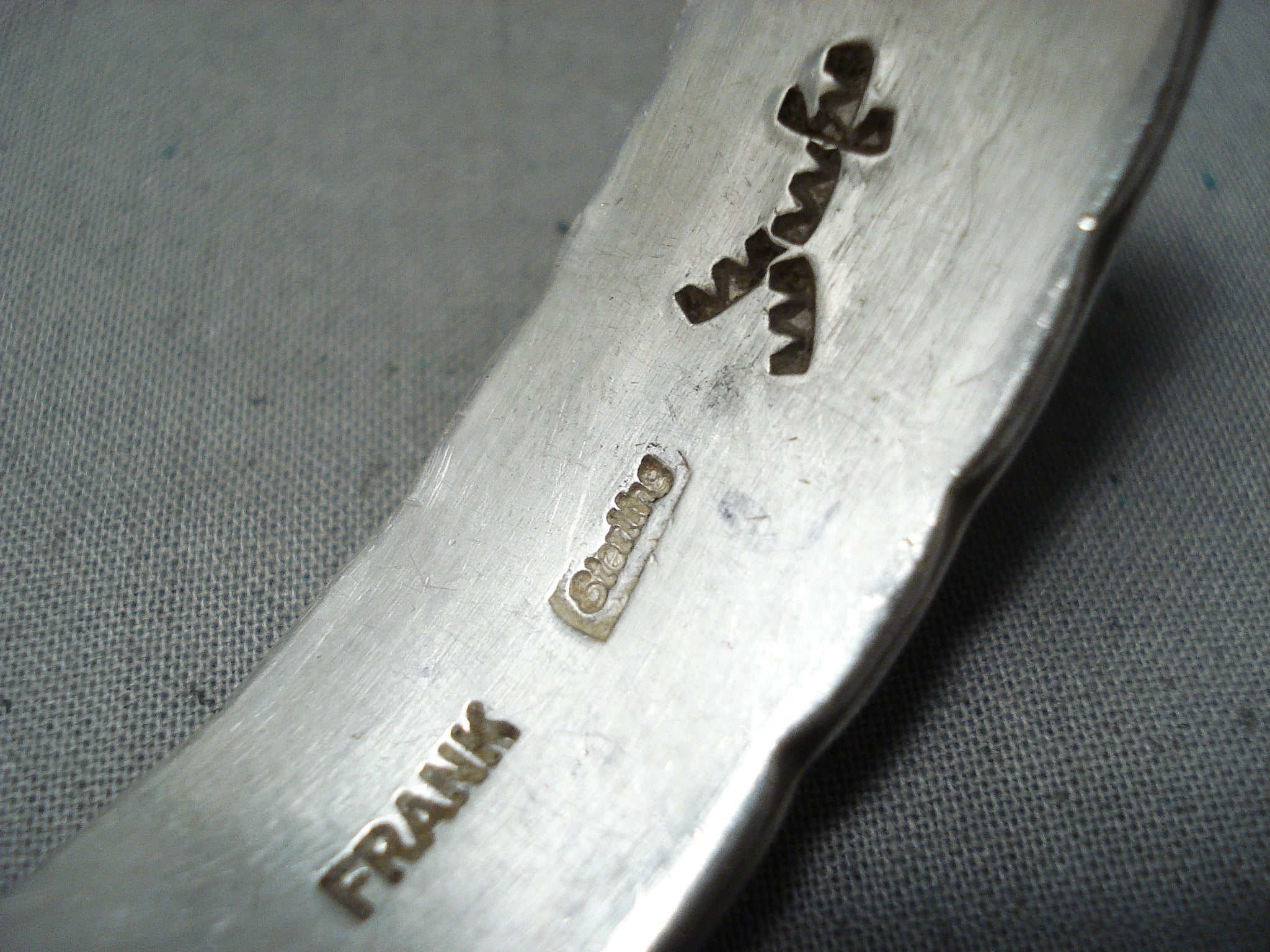 Up for sale is this fabulous vintage Navajo bracelet featuring handcarved and handstamped silver rug designs on a solid silver cuff! Truly Terrific! The width of the bracelet measures around 3/4". Signed by Navajo artist, J. Frank. Sterling silver, marked. The inside end to end measures around 5-3/4" with an additional 1-1/4" gap. Sturdy 73 grams.