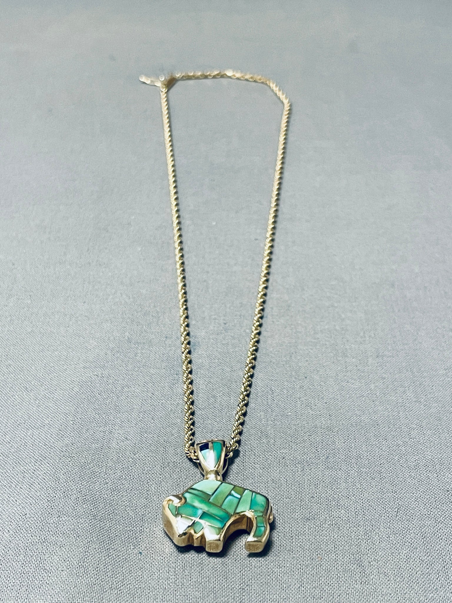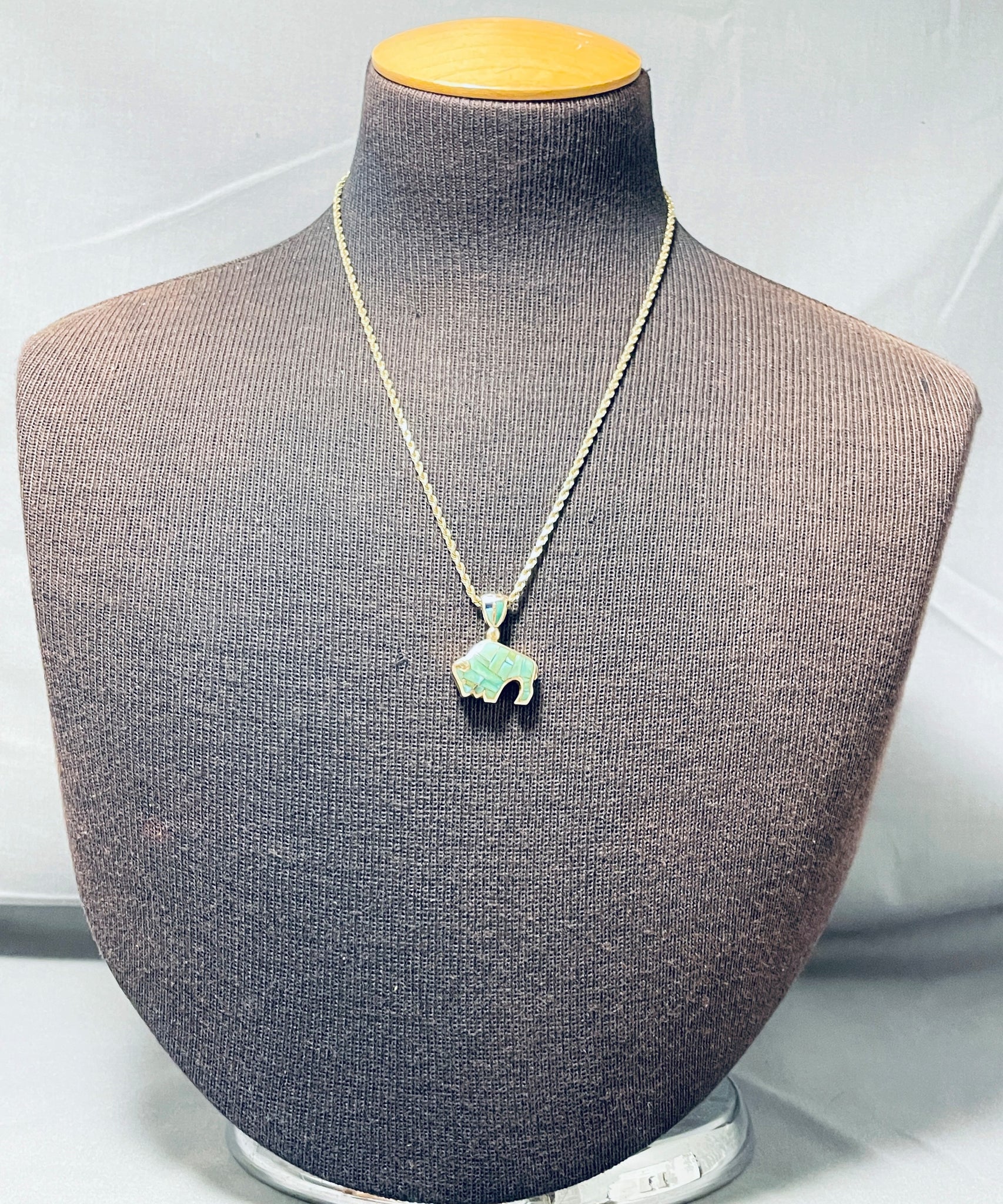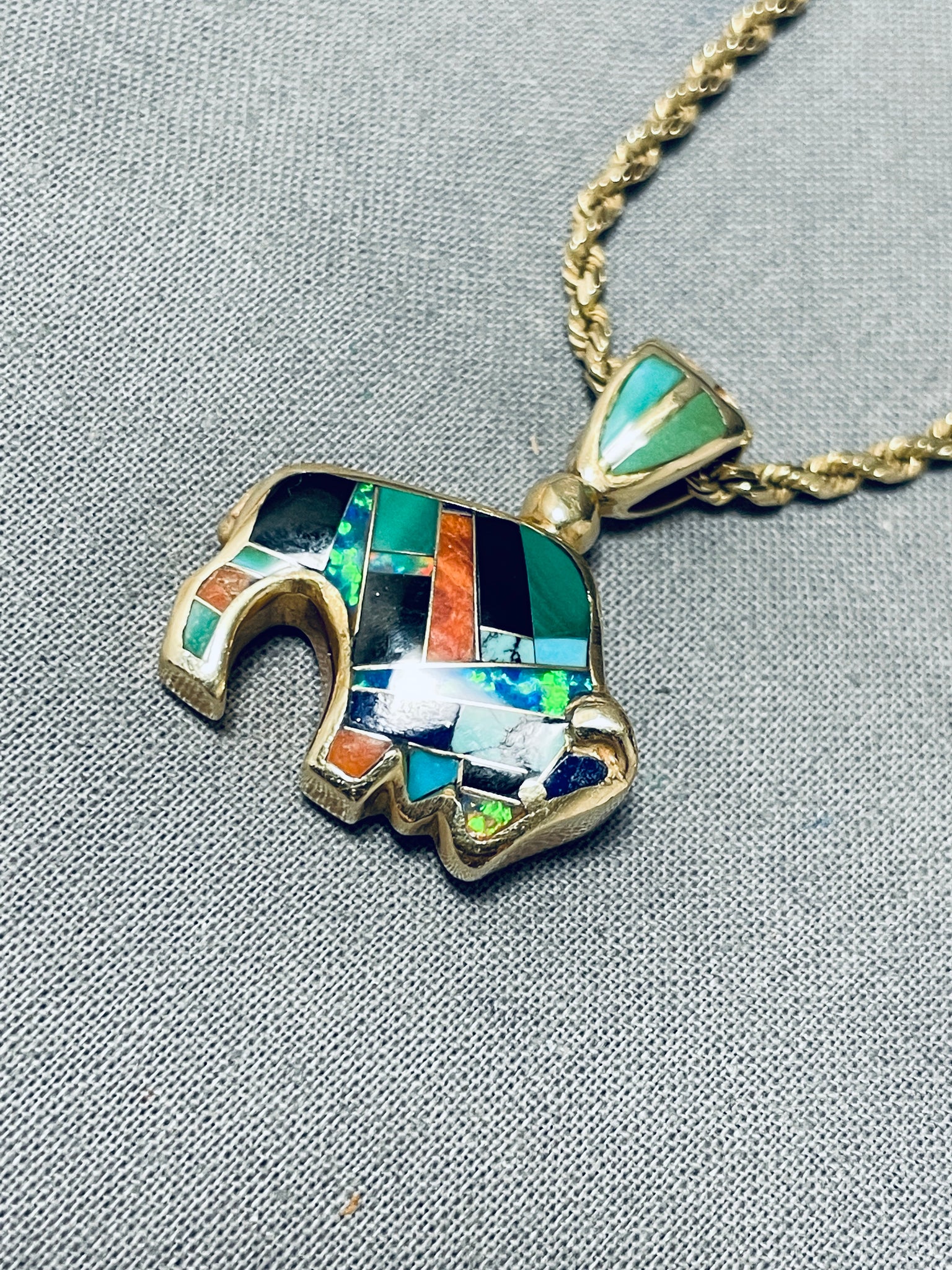 This is an astonishing Navajo inlaid buffalo pendant all 14k gold necklace. This remarkable necklace is comprised of solid 14k gold including the pendant and chain, JUST WOW! The inlaid buffalo pendant is reversible and measures around 1-1/8" X 7/8" including the inlaid bail. It is very unique and rare to find bails to even be inlaid. The intricacy and detailing on this necklace is just mind blowing. The inlay includes opal, coral, onyx, malachite, turquoise and lapis. The gold chain is sturdy a unique beautiful clasp. 14k gold. Cir. 1980's+. The length of the necklace measures around 19-1/2". Sturdy 17 grams.