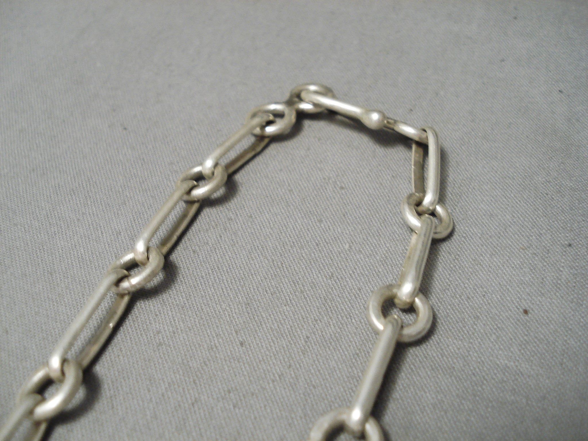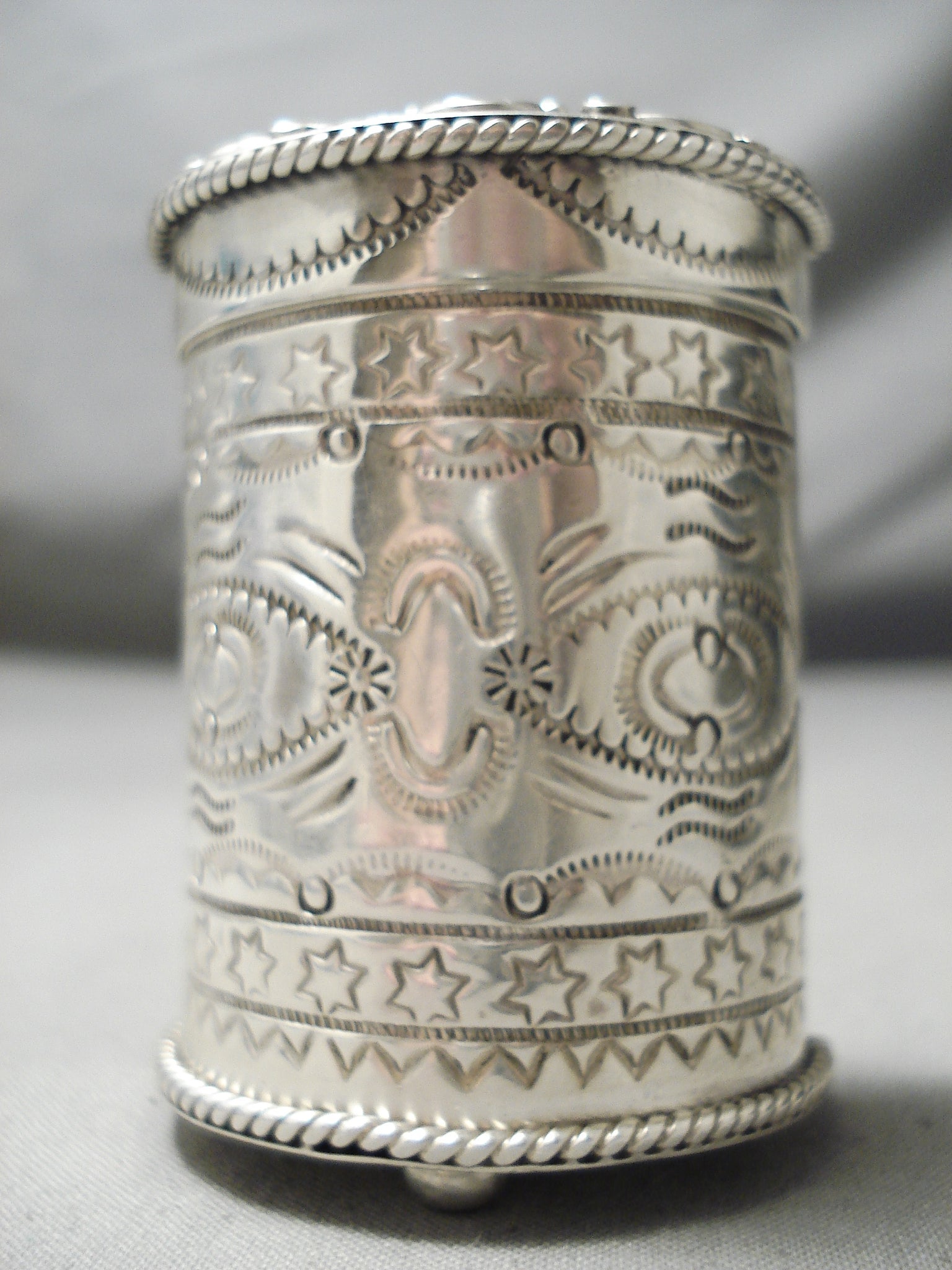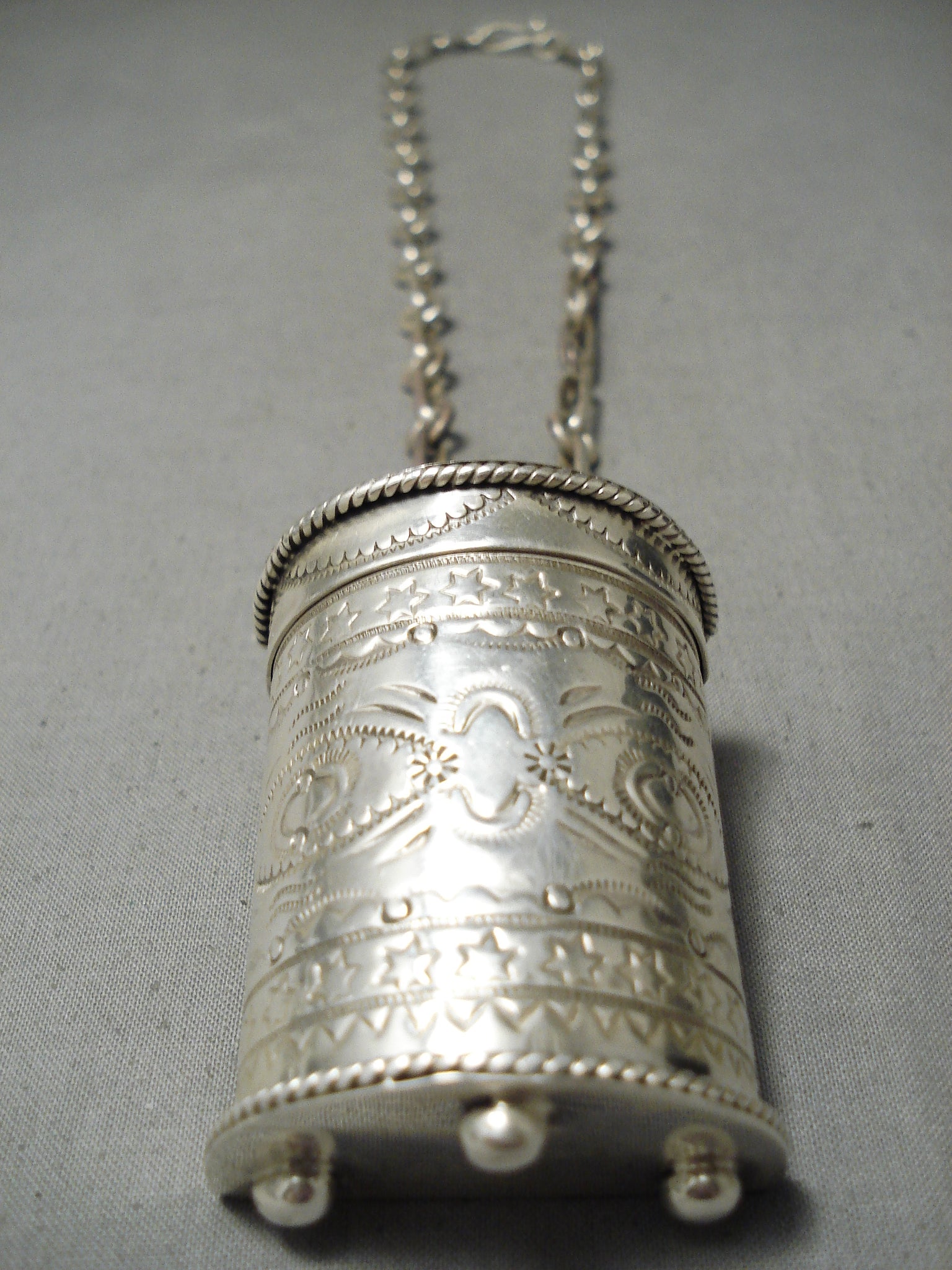 An exceptional vintage Navajo necklace with pill box pendant. This is quite the fantastic 2-3/8” x 1-3/4” ornately handstamped pill box or trinket box – with thick 24” link chain! It has a beautiful lid – neatly decorated with silver appliques. The box is a half-moon shape and is about 3/4” deep and has a bail opening of about 3/8”. Sterling silver, marked. Signed by Navajo artist, Ben Begaye. Sturdy 106 grams.