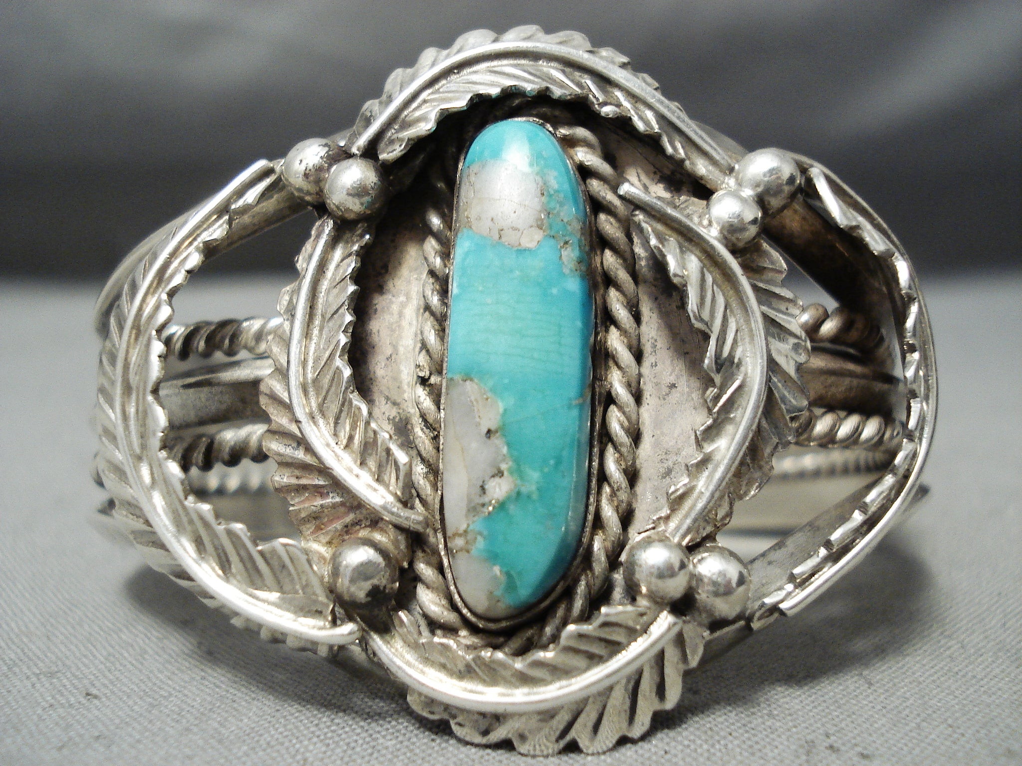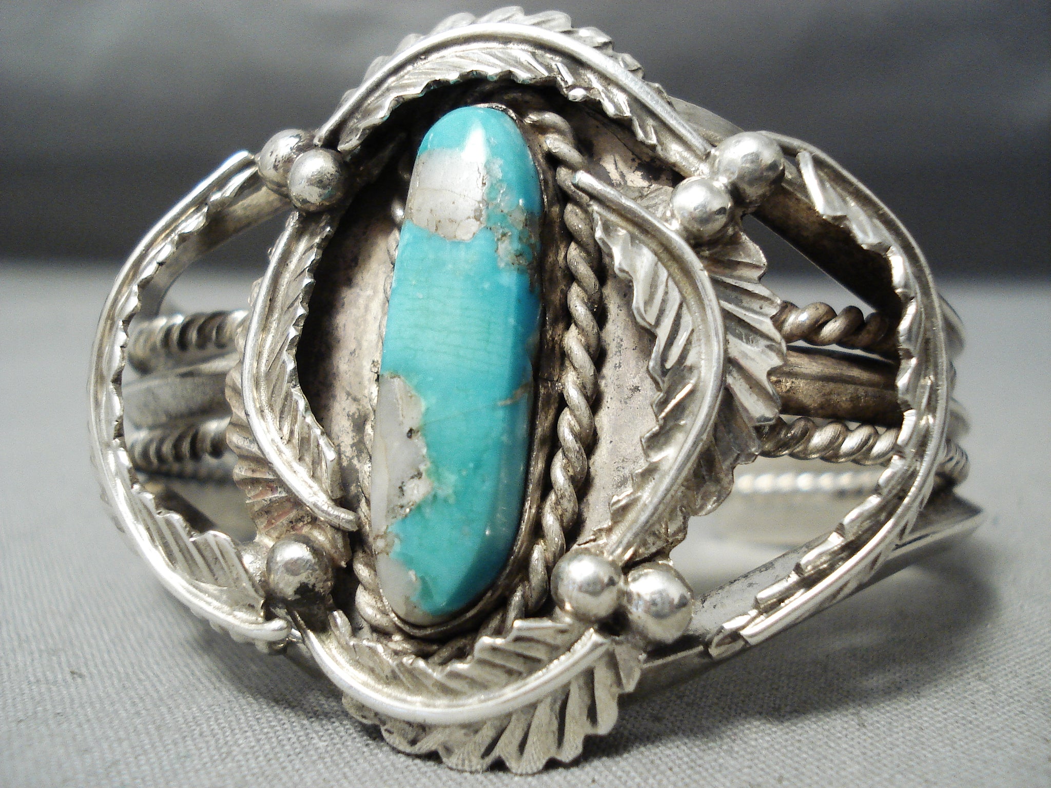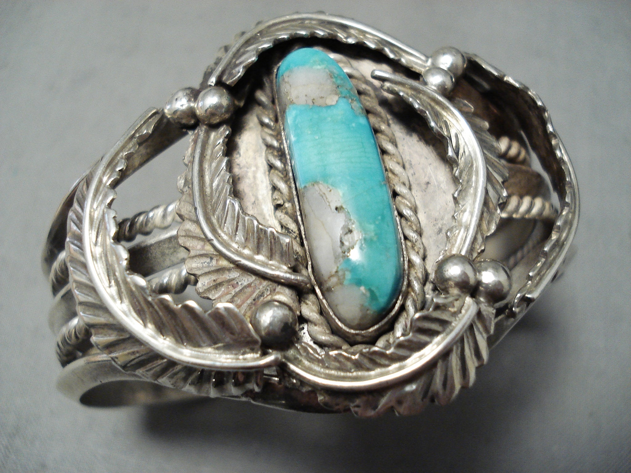 Heavy Thick Vintage Native American Navajo Gilbert Turquoise Sterling Silver Leaf Bracelet Old