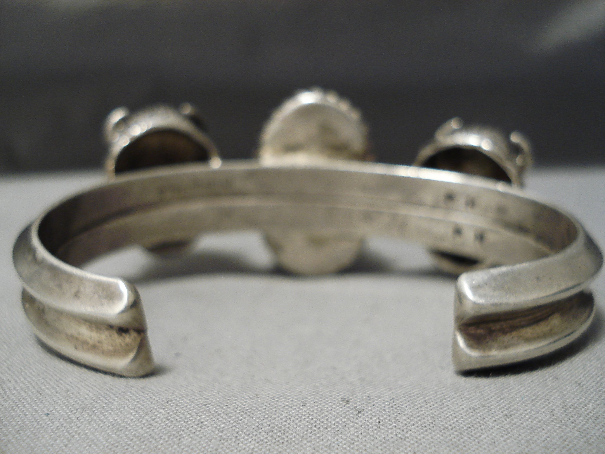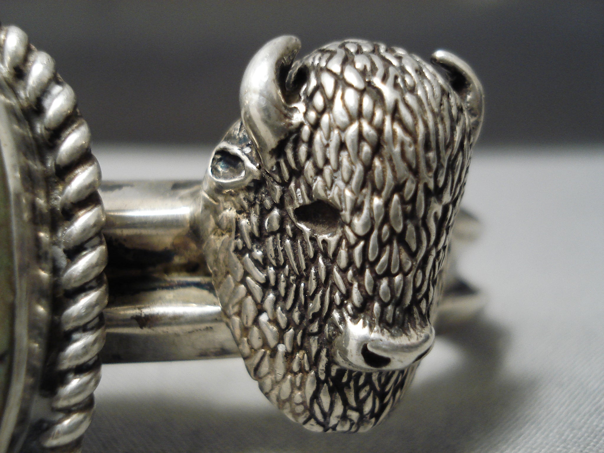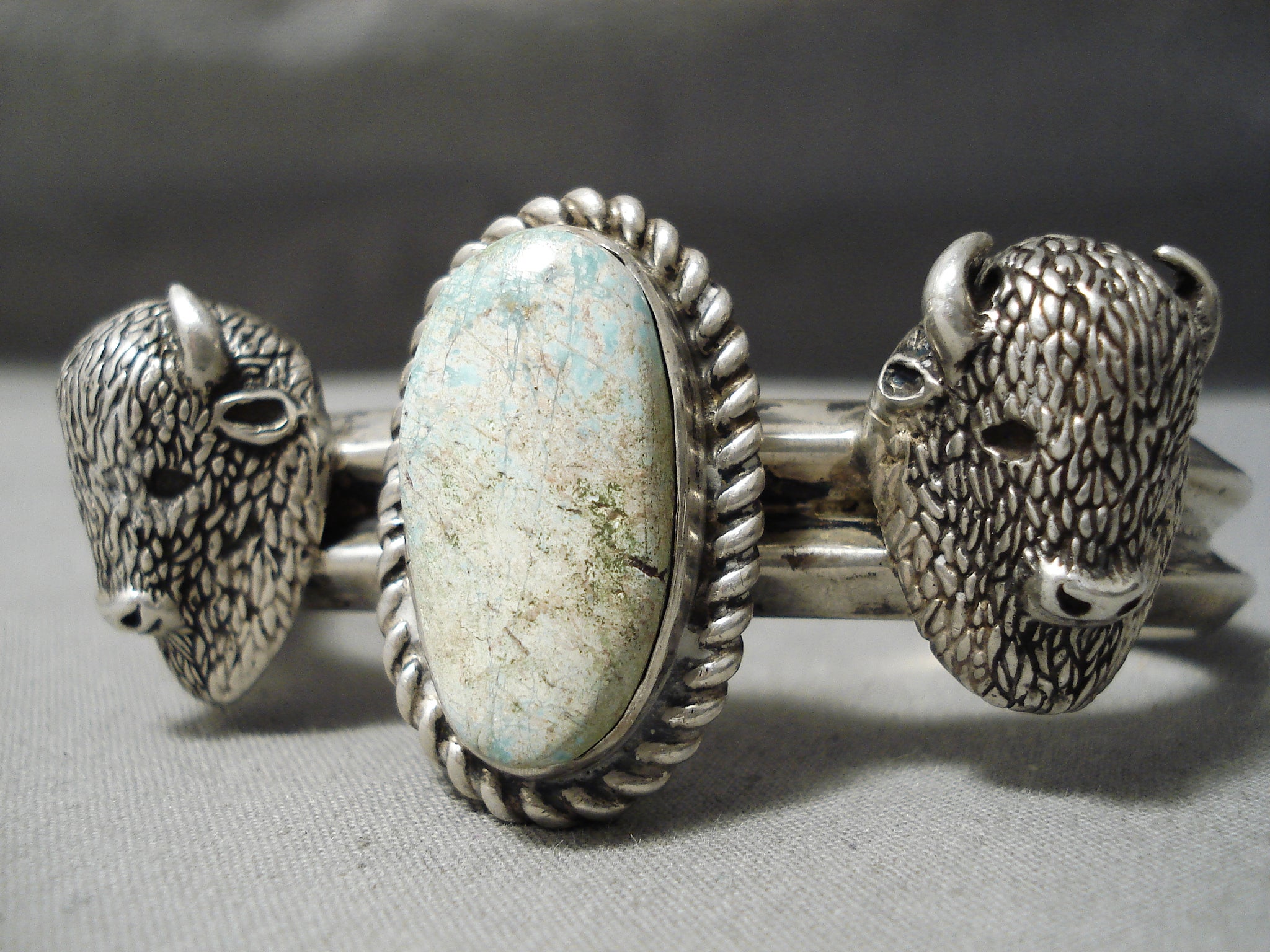 This is a remarkable vintage Navajo single stone buffalo silver bracelet. This piece is extremely heavy with a ebautiful center rare Number 8 turquoise stone. Surrounding the stone is a thick silver rope. Accenting both sides of the stone are two impeccable hand carved large silver buffalo heads that each measure around 1" X 3/4". This bracelet is so heavy and thick, definitely not light and flimsy with a double silver shank cuff. The center stone measures around 1-1/8" x 3/4". The width of the bracelet measures around 1/2". Signed by Navajo artist, Paul Hatch . Sterling silver, marked. Cir. 1960's+. The inside end to end measures around 5-3/4" with an additional 1-1/4" gap. Sturdy 95 grams.