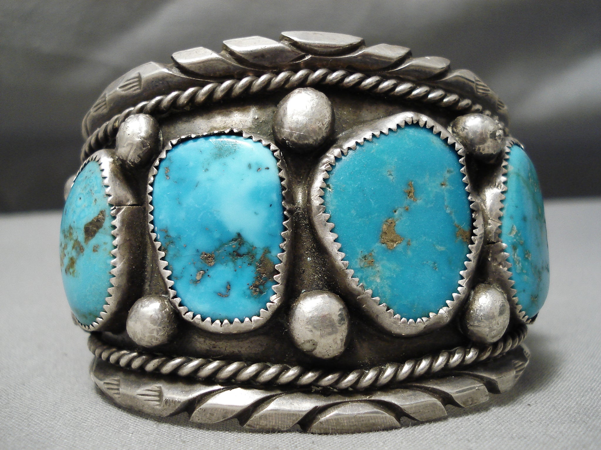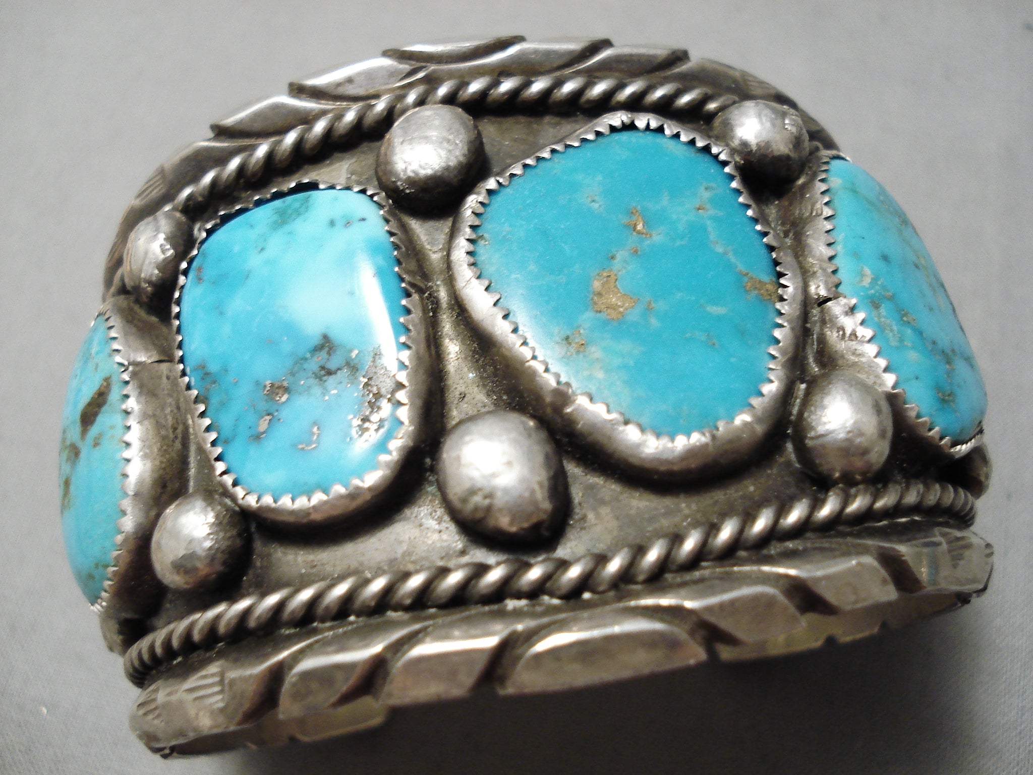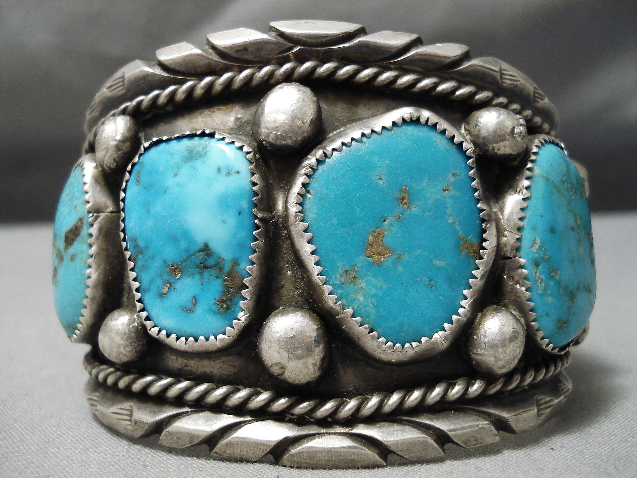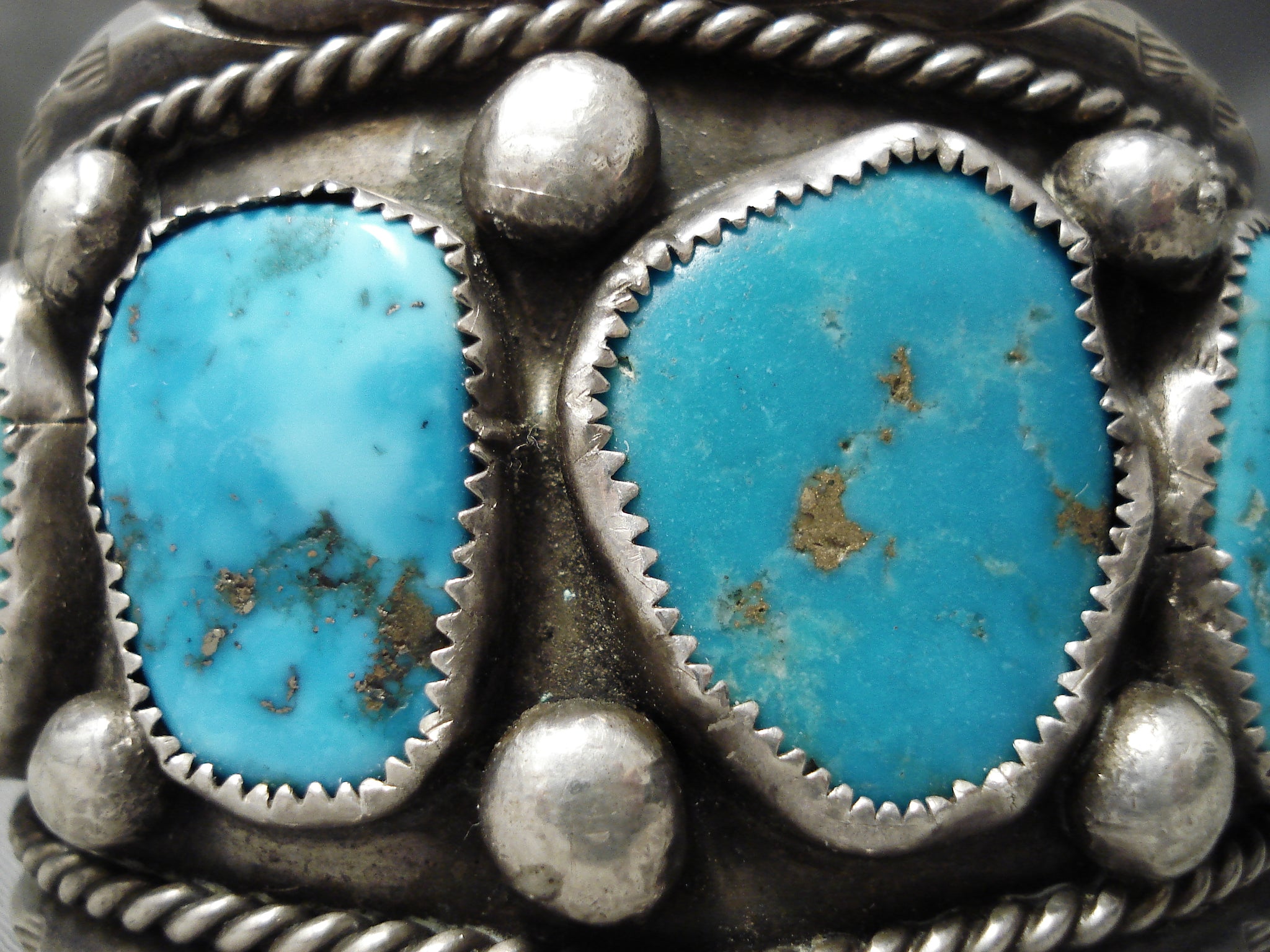 Heavy Thick Vintage Native American Navajo Turquoise Nugget Sterling Silver Bracelet Old